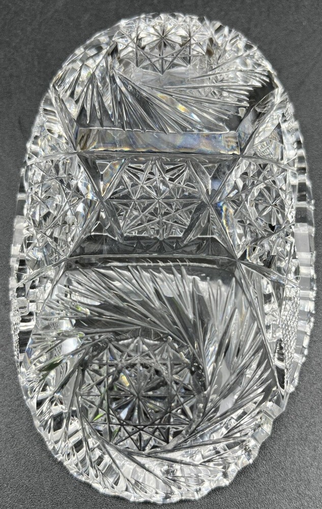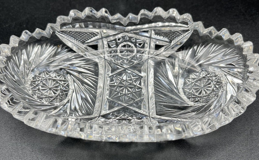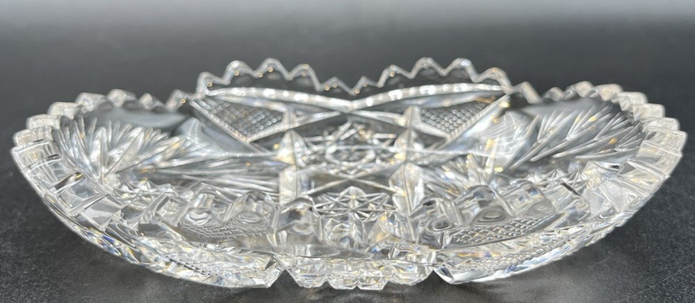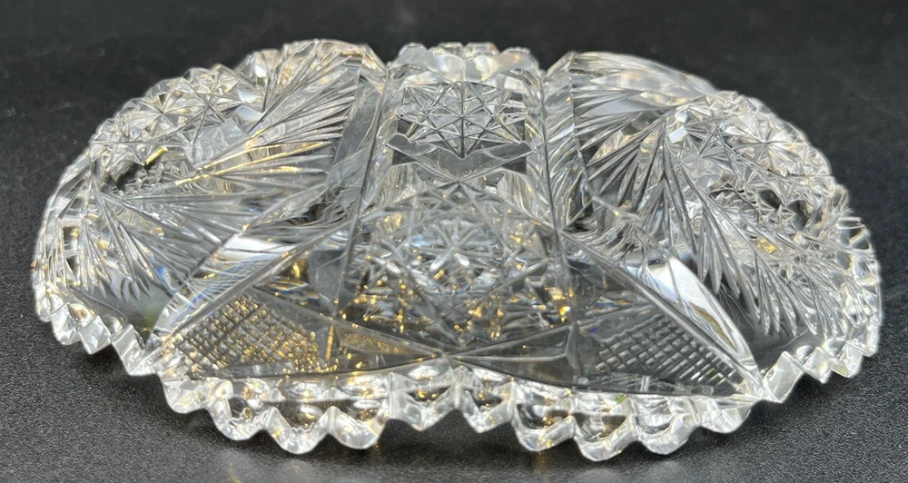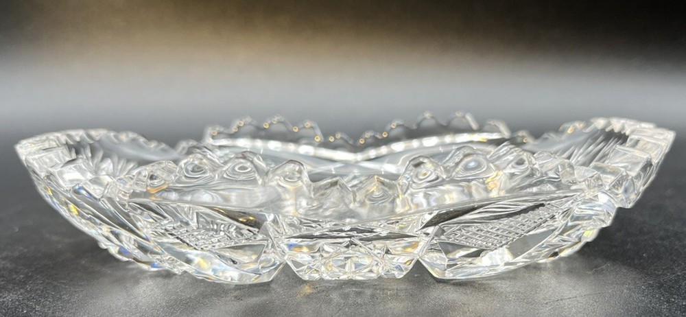 This antique American Brilliant Period (ABP) candy dish is a beautiful oval bonbon dish made of hand-cut crystal. Produced in the United States between 1900-1919, this decorative piece features a single compartment and measures 4.75 inches in length, 2.75 inches in width, and 1 inch in height. The dish has a clear color with a glossy finish, showcasing intricate cut glass detailing that exemplifies the American Brilliant pattern. This vintage candy dish is a unique and elegant addition to any collection of decorative serveware. Very minor chipping on the sawtooth edges.