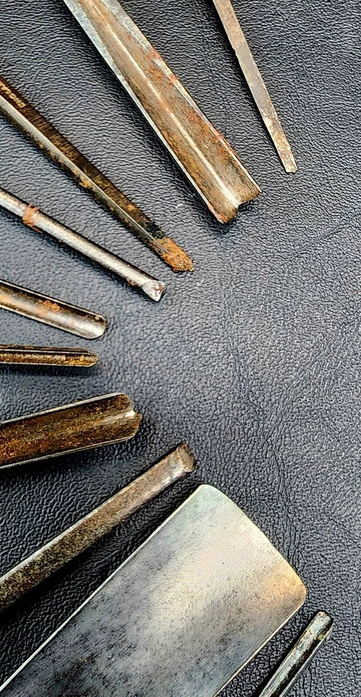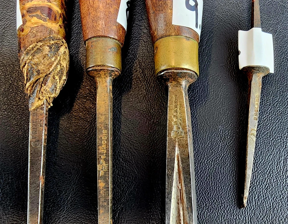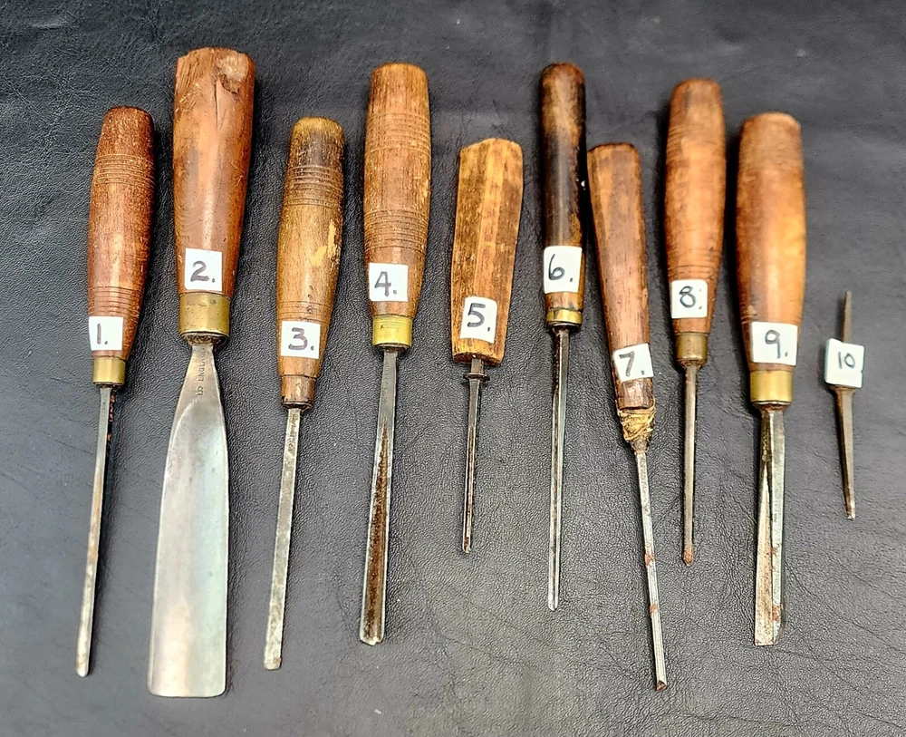 Antique ADDIS Carving Chisels x 10 pieces by mixed family makers. I have 1 x J.B.ADDIS Junior listed also. Combined postage available. Important: SEE POSTAGE DETAILS BELOW Details of each chisel is listed below, I have done my best to describe them, however some markings are hard to read so there is NO guarantee that all information is 100% correct. 1 PS.J ADDIS Gouge Marked 4. L. 210mm 8” Cutting Edge 4mm 3/16 th 2. PS.J ADDIS Gough Marked 5 L.235mm 9” Cutting Edge 26mm 1” NOTE: Handle has damage but is solid and usable. Easy Repair 3. PS. ADDIS Flat cut Marked 3 L 200mm 8” Cutting Edge 5mm ¼” 4. PS.J Addis V cut Marked 39 L210mm 8 ½” 5. PS.J ADDIS V Cut Marked 11 L 150mm ( Needs new Handle) 6. J.B ADDIS & Sons Gouge Marked ?, “Prize Medals” L 200mm 8” width at cutting edge 5mm 7. J.B. Addis Flat Cut Marked 9 “Prize Medals” L 195mm 7 ¾” width at cutting edge 3.5mm. Handle has been repaired, but quite solid 8. ?? ADDIS V Cut Marked 39 L 190mm 7 ½” (Hard to read first initials) 9. S.J ADDIS Tip broken off, handle in VGC. P.S.J ADDIS Small flat cut NO HANDLE Postage: I have a ADDIS Junior chisel listed separately, should you purchase that one, it can be included with this lot at no extra charge saving 1 x shipping fee. Note that Australia Post only insure the parcel for AUD $100 should you require extra insurance it is $4 aud per $100aud