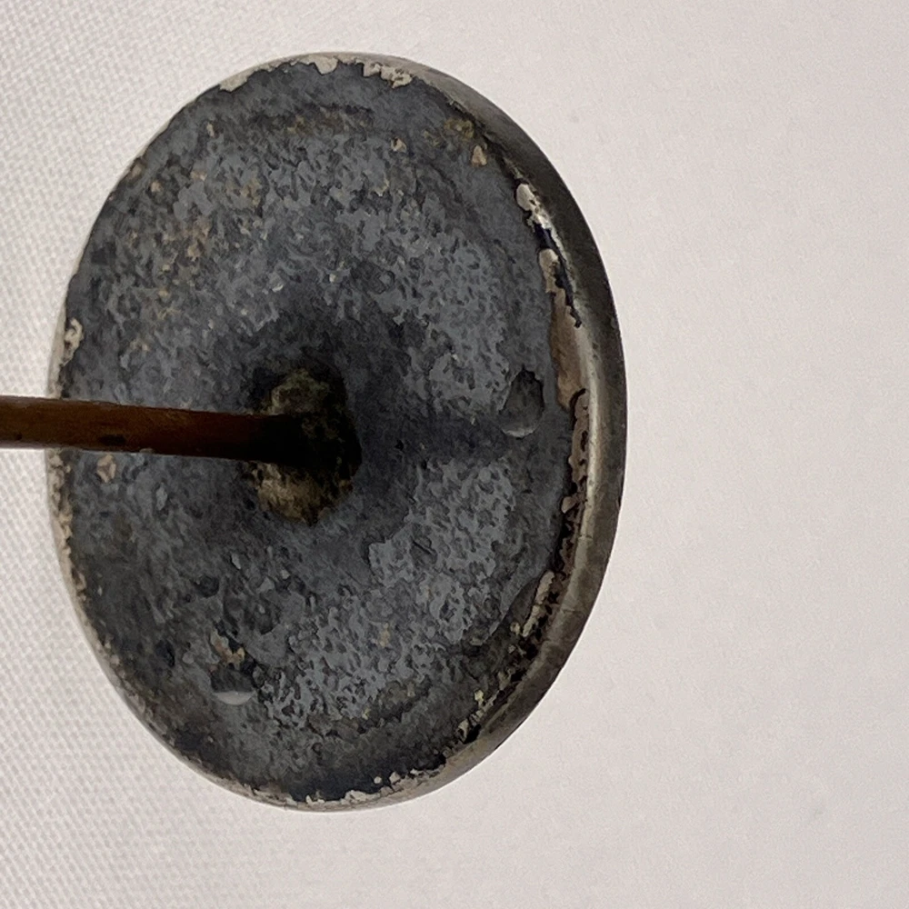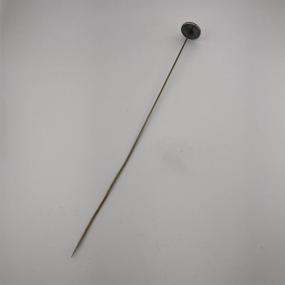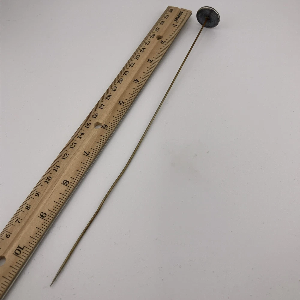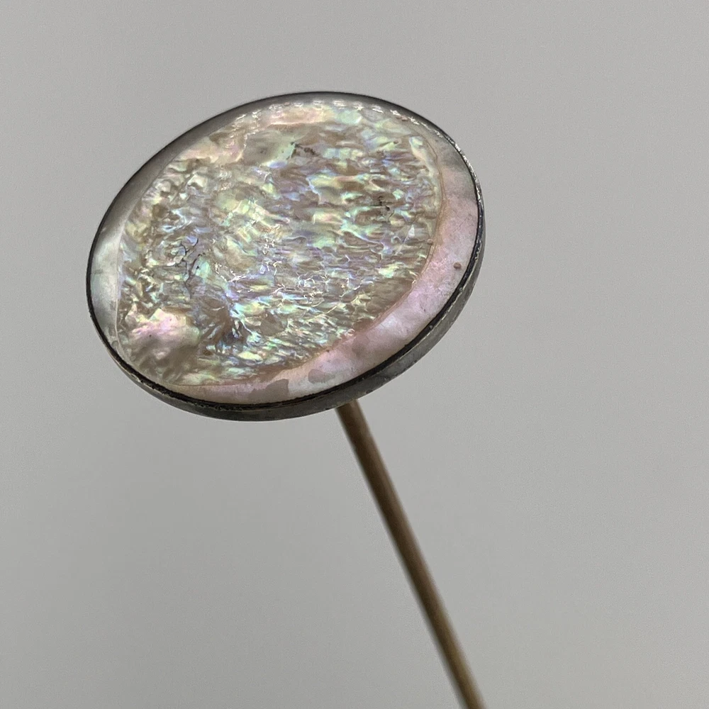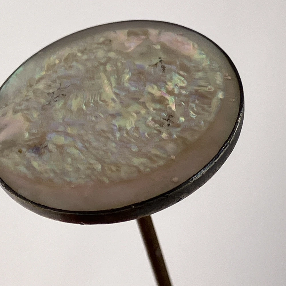 Antique hat pin with flat disc pinhead made of abalone or other mother-of-pearl-like shell set in a silver-tone metal (possibly silver, not marked). Pin is a little over 10 inches long. In very good condition -- see pictures. Will ship USPS, well packed, within 2 days. See my eBay store for lots more interesting vintage items. I offer discounts for combined shipping. Thanks for looking!
