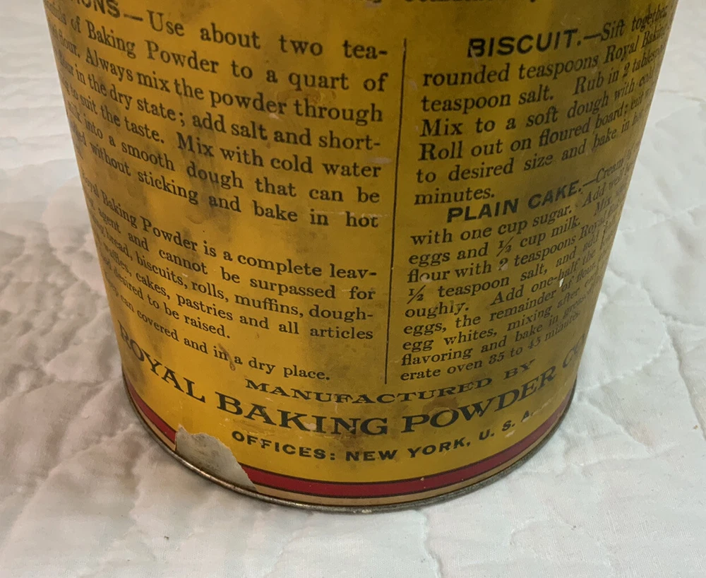 Up for sale is an antique advertising tin. Royal Baking Power, absolutely pure. Five pound size. The top has written: Full Weight 5 lbs. Royal Baking Power Absolutely Pure. Paper label applied to the tin can. Original. The colors are red, gold, yellow, black. Some of the paper has peeled away, scratched. But, not too bad. The back has recipes. Manufactured in NY. USA. I could not easily get top off. Refer to all pictures as they are part of the description of this item. No major dents. Measures 8 1/4” tall by 6 1/2” round diameter. Antique tin from the late 1800’s era. This is one of a large collection just purchased of an antique country store collection of antique tins. Made in USA. Thanks and happy bidding. I will combine shipping charges. Smoke free home. Please make payment in three days. ~~~~🌻🌷🌺Please visit my eBay store: 🇺🇸webbsamericancountry1🇺🇸 for over 2000 vintage and collectible items.~~~~🌹🌻🌷
