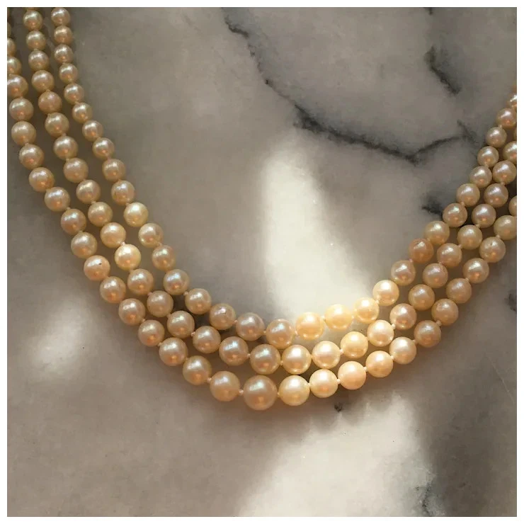 A unique antique Diamond and natural unheated blue Sapphire set claspon a triple row of Japanese Akoya Saltwater Pearls. Theclasp is 19th century and hand crafted from sterling silver with agold wash underside. The stylised Butterfly is unique in itsformation and has been set with natural white diamonds and a natural,untreated naturally mined blue Sapphire stone. The AkoyaSaltwater Pearls date from 1920s and recently restrung onhand-knotted silk. Natural diamonds - 1 x 4.2mm rounddiamond and 29 old mixed cut white diamonds. Natural Corundum(Deep Blue Sapphire), Round Mixed Cut, Transparent, Eye Clean, noevidence of heat treatment 4.27 x 3.36mm Pinctada Fucata(Akoya) Saltwater Cultured Pearls, round-near round, pink and greenovertones, very good lustre, 3.2mm - 8.2mm The clasp isunmarked sterling silver, tested. Length: 1.65 inches (4cm) Width: 20mm Necklace: Length (longeststrand): 19.5 inch (50 cm) Shortest strand length of pearls:17.3 inch (44cm) Shortest strand to end of clasp: 18.7 inch(48cm) Weight: 55.87g The Antique clasp is aged -the gold wash has mostly rubbed, there is a small break to thesterling silver with a small diamond deficit, unnoticeable when worndue to its location being surrounded by other diamonds. Please viewthe enlarged photographs of the area which is clearly visible on theright hand side. In addition to this, two diamonds are chipped,but still firm in settings, as are all the stones. If you have any questions, please let me know. NOTE: International delivery is DHL which is the only insurable option.