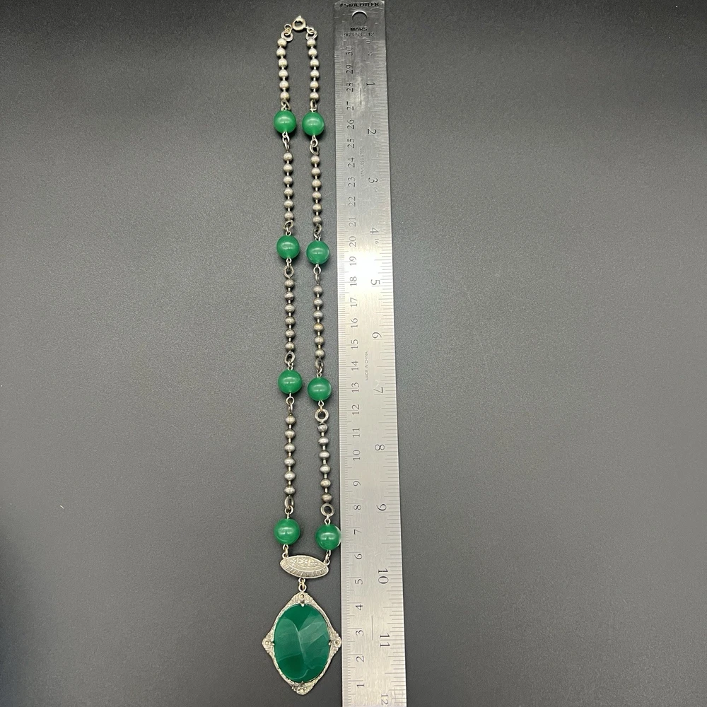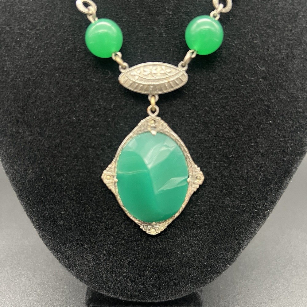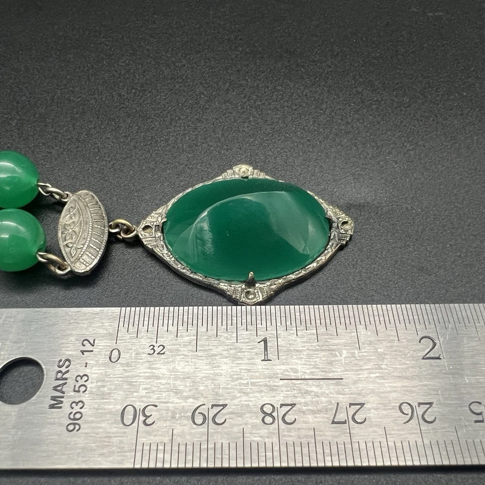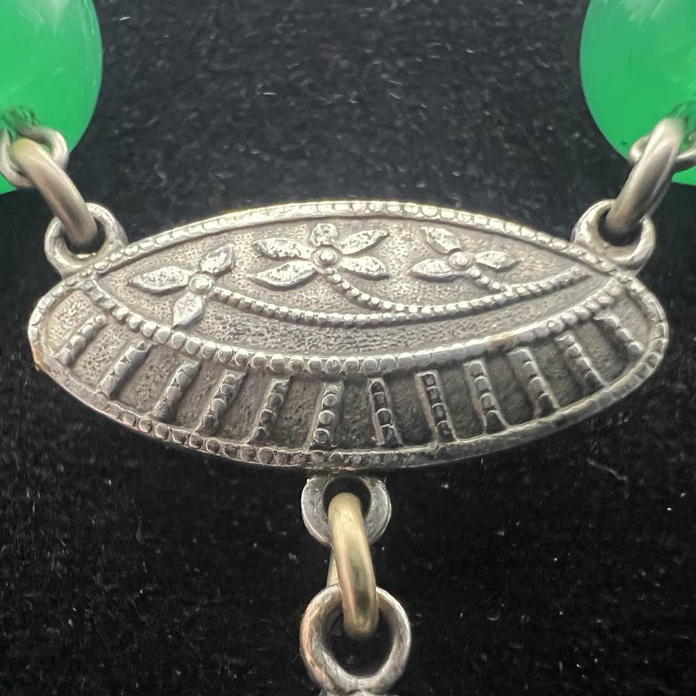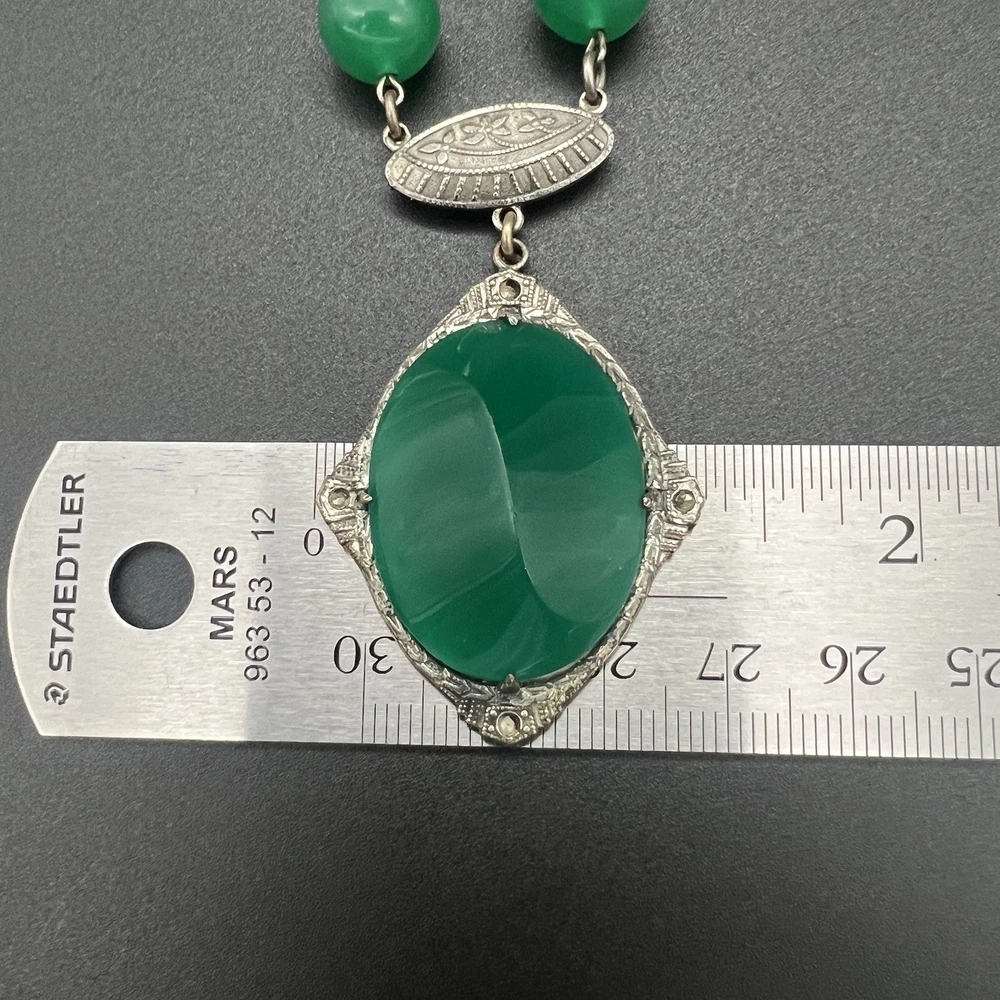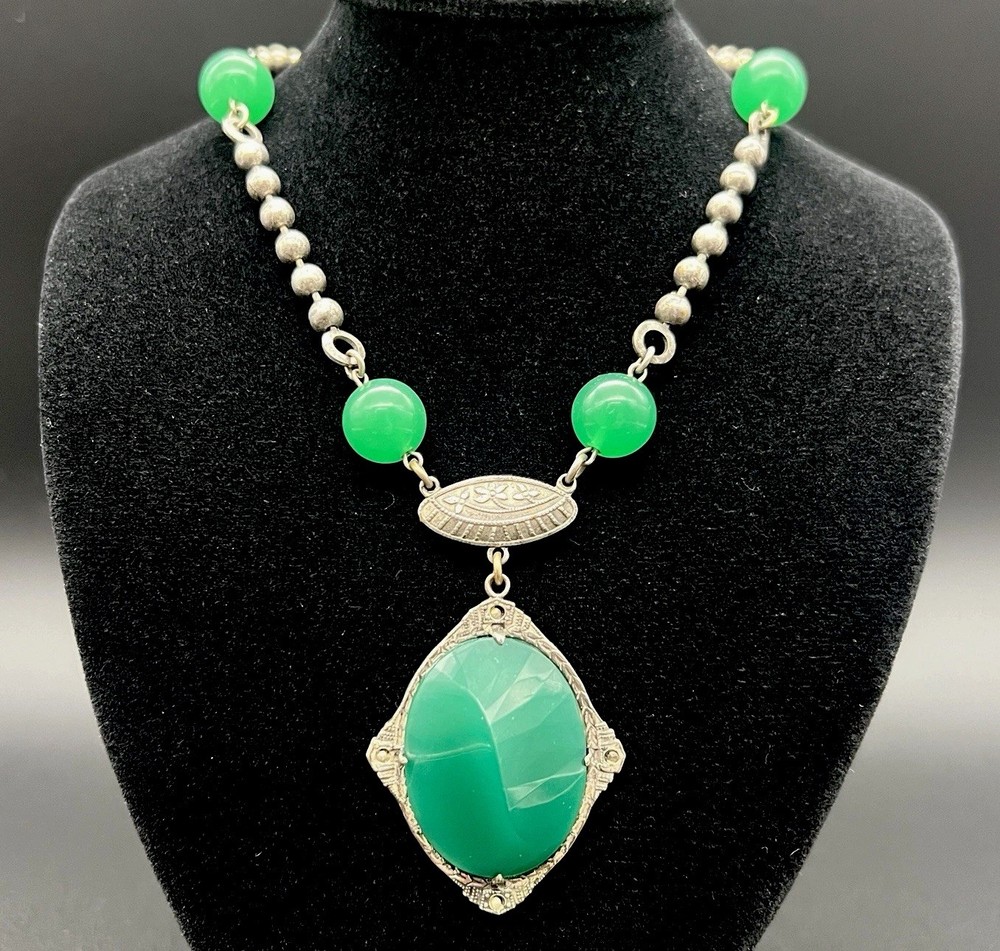 Antique Art Deco Czech Peking Glass & Filigree 24" Necklace In Jade Green. Condition is Pre-owned - Good. Shipped with USPS Ground Advantage.