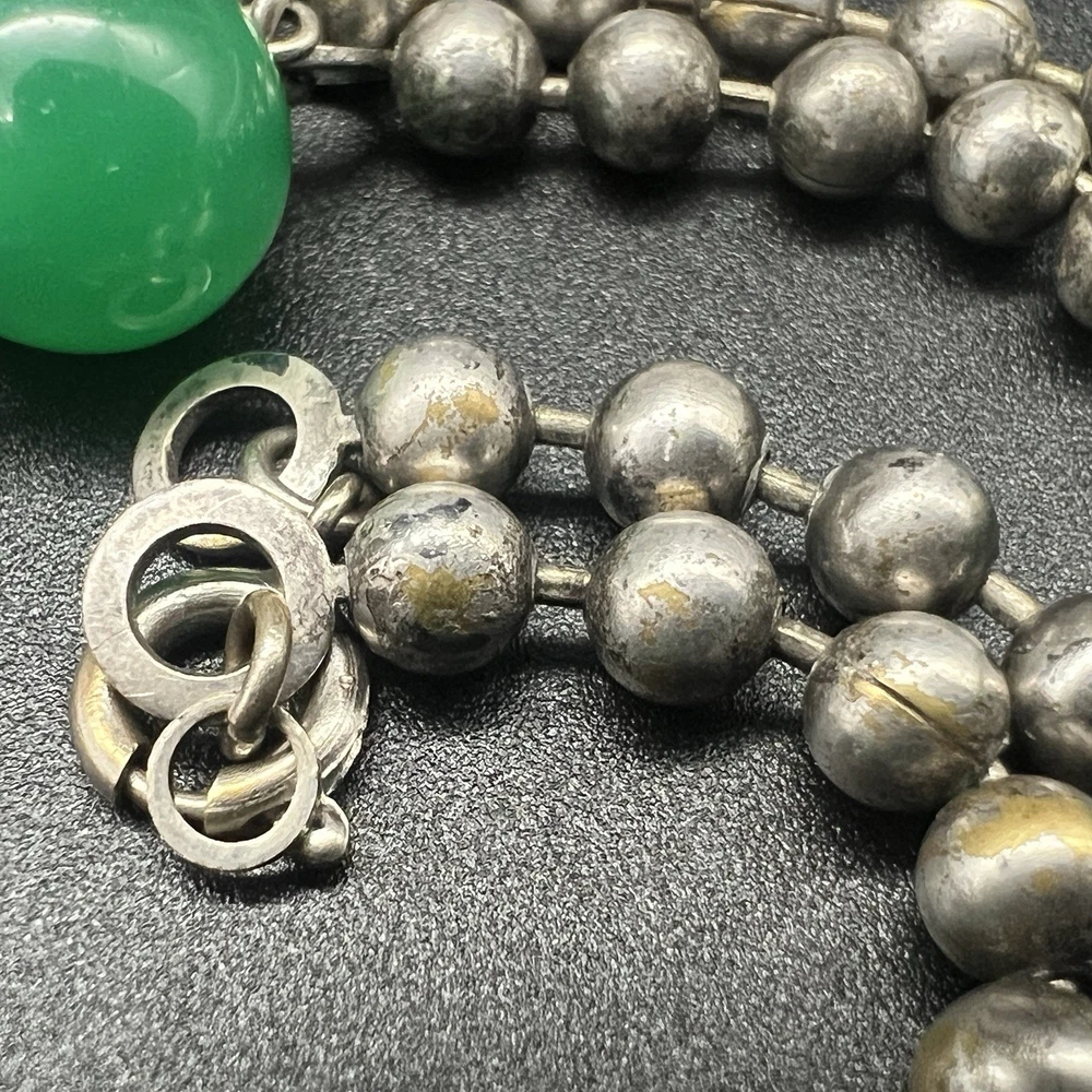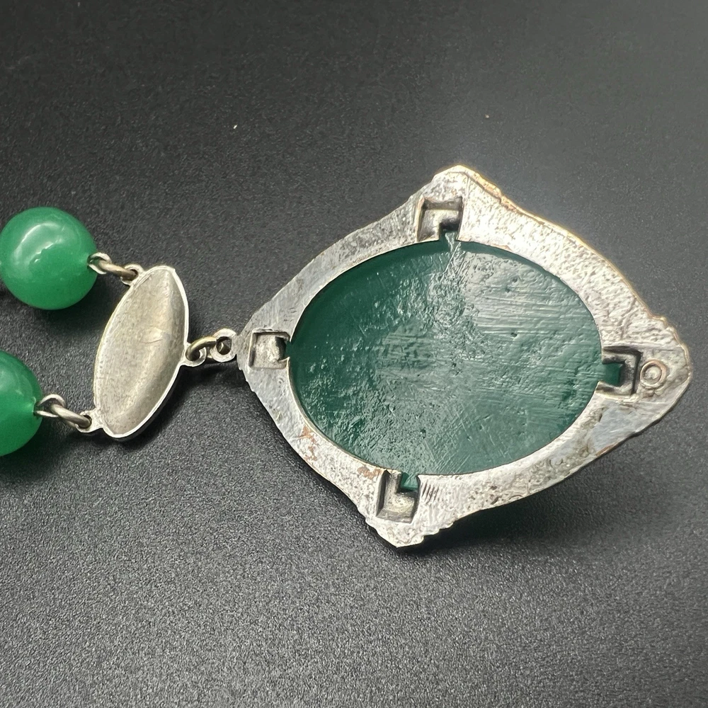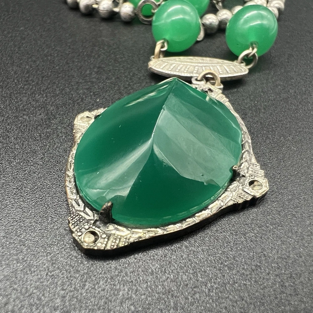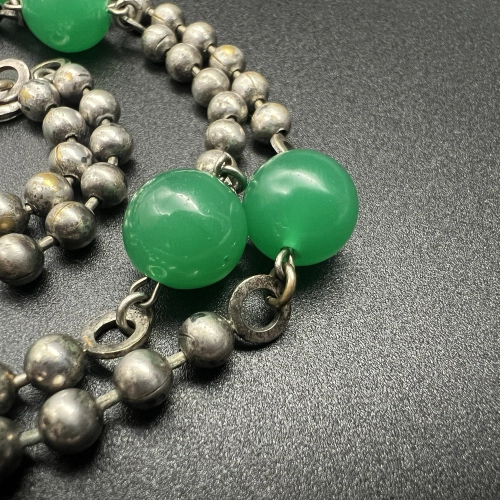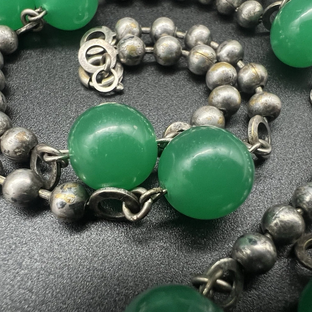 Antique Art Deco Czech Peking Glass & Filigree 24" Necklace In Jade Green. Condition is Pre-owned - Good. Shipped with USPS Ground Advantage.