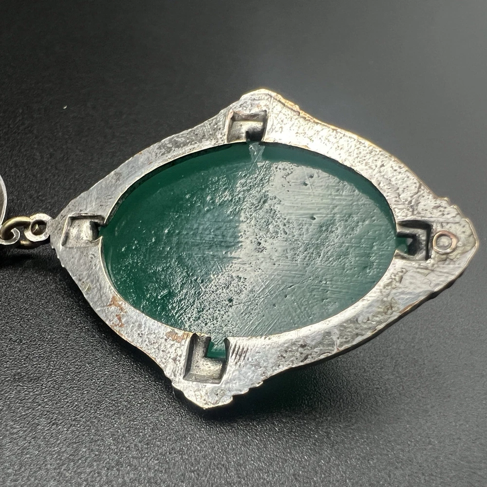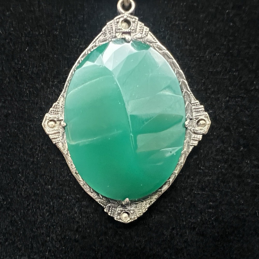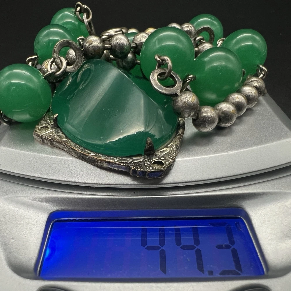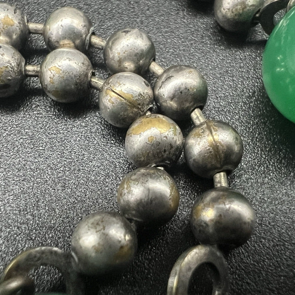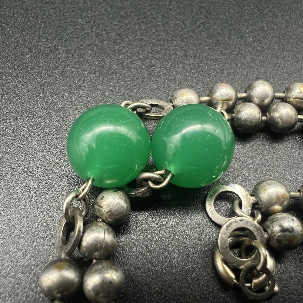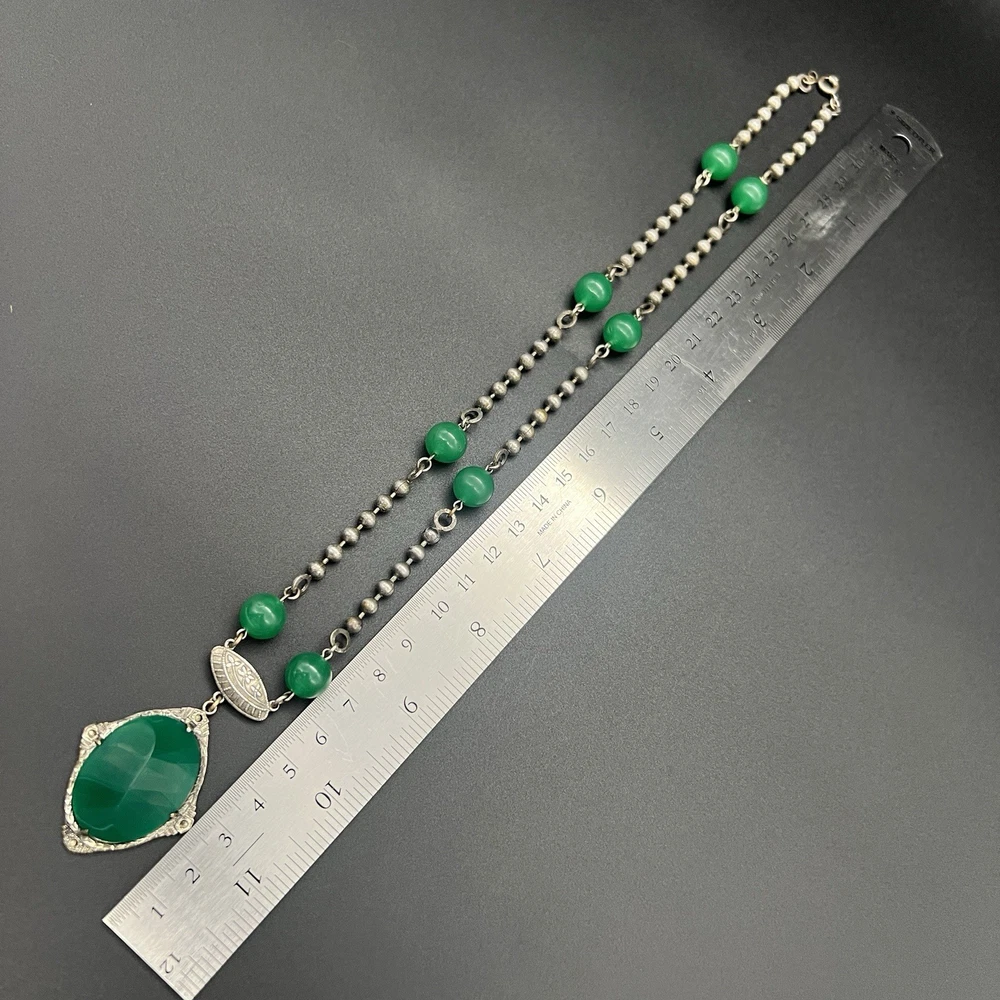 Antique Art Deco Czech Peking Glass & Filigree 24" Necklace In Jade Green. Condition is Pre-owned - Good. Shipped with USPS Ground Advantage.