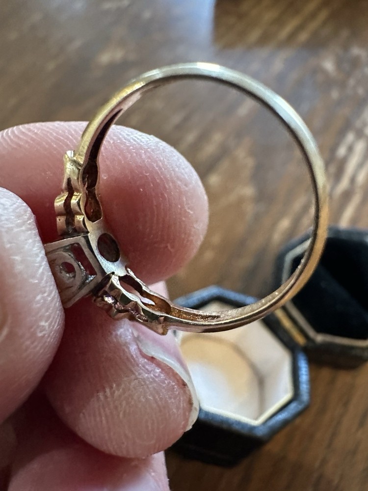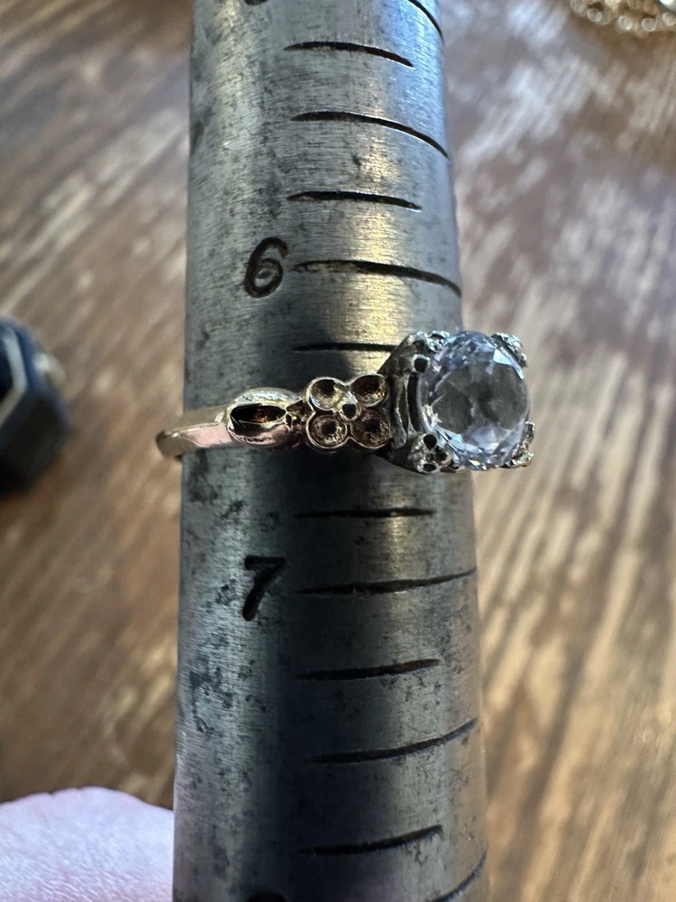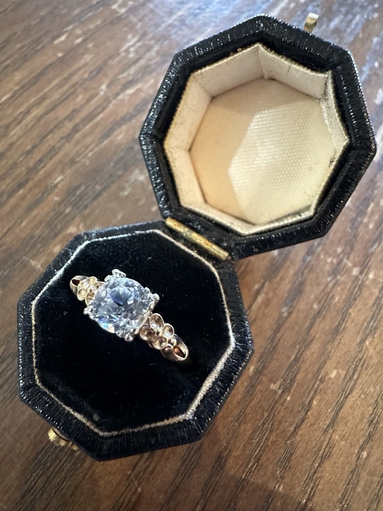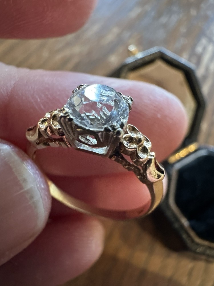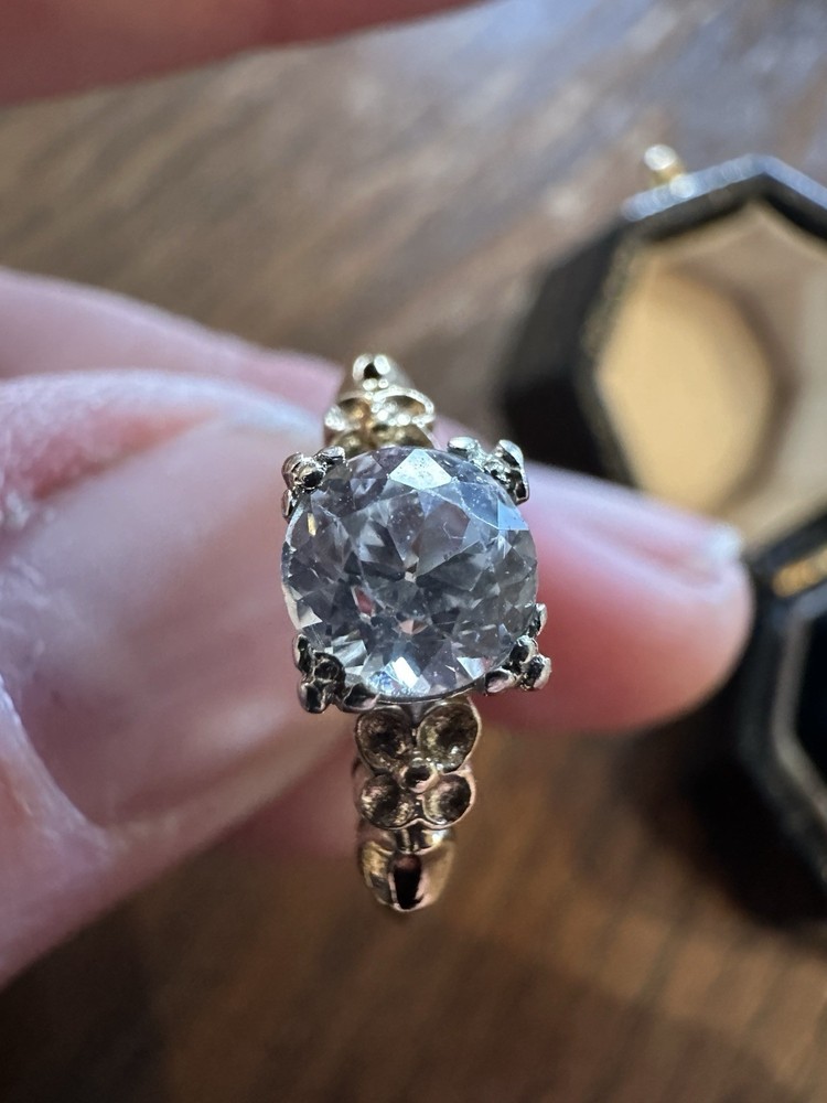 Beautiful authentic antique green. White sapphire. I’m not sure the exact carrot weight but it looks to be approximately one carat.