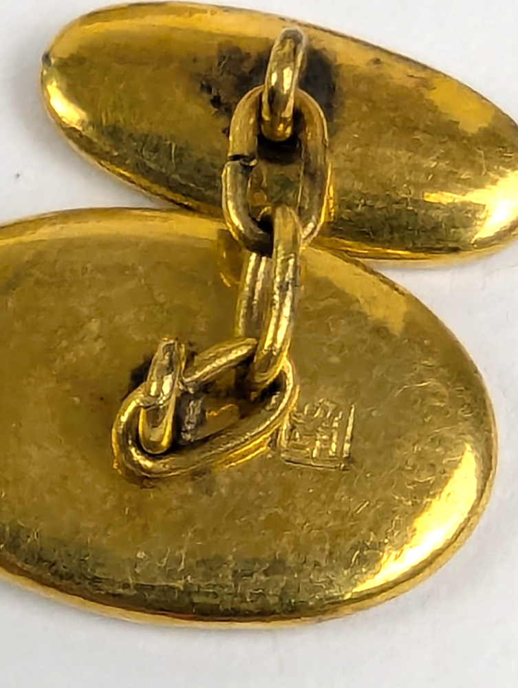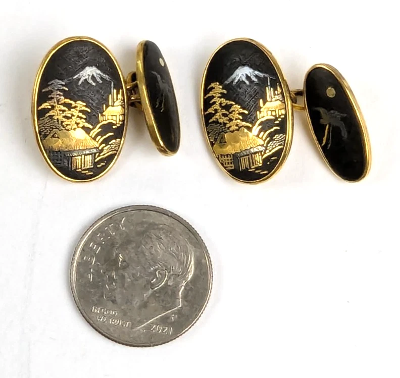Antique Japanese Sterling Silver and Yellow Gold Damascene Inlay Cufflink Buttons. Beautifully crafted with inlay silver and gold featuring a village scene with Mt. Fuji, Pagodas and trees with a Moon and Phoenix bird on the other side. Hallmarked with a Japanese mark on the backside. Lovely Intricate Inlay Cufflinks in excellent estate condition. No faults 5302