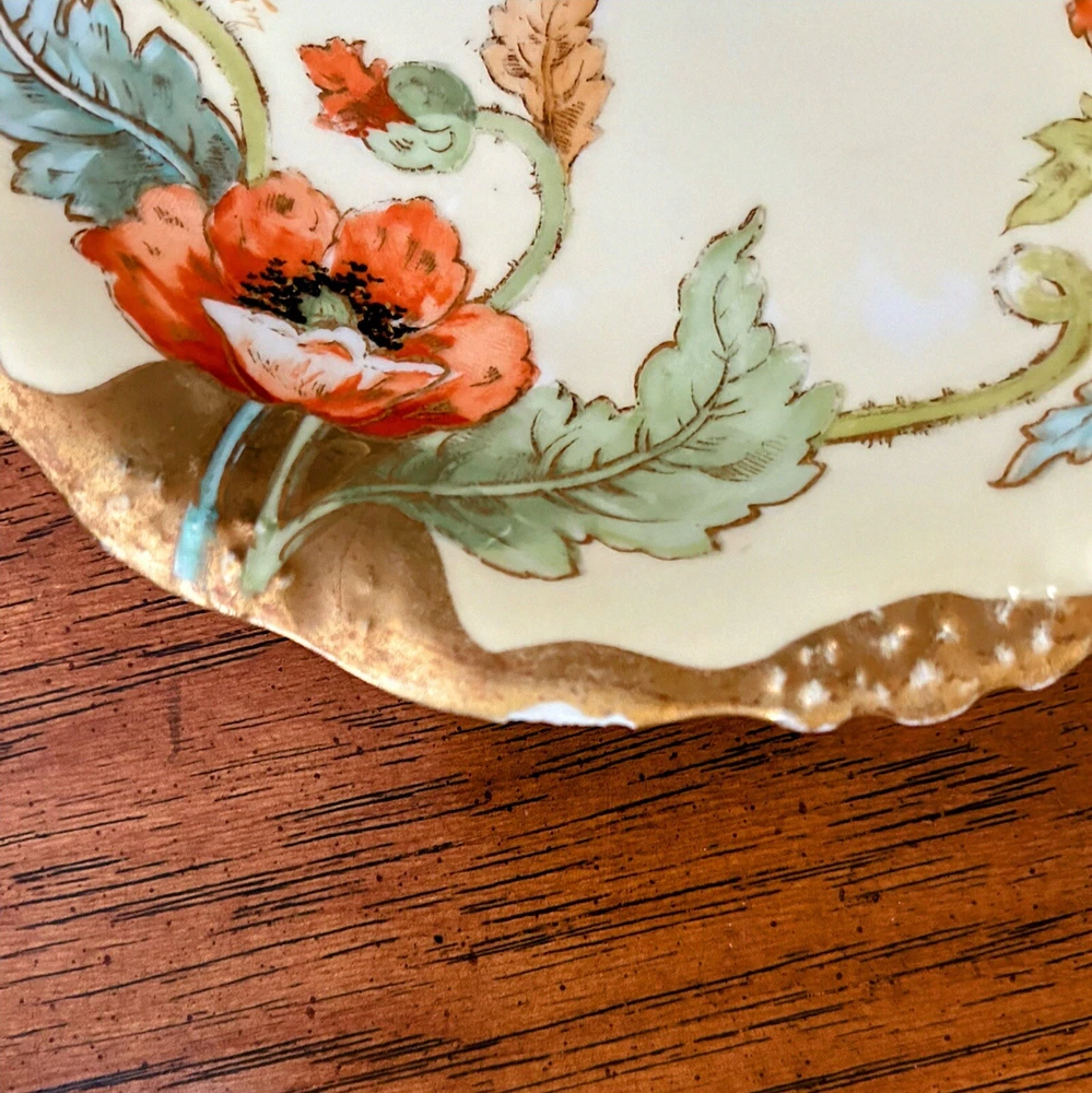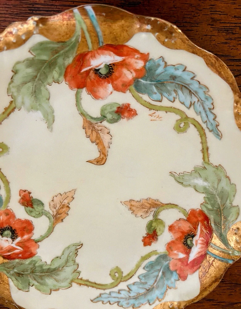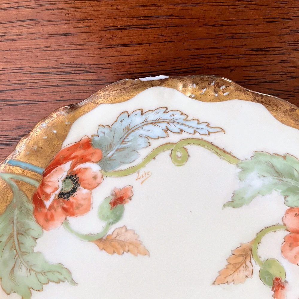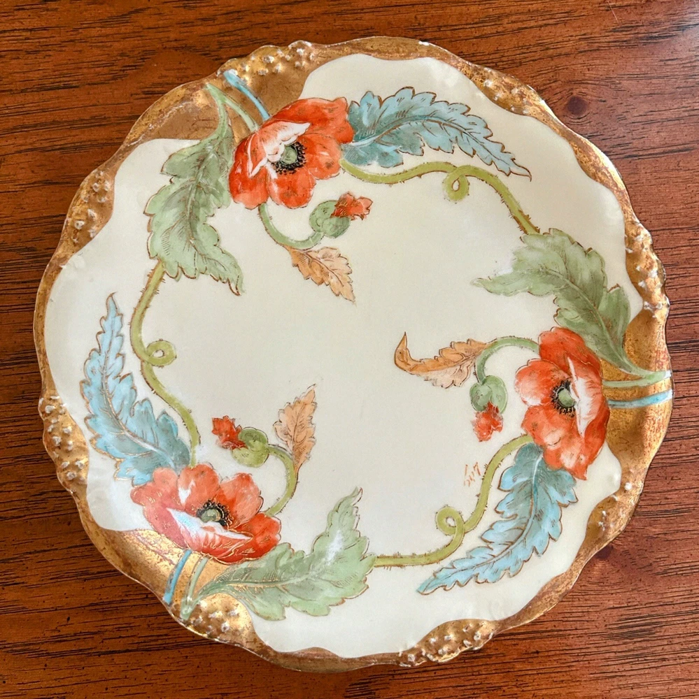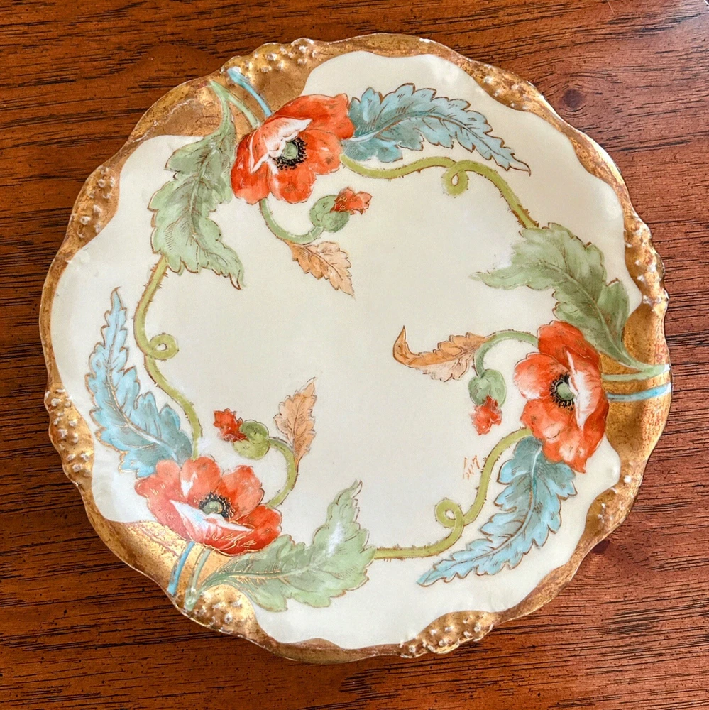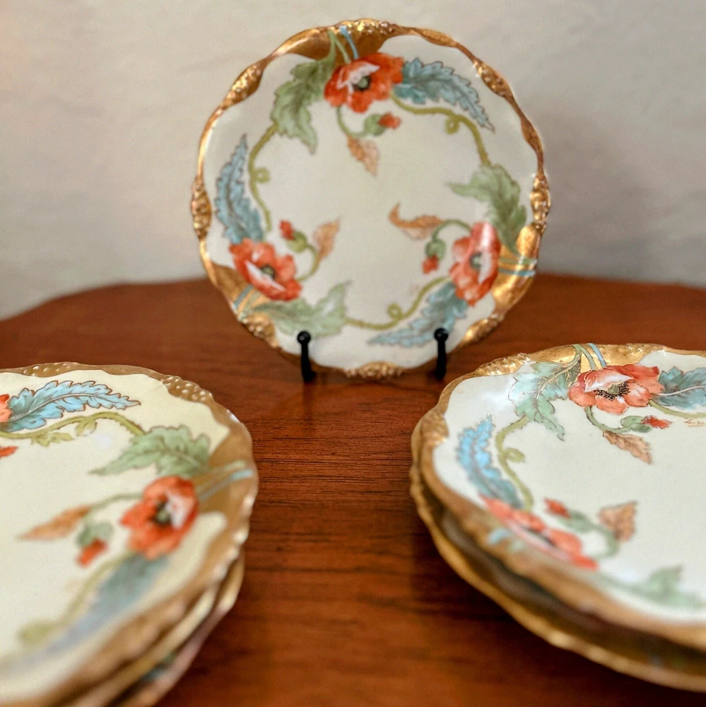 Stunning Antique Art Nouveau Limoges France decorative plates. Beautiful gilded poppy design. These plates were made in France by Limoges for Elite Works Saint Martial. Elite Works S.M. had established a factory near Limoges to decorate the blank porcelain plates that Limoges manufactured, so these plates bear two backstamps, the "Elite L France" (used from 1896 - 1920) and the red "Elite Works SM Limoges France Stamp" (used from 1920 - 1932). We can say with certainty that these plates were made in 1920. For even more history, a NYC firm called Bawo & Dotter (founded 1860) likely had these plates commissioned for import to the United States. These plates are hand painted and are signed by the artist. There are some condition issues with chips and some rubbing on the paint, see details below. These plates are STUNNING works of gilded age art and while not perfect, I think they will make someone very happy. Measurements: 7.25" Diameter Condition: All of the plates show light loss of color from improper storage (in the form of rubbing - so tragic, always store your hand painted plates properly!). This is fairly minor and exist to varying degrees on the plates. I do not think it significantly detracts from the design but they are not perfect. One of the plates has no chips, three have small chips on the backside that are not visible from the top, and two plates have chips that are visible from above - although one of these plates has literally one chip that is the size of a pinhead (I like to be forthcoming and honest in my descriptions!). Please message me if you would like more photos, I'd be happy to do so.