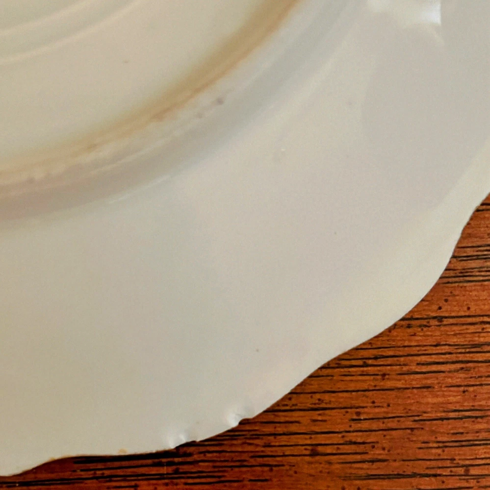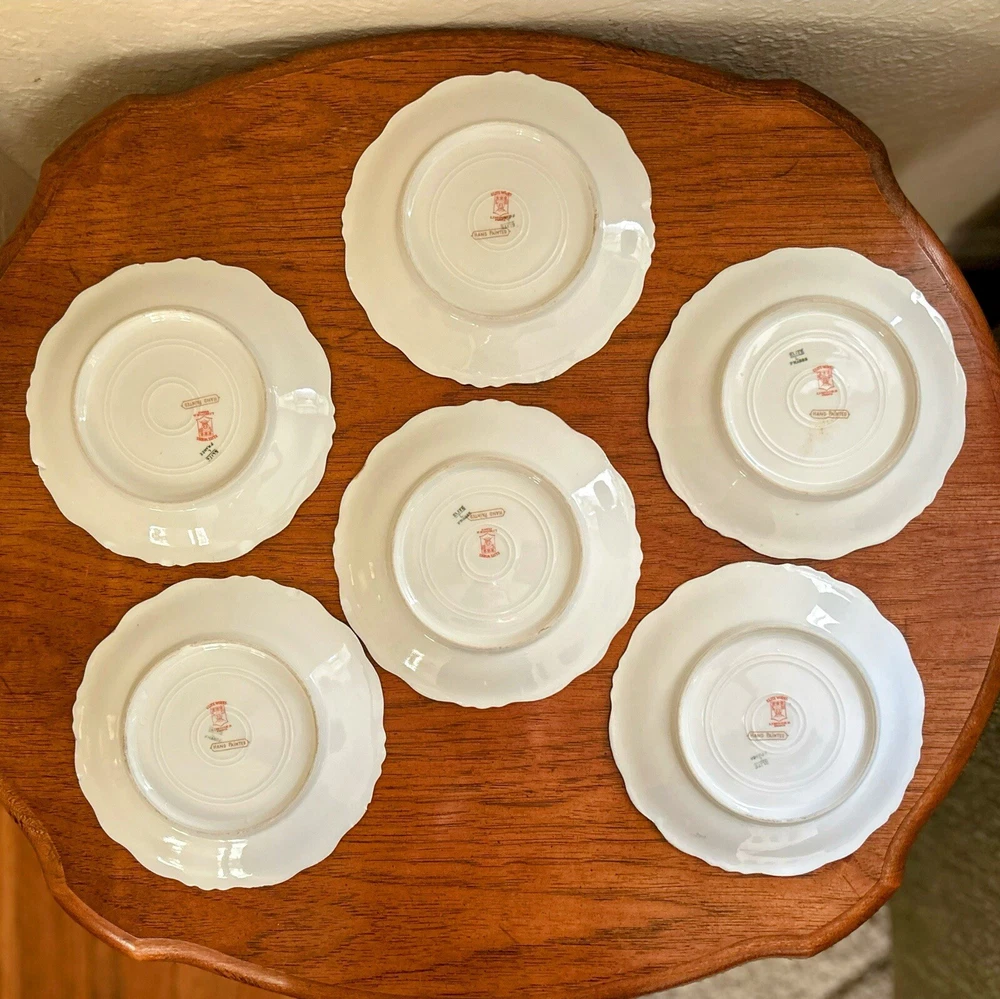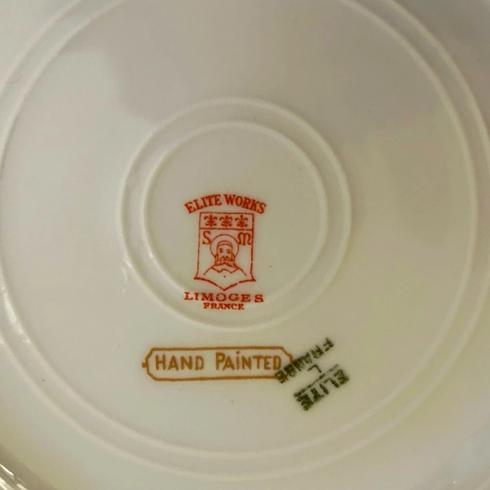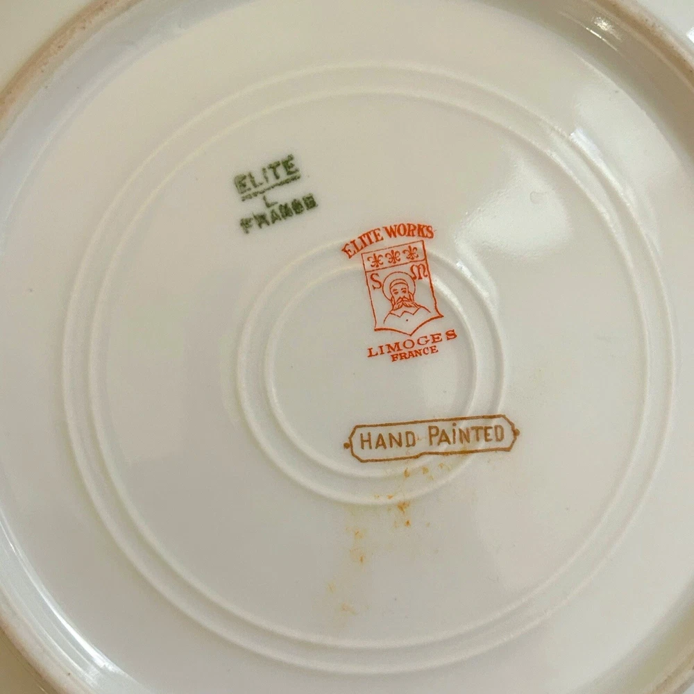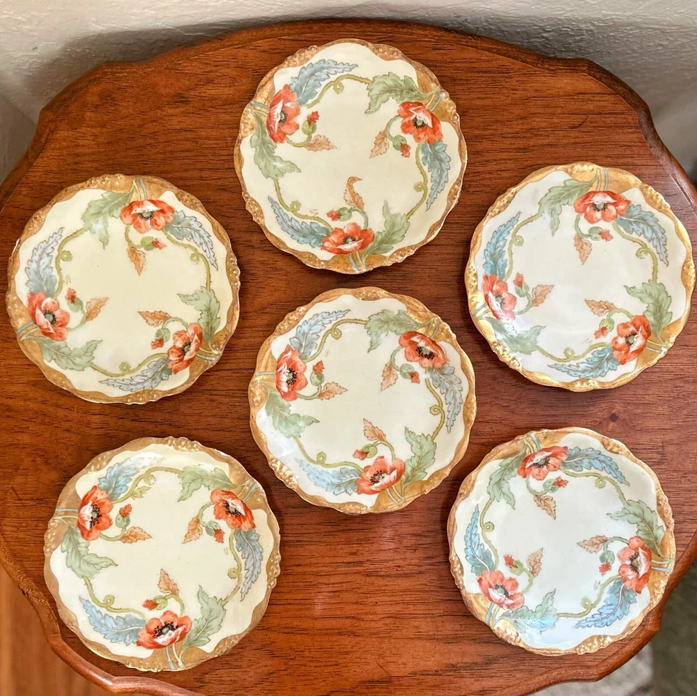 Stunning Antique Art Nouveau Limoges France decorative plates. Beautiful gilded poppy design. These plates were made in France by Limoges for Elite Works Saint Martial. Elite Works S.M. had established a factory near Limoges to decorate the blank porcelain plates that Limoges manufactured, so these plates bear two backstamps, the "Elite L France" (used from 1896 - 1920) and the red "Elite Works SM Limoges France Stamp" (used from 1920 - 1932). We can say with certainty that these plates were made in 1920. For even more history, a NYC firm called Bawo & Dotter (founded 1860) likely had these plates commissioned for import to the United States. These plates are hand painted and are signed by the artist. There are some condition issues with chips and some rubbing on the paint, see details below. These plates are STUNNING works of gilded age art and while not perfect, I think they will make someone very happy. Measurements: 7.25" Diameter Condition: All of the plates show light loss of color from improper storage (in the form of rubbing - so tragic, always store your hand painted plates properly!). This is fairly minor and exist to varying degrees on the plates. I do not think it significantly detracts from the design but they are not perfect. One of the plates has no chips, three have small chips on the backside that are not visible from the top, and two plates have chips that are visible from above - although one of these plates has literally one chip that is the size of a pinhead (I like to be forthcoming and honest in my descriptions!). Please message me if you would like more photos, I'd be happy to do so.