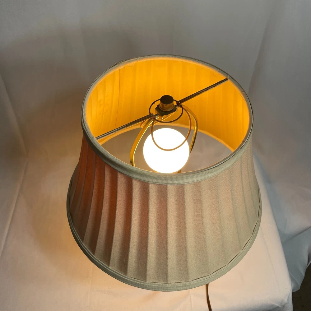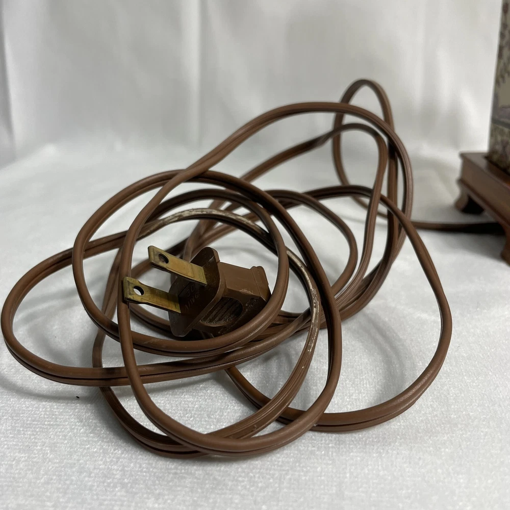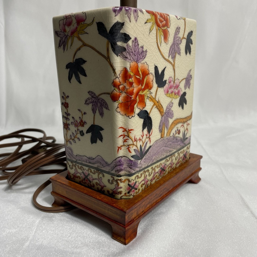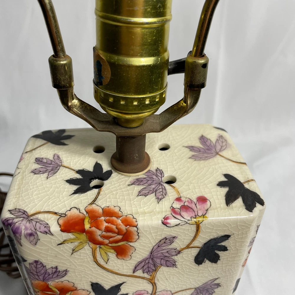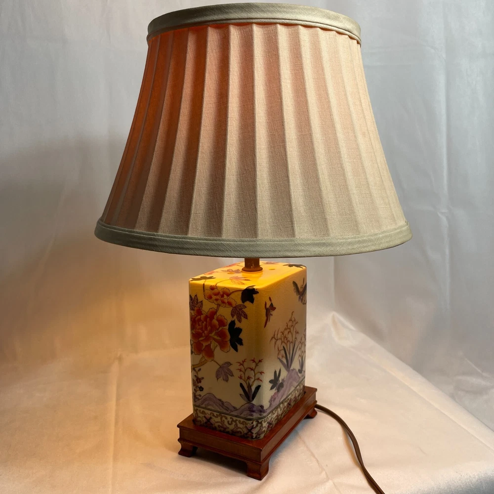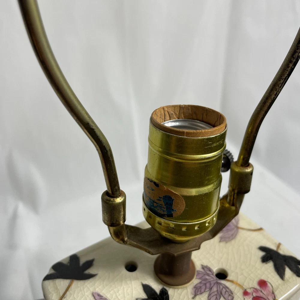 This Antique Porcelain Lamp from the 1940s features a beautiful Multi Color Floral Design on a Wood Base. The lamp has a Shaded design with a Bell-shaped Lamp Shade included. It is a vintage piece with a 1940's style and an Original design. The lamp has a Corded Electric Power Source with Knob Control and a 3-light Switch option for easy operation. Standing at 17 inches high, this Lady Lamp exudes a classic Art and Floral theme, making it a unique addition to any Unisex Adults' living space. Lamp Dimension: H 17" W 5 3/4" L 4" Cord Length: 8 ft Lamp Shad: H 8" Top Diam 8" Bottom Diam 12"
