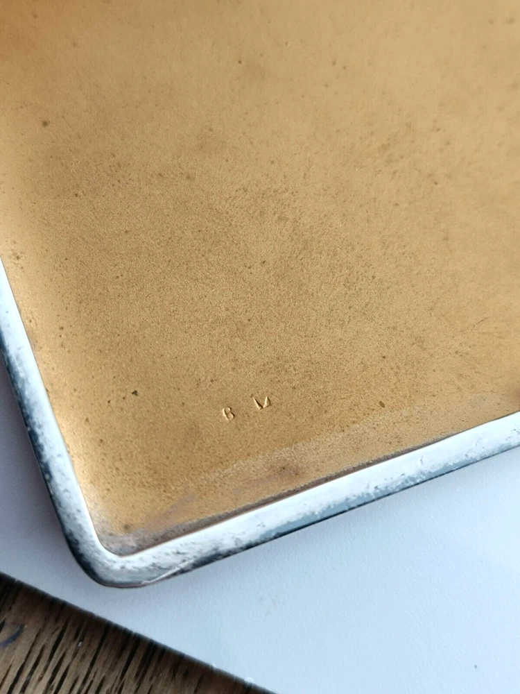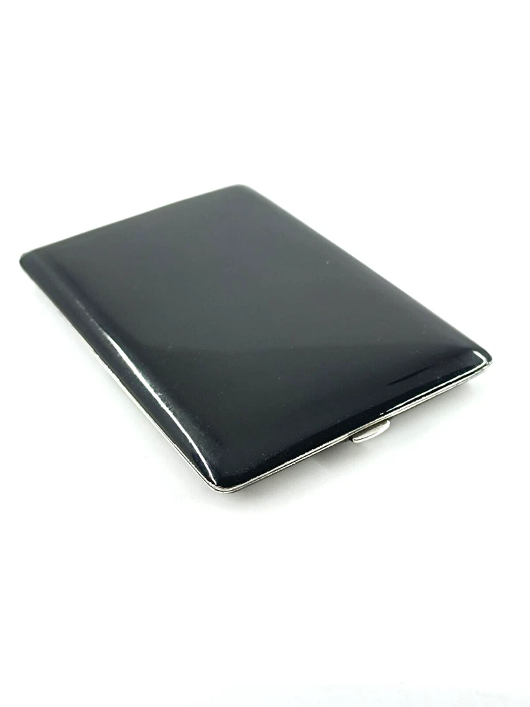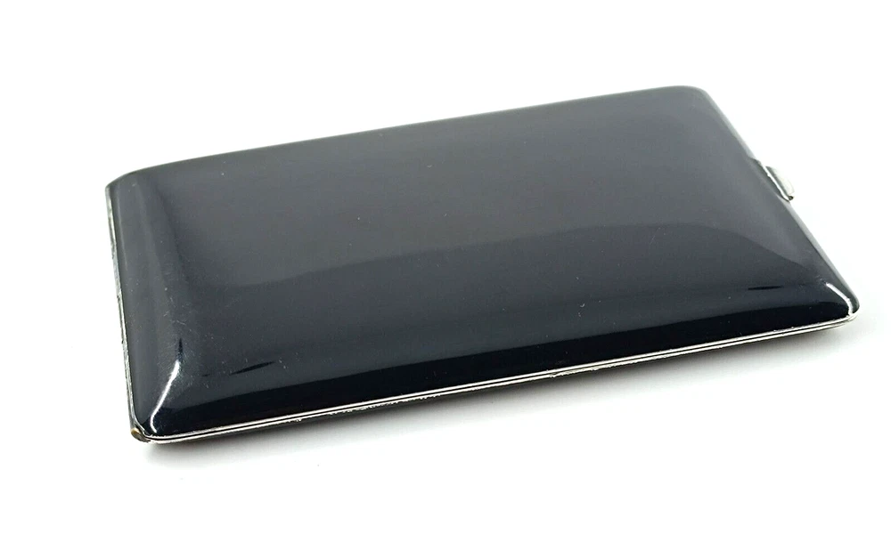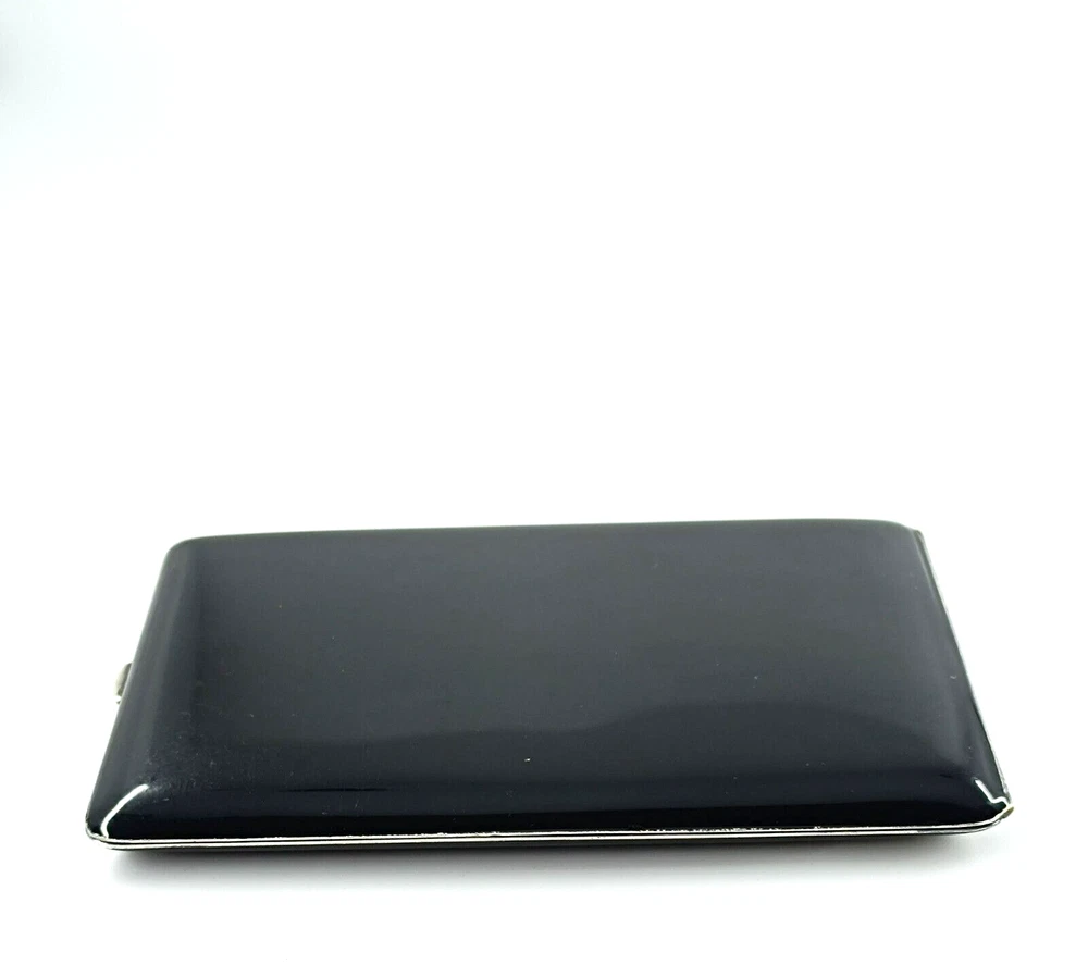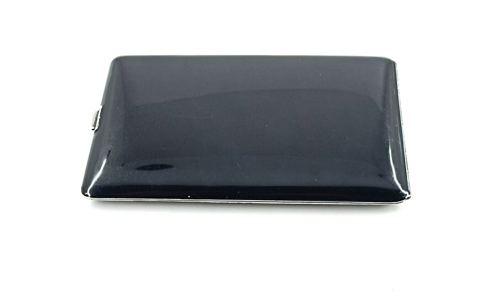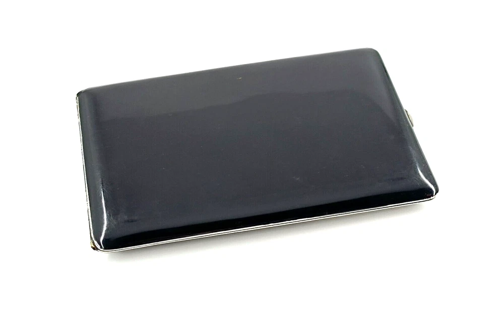 This antique cigarette case features a sleek black enamel finish with an elegant Art Deco design. The interior is gilded and retains its original elastic strap, making it a unique and stylish piece. A great addition to any vintage smoking accessory collection. antique cigarette case, vintage cigarette case, enamel cigarette case, black enamel case, Art Deco cigarette case, rare cigarette case, collector's cigarette case, vintage smoking accessory, retro cigarette case, antique smoking case, Victorian cigarette case, Edwardian cigarette case, old cigarette case, 19th century cigarette case, antique tobacco case, vintage snuff box, enamel snuff case, art nouveau case, elegant cigarette case, classic cigarette holder, ornate cigarette case, historical smoking accessory, rare case, museum quality case, engraved cigarette case, pocket cigarette case, antique curio, investment collectible, French cigarette case, Swiss cigarette case, European cigarette case, decorative case, unique smoking case, early 1900s cigarette case, rare tobacco accessory, steampunk cigarette case, bespoke cigarette case, black lacquer case, antique jewelry, rare antiques, estate collectible, gilded cigarette case, handcrafted cigarette case, sophisticated smoking case, historical artifact, retro collectible, one-of-a-kind case, gentleman’s accessory, luxurious vintage case, heritage cigarette case, timeless treasure, smoking history, exclusive collector's item, limited edition case, elegant vintage accessory, steampunk collectible, historical case, bespoke vintage case, antique elegance, early 20th century case, classic smoking collectible, stylish cigarette case, exclusive smoking collectible, rare enamel case, rare snuff box, pocket snuff case, antique decor, decorative collectible, smoking enthusiast collectible, elegant gift, stylish vintage case, rare gilded interior case, distinguished gentleman's case, premium collector's case.