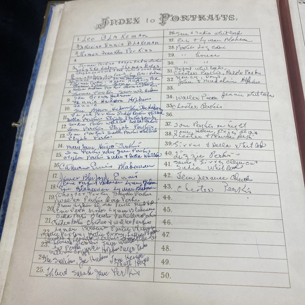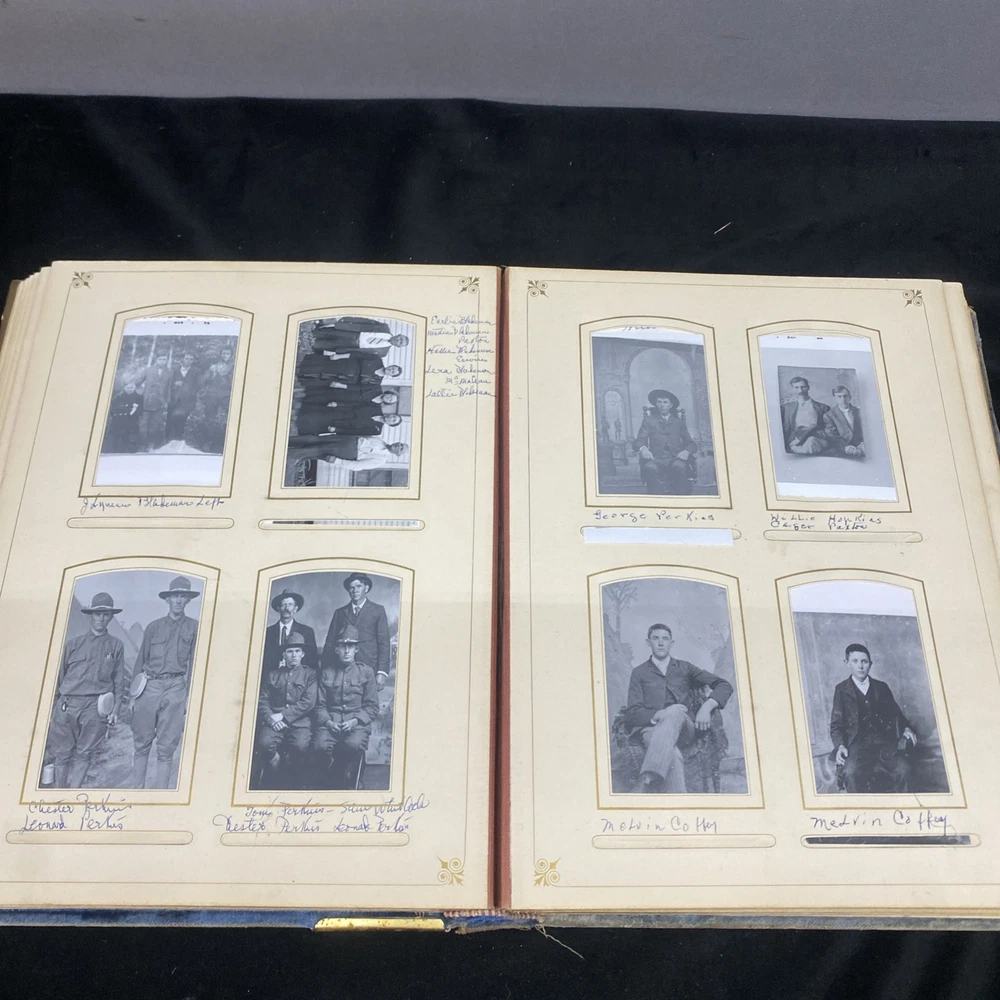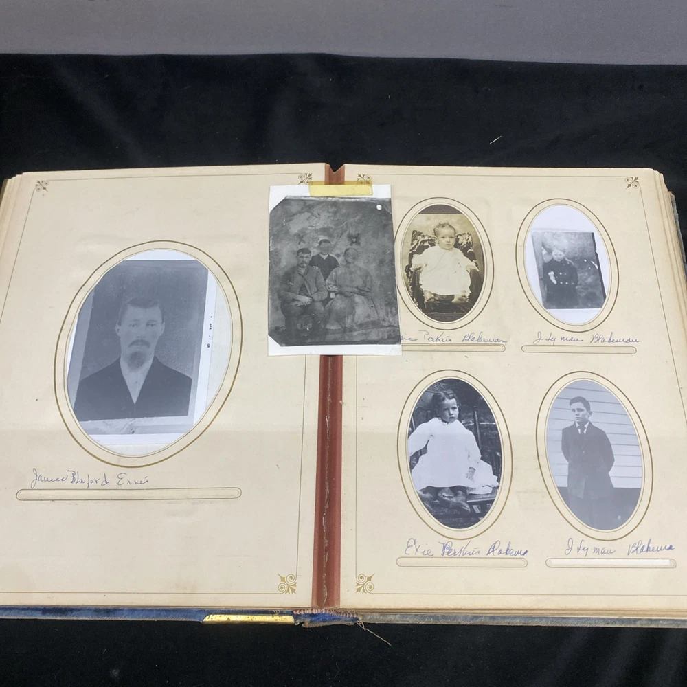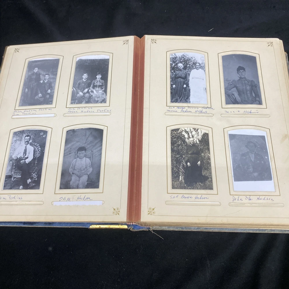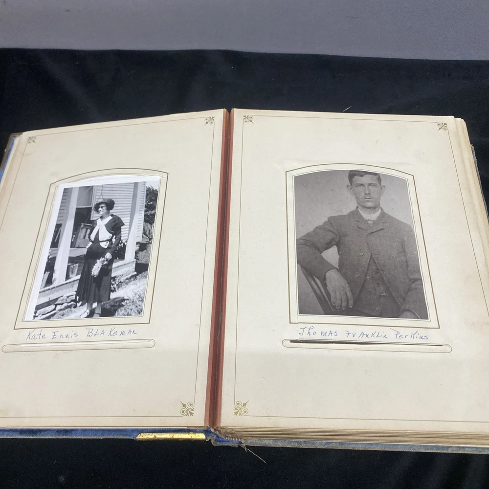 This antique blue velvet family album from the late 1890s to early and mid 1900s is a unique piece of Americana with brass accents and a latch closure. Filled with sepia-toned photographs of women, men, and families, this one-of-a-kind (OOAK) album is a vintage treasure originating from the United States. Measuring 12x9x3 inches, this fabric and cardboard album offers a glimpse into the past and would make a valuable addition to any collection of photographic images. In good shape. Some wear and discoloration to the fabric. Some Tarnish on the brass Some pages have damage and small tears. Mostly pics of the Blakeman,Perkins ,Hudson,Whitlock,Families from Kentucky Names written on photos and on pages. Has an index. Some other loose photos included