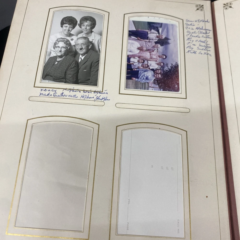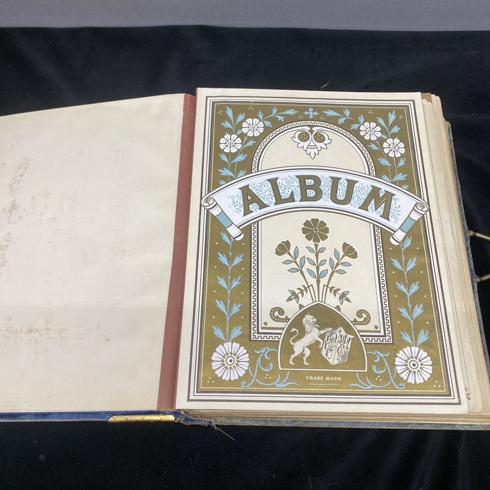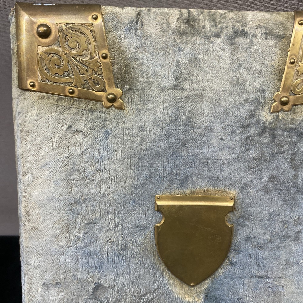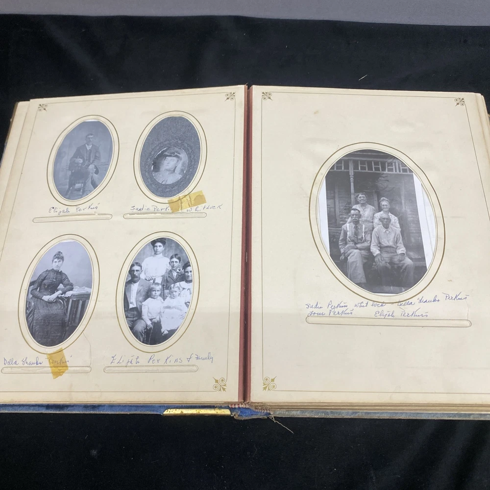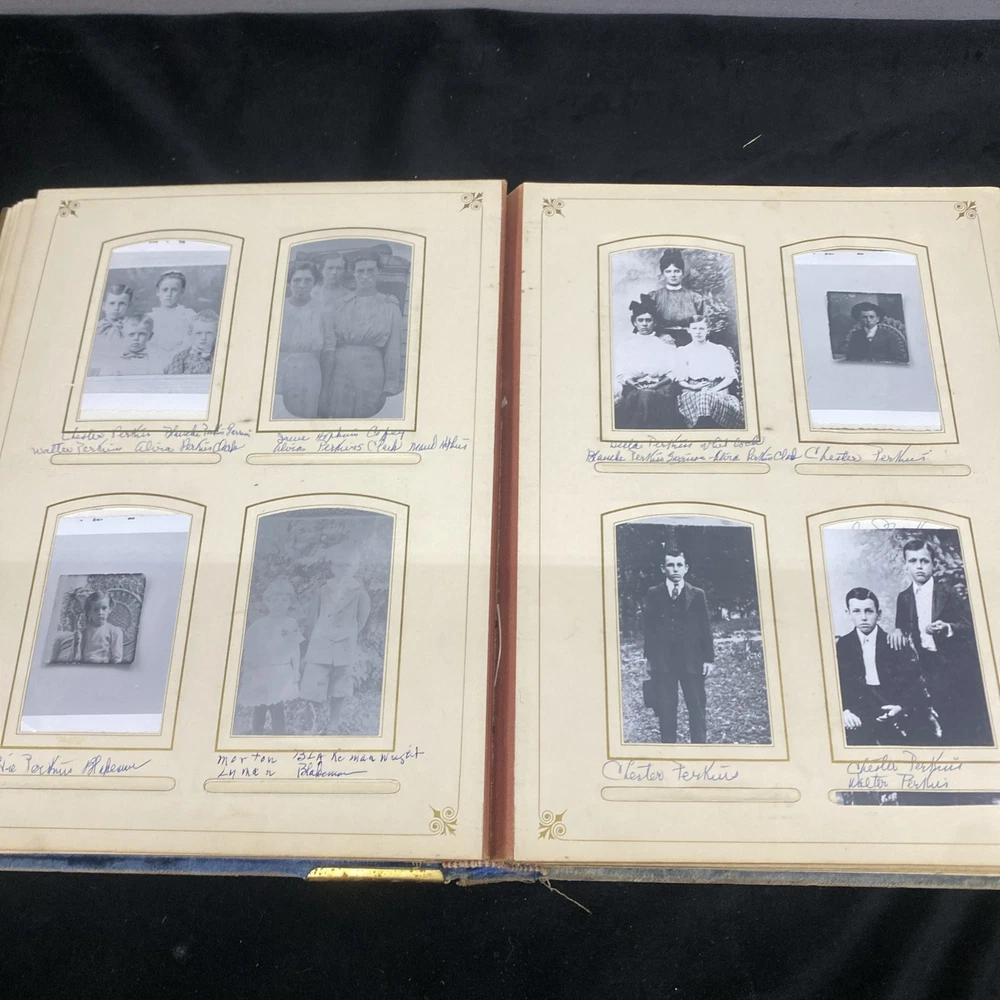This antique blue velvet family album from the late 1890s to early and mid 1900s is a unique piece of Americana with brass accents and a latch closure. Filled with sepia-toned photographs of women, men, and families, this one-of-a-kind (OOAK) album is a vintage treasure originating from the United States. Measuring 12x9x3 inches, this fabric and cardboard album offers a glimpse into the past and would make a valuable addition to any collection of photographic images. In good shape. Some wear and discoloration to the fabric. Some Tarnish on the brass Some pages have damage and small tears. Mostly pics of the Blakeman,Perkins ,Hudson,Whitlock,Families from Kentucky Names written on photos and on pages. Has an index. Some other loose photos included