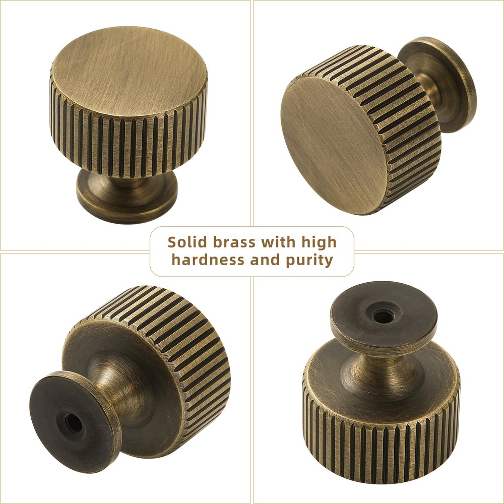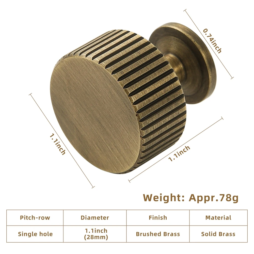 PRODUCT PARAMETERS : Brass knob diameter: 1.1 Inch(28mm), Height: 1.1 Inch(28mm), Base of Knob Diameter: 0.75 Inch(19mm), Weight: Ca. 77g/piece SUPERIOR MATERIAL : Our antique cabinet knob is made of 100% solid brass material, this sturdy knob is rust-resistant and anti-corrosion, ensuring a long-lasting and premium look for your bathroom, bedroom, or kitchen cabinets. COMPATIBLE USAGE : With elegant design and exquisite surface finishing, antique brass cabinet hardware knobs are the perfect match as vintage cupboard wardrobe pulls,solid brass dresser drawer knobs,kitchen pull handles and even closet door handles. Add a touch of luxury to your home decor with the bronze cabinet knob, the perfect decorative brass knob for furniture cabinet. EASY INSTALLATION : These solid brass cabinet hardware knobs for dresser drawers come equipped with 2 size of screws, you just need for a hassle-free installation process, saving you time and effort. WELL PACKED : The brass dresser drawer knobs and handles are well packed in a protective foam to avoid damage during transportation.