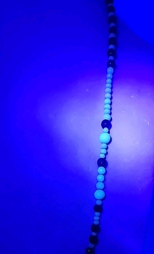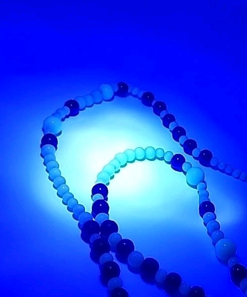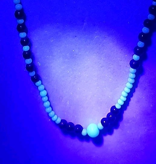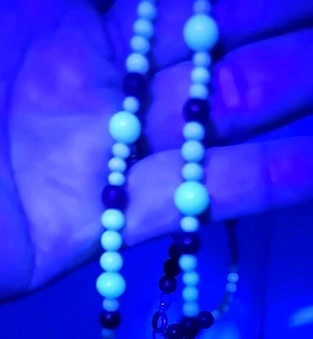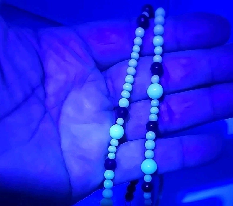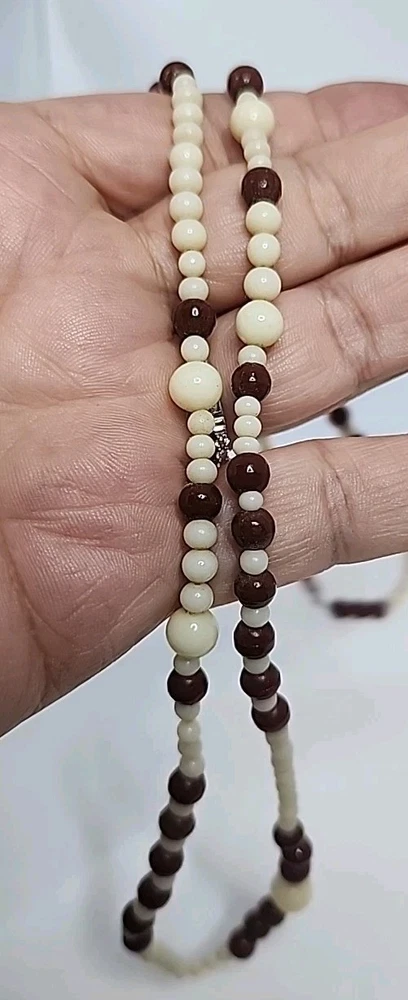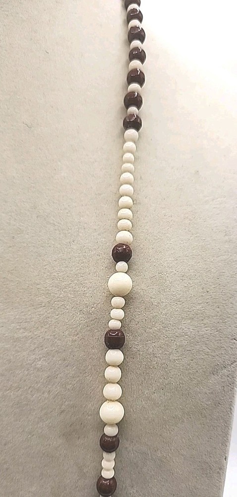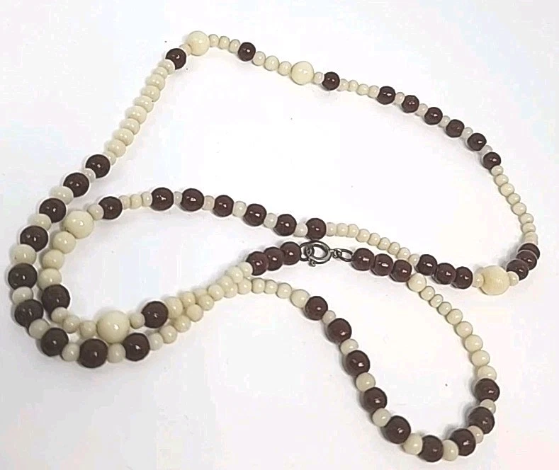 This antique brown and white beaded necklace is a vintage piece. Handmade with beads, this 26" necklace features a spring ring closure and a round white and brown beads. The Art Deco era design exudes an Art theme, making it a stylish accessory for women who appreciate historical jewelry. The uranium? glow in the pictures adds a touch of mystery to this original piece, perfect for those who love unique and handmade items.