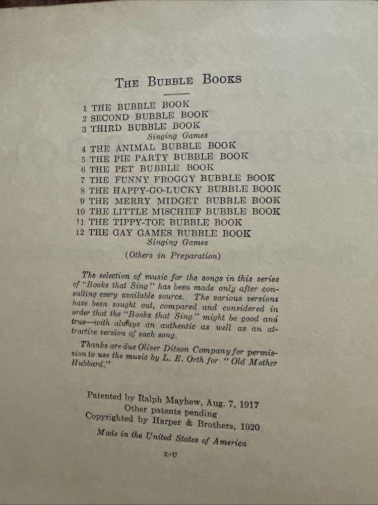 Complete The product is an antique Bubble Book titled "Tippy Toe" from 1920, published by Harper Columbia. It includes story records, is illustrated by Rhonda Chase, and written by Ralph Mayhew Burges Johnson. The book is a children's story in English, with a hardcover binding, and was manufactured in the United States.