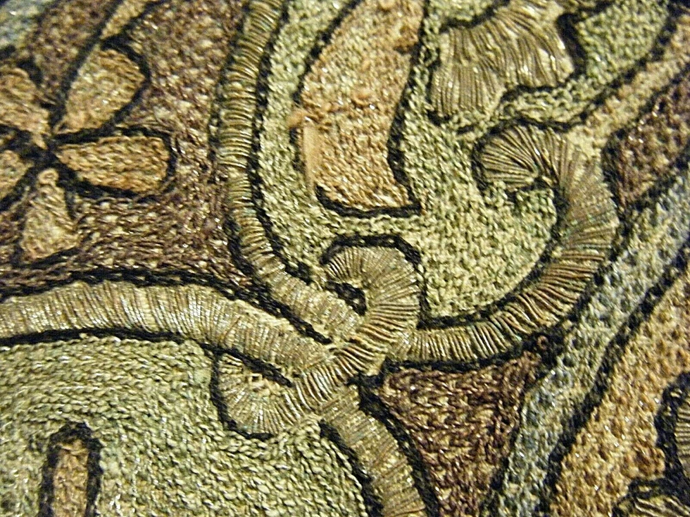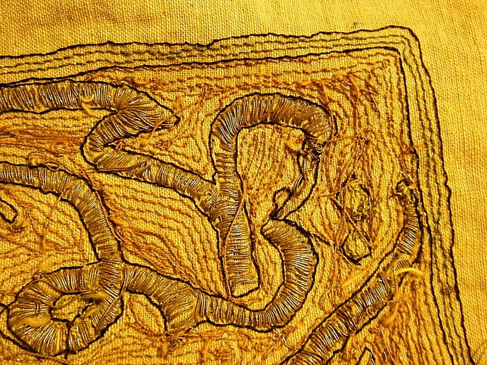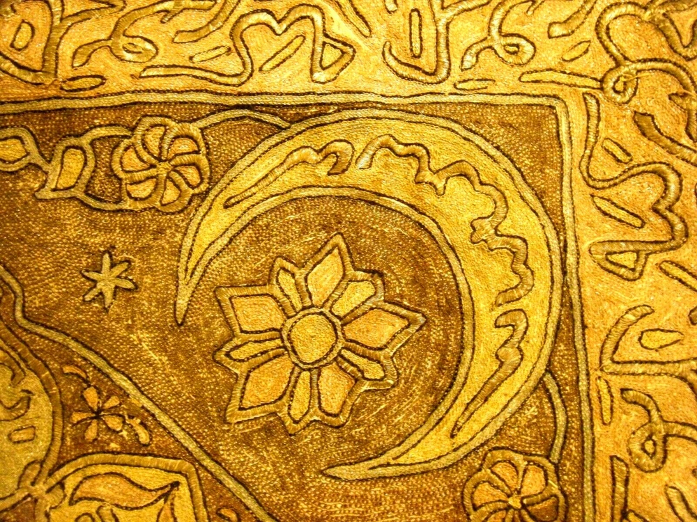 Turkish / middle eastern / Persian origin. Beautiful 36" x 36" large antique elaborate embroidered wall tapestry. Gold and silver bullion threads, mosque center, moon and star elements. One stain and one small hole as shown on the last two photos. SHIPPING IN THE USA $11.50 THANKS