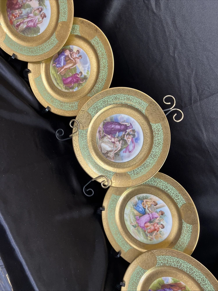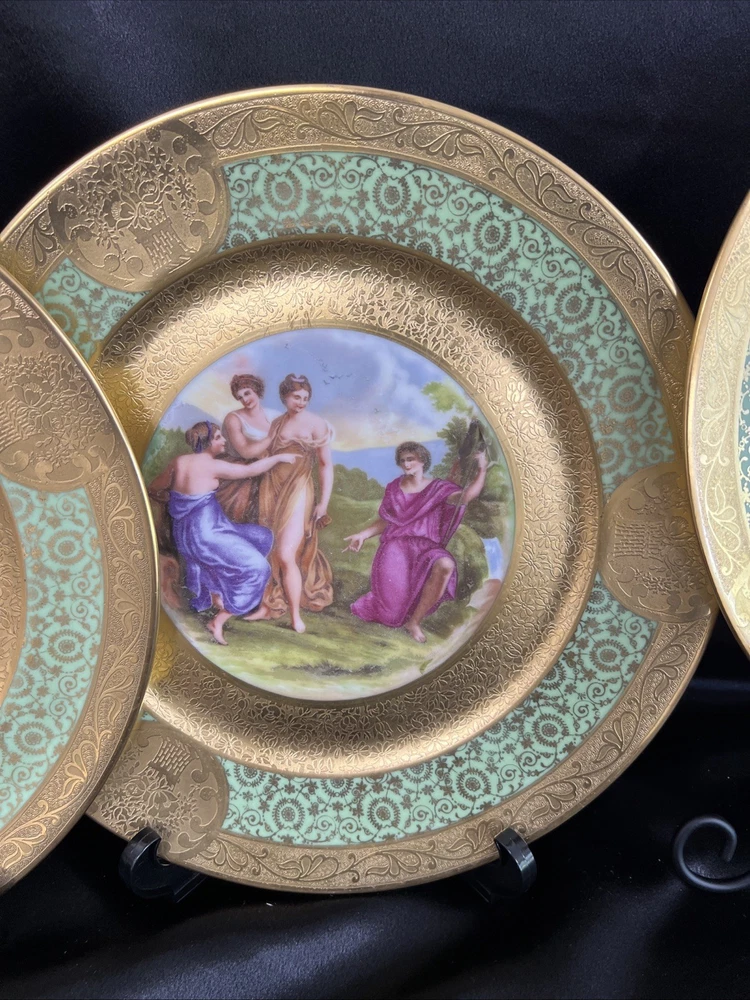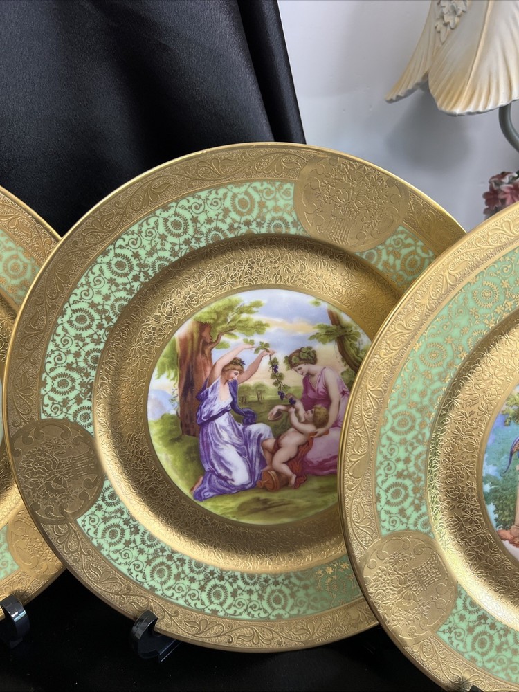 Beautiful Antique collectible plates. Rare found. This unique piece is gold and green encrusted with hand painted painting by Angelica Kauffman famous Swiss painter around 1741 to 1807. Every single piece had unique artwork. It’s very special piece of artwork will remain the British culture. All are in good condition no cracks and no chips. I will shipped the special pieces to you within 3-5 days. Ask me anything about it. Thank you for your patience.