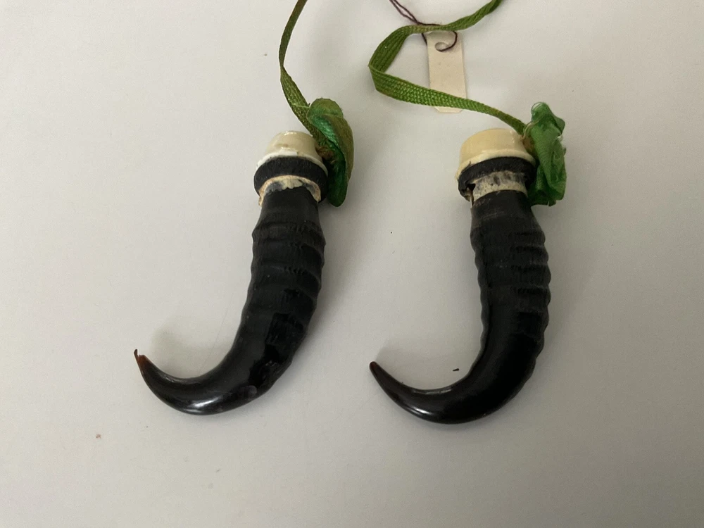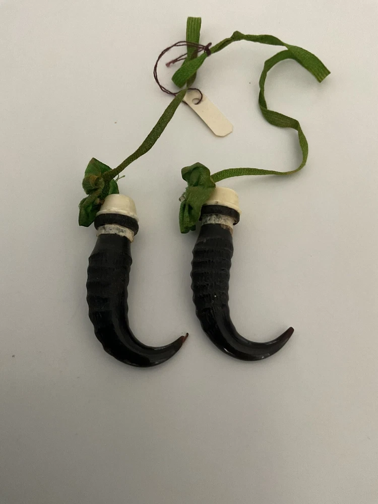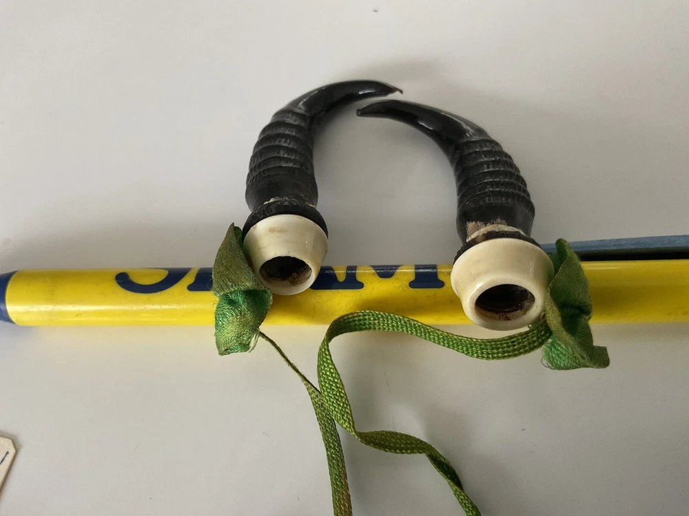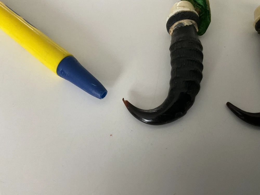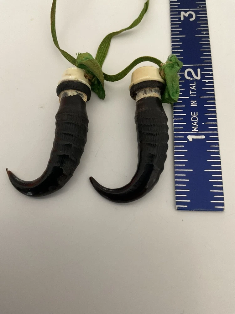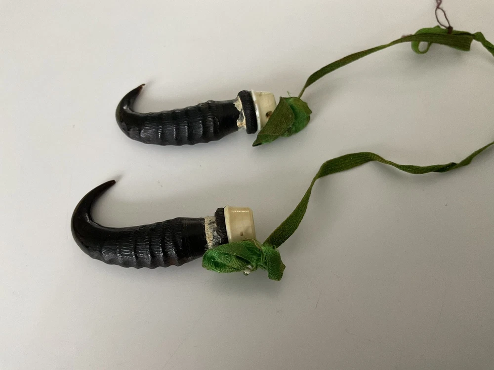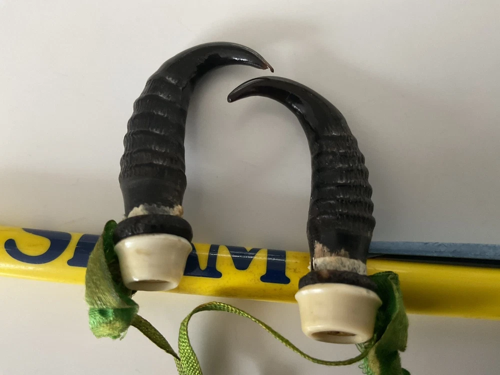 This antique carved figure is a unique addition to any collection. The horn-shaped knitting needle guards are a great accessory for any knitting enthusiast. The hooked horn design adds a touch of vintage charm to your knitting projects. Perfect for those who love to add a personal touch to their crafts. The needle guards are perfect for keeping your knitting needles organized and safe when not in use. I came across these while cleaning out some of my Mom’s things and had no idea what they were. I found similar on eBay so I guess that’s what they are. I have no idea what they are made of. There is a price tag that was on the string $145. View all the photos for they are the description. Pointed out one of the hooks is chipped on the end. Thanks for looking!