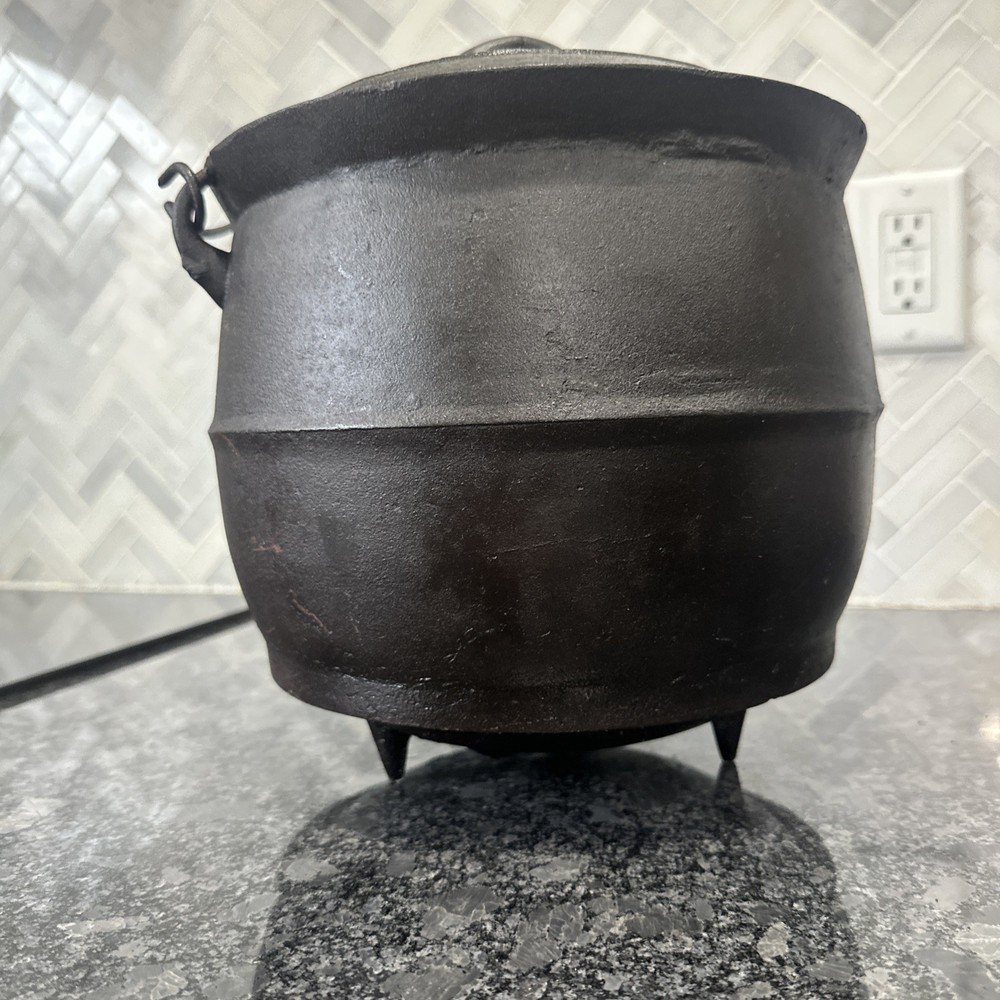 This antique cast iron bean pot is a vintage collectible piece that is perfect for any kitchen or home decor. This round cauldron pot features a classic design with a sturdy handle and a matching lid, making it a functional and stylish addition to any cooking space. Made of cast iron and with a black color, this original piece is compatible with gas stoves and is sure to add a touch of nostalgia to your cooking routine.
