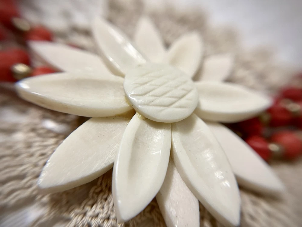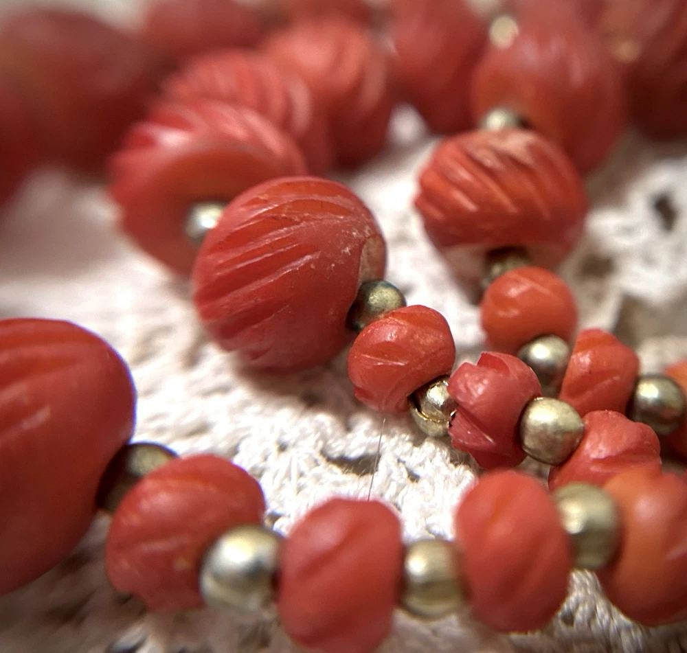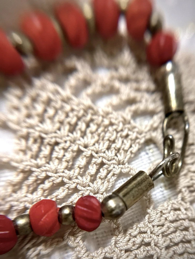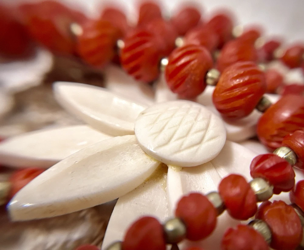 Antique Bib Necklace Dyed Celluloid carved Flower Accent Red Victorian 20”