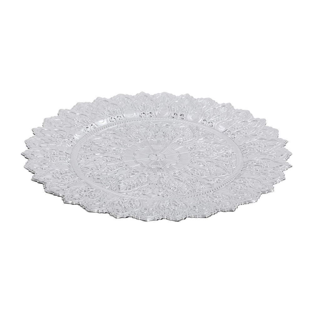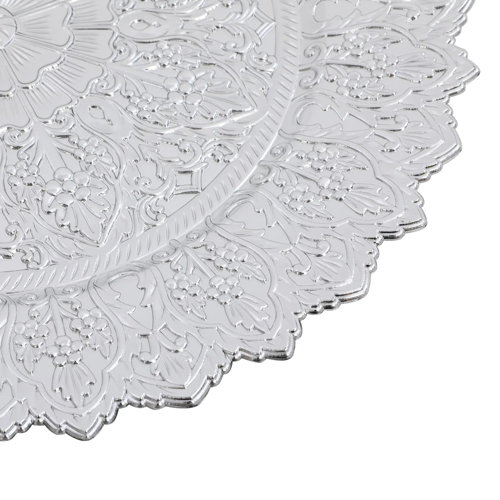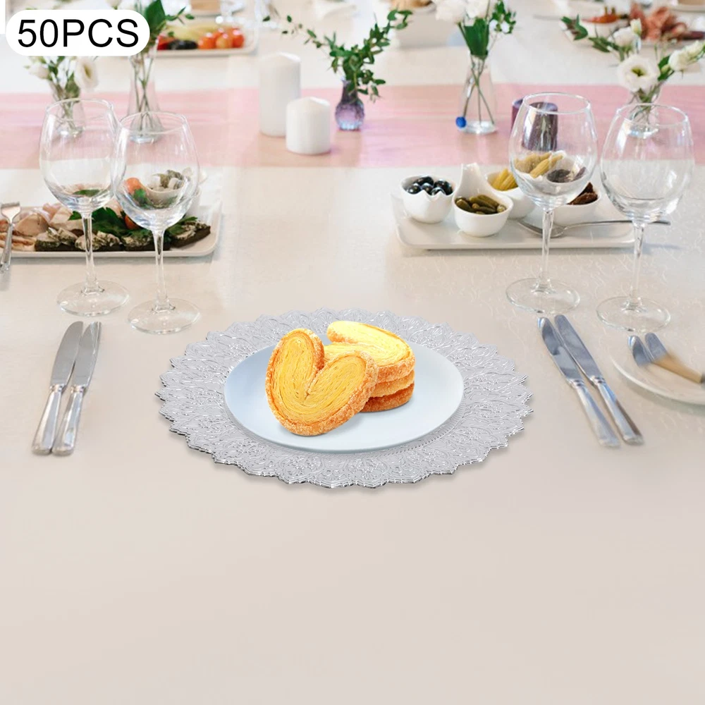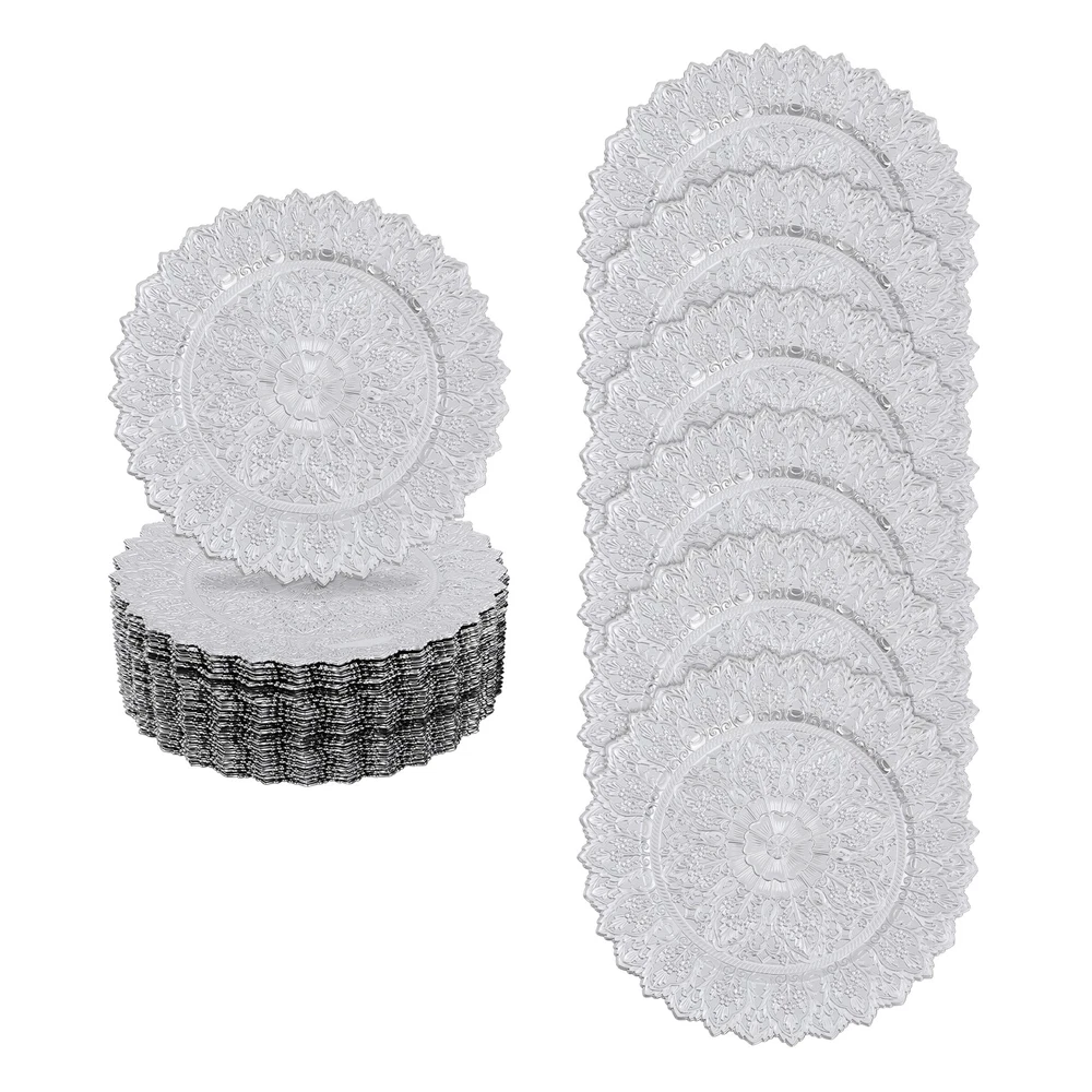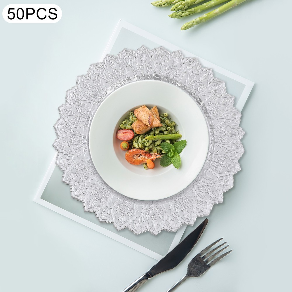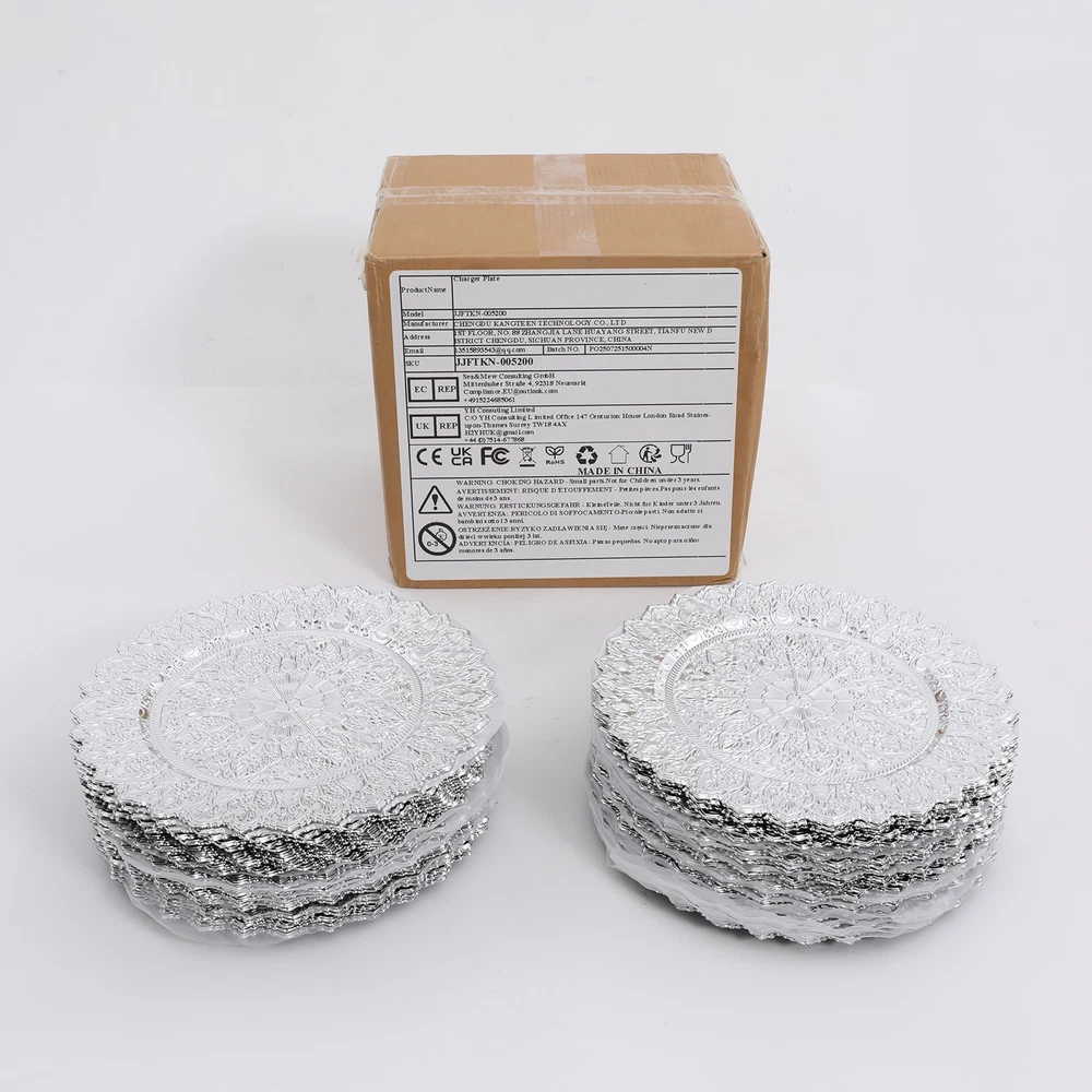 Application This product is suitable for parties, weddings, banquets, restaurants, hotels, camping, picnics, barbecues, or other events. Specification Color: Silver Shape: Round Style: Vintage Material: PP Process: Spray Painting Mounting Type: Tabletop Number of Pieces: 50 Each Product Diameter: 33cm/13in Package Size: 36*36*29cm/14.17*14.17*11.42in Gross Weight: 16kg/35.27lbs Net Weight: 15.2kg/33.51lbs Antique Charger Plates Dinner Charger Plates Charger Plates for Wedding Party Description Description Our charger plates bring a refined touch to most dining occasions while serving as a stunning backdrop for your culinary masterpieces. With their exquisite design and craftsmanship, they elevate table settings, creating a memorable impression for both formal events and intimate family gatherings. Key Features Crafted for Endurance: Crafted from premiu m PP wit h a spray painting process, this product withstands wear, cracks, and fading for long-term use. Elegant & Artistic: The round shape, attractive color, and exquisite texture patterns give this piece a classic, elegant look that enhances your table setting and creates a delightful dining experience. Reasonable Size: With a diameter of 13 inches, each piece ideally accommodates salad bowls and soup bowls (not included) while adding a stylish, functional touch to your table setting. 50 Pieces a Set: Our package includes 50 plates, which are not only suitable for home use but also for parties, hotels, restaurants, and other commercial venues. Easy Storage: These plates can be stacked when not in use for convenient storage in your cabinet with less space occupation. Details Sunken Bottom: It provides a proper place for placing salad bowls, soup bowls, and main dish plates(not included), to prevent accidental spills and keep the table clean. Smooth Edges: The smooth edges enhance the beauty of the product and better care for your skin when using and cleaning it. Application This product is suitable for parties, weddings, banquets, restaurants, hotels, camping, picnics, barbecues, or other events. Specification Color: Silver Shape: Round Style: Vintage Material: PP Process: Spray Painting Mounting Type: Tabletop Number of Pieces: 50 Each Product Diameter: 33cm/13in Package Size: 36*36*29cm/14.17*14.17*11.42in Gross Weight: 16kg/35.27lbs Net Weight: 15.2kg/33.51lbs Package Included 50* Charger Plates Notes Please ensure that the size of this product is suitable for your needs before purchasing. Please note that this product cannot be directly used to hold food. Please note that this product has only undergone a spray painting treatment process on a single surface. Please ensure that you do not mind this before purchasing. Please allow the slight color difference caused by the shooting light and the 1-3 cm error due to manual measurement, and make sure you do not mind before ordering. Payment Delivery details Terms of sales About us Contact us Payment We accept ebay payment 。 Fees such as import duties, taxes are not included in the item price or shipping costs. These charges are the buyer's responsibility. Delivery details Shipping: 2-9 working days to: USA Terms of sales We maintain high standards of excellence and strive for hundred percent customer satisfaction. Feedback is very important to us. We hope that you contact us immediately before you give neutral or negative feedback, so that we can address your concerns. It is impossible to address issues if we do not know about them! About us Your satis faction is our ultimate goal. We work hard to earn your trust and future business. Our certified technicians have tested each item before shipping. The unit comes with 1 year limited warranty on all manufacturing defects. a) If you receive a defective item, you may return it or ask for a discount. Please contact us within 14 days after you receive the package. b) What you returned must be intact and in its original packaging as re? u. Customer is responsible for shipping costs of the returned item. c) We will cover the cost of shipping back t with the shipping rate indicated in the registration page. We will send you a new unit or refund the full payment you paid. Thank you. Contact us Business Hour Business Hour: Monday To Friday: 8:30 AM to 5:00 PM (Beijing China time) Due to time zones, our reply to your questions may not be immediately. But within above working time, we will reply your email within 24 hours. If it's non-workdays, please kindly be patient and wait till Monday. Please contact us with ebay message. Please feel free to contact us if you have any questions. Monday To Friday: 8:30 AM to 5:00 PM (Beijing China time) Due to time zones, our reply to your questions may not be immediately. But within above working time, we will reply your email within 24 hours. If it's non-workdays, please kindly be patient and wait till Monday. Please contact us with ebay message. Please feel free to contact us if you have any questions.