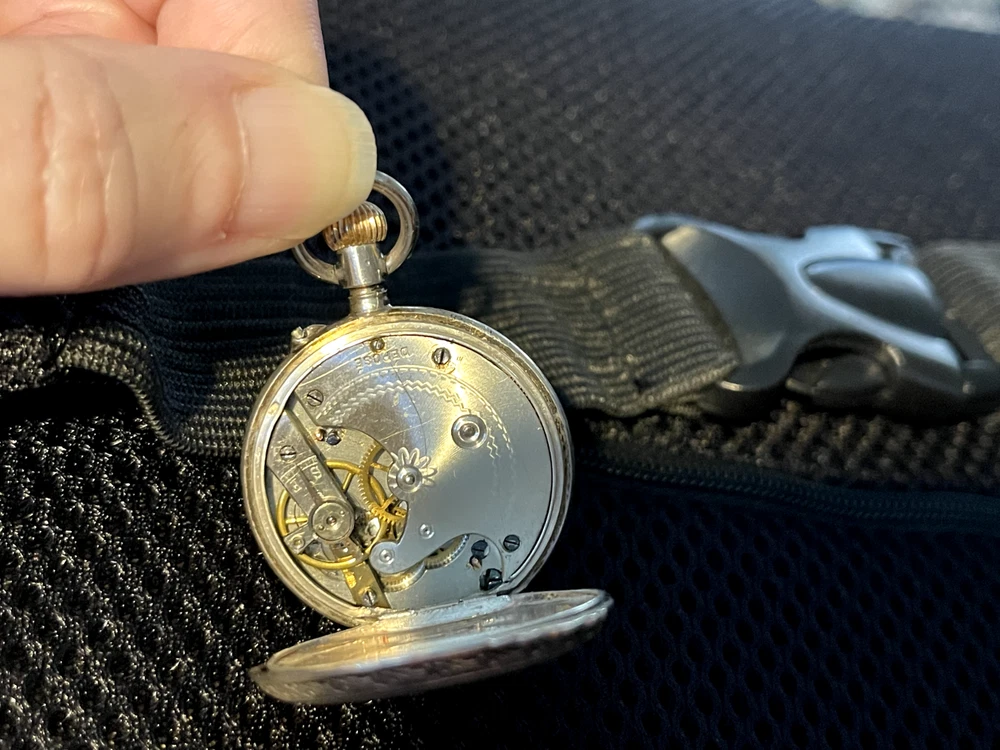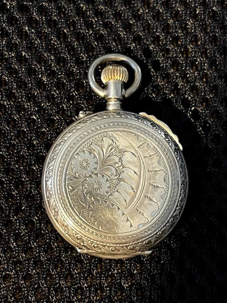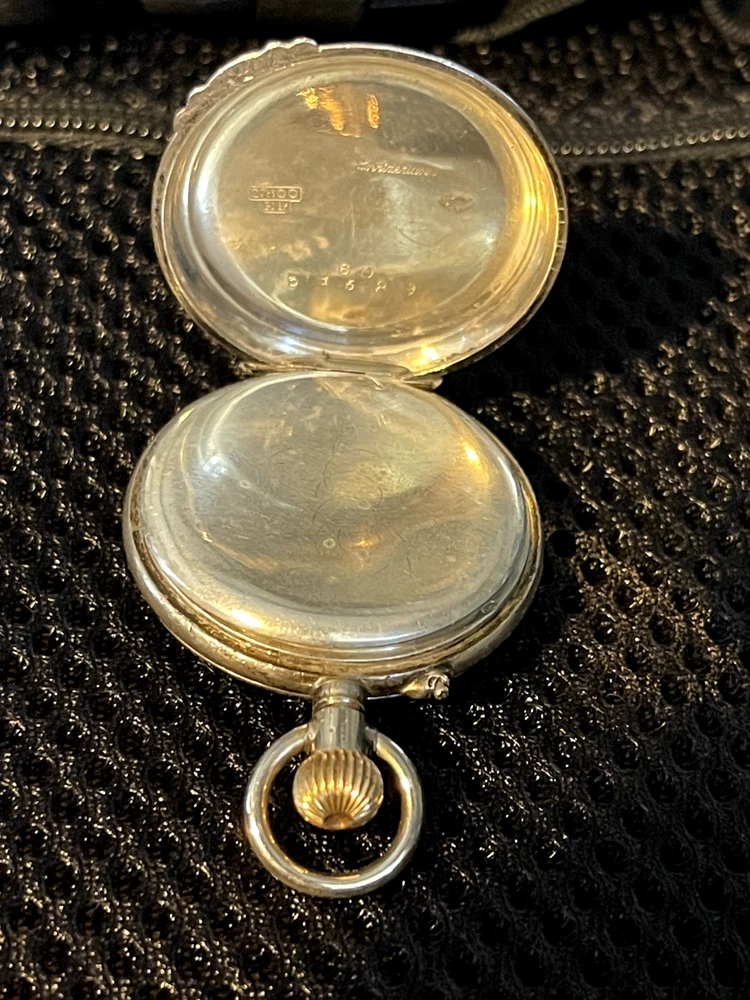 Gorgeous ladies open face pocket watch. It is unbranded (as far as I am willing to probe) it is 800 silver and made in Switzerland. This is a lever set watch with a porcelain enamel face. It is not running, I have had it in a jewelry box of a long time. It was always closed but some dust and humidity obviously is hindering it. Please ask any questions before bidding. I accept any reasonable offers and will combine shipping with multiple purchases.
