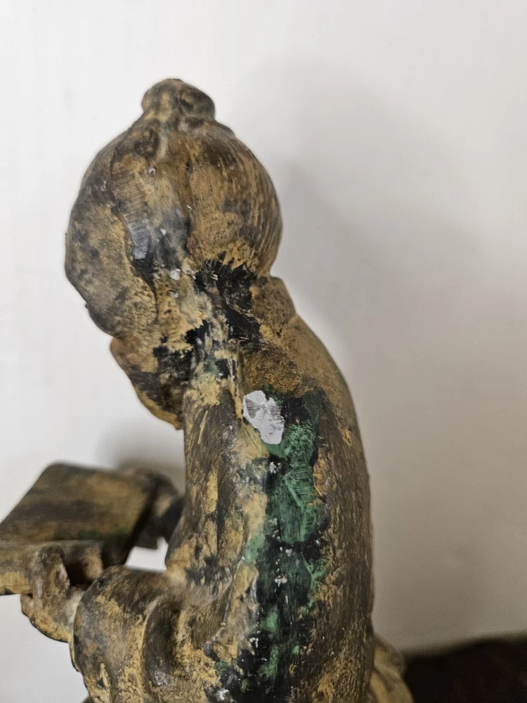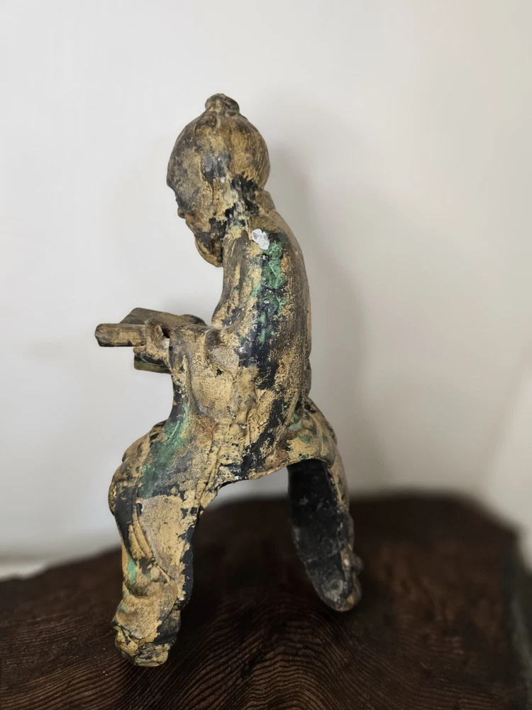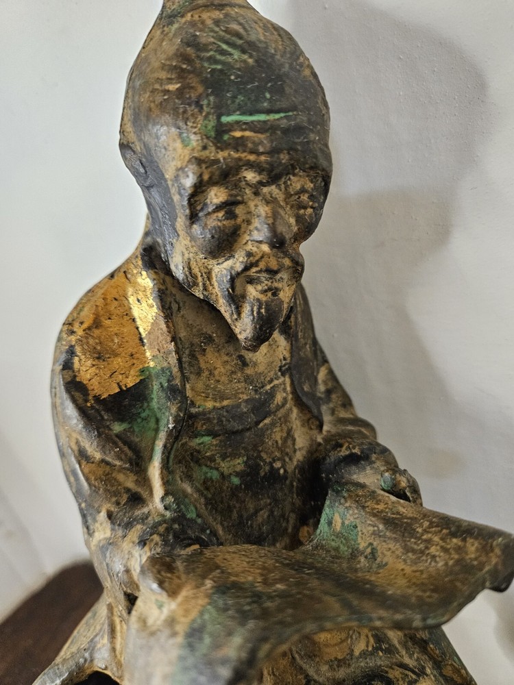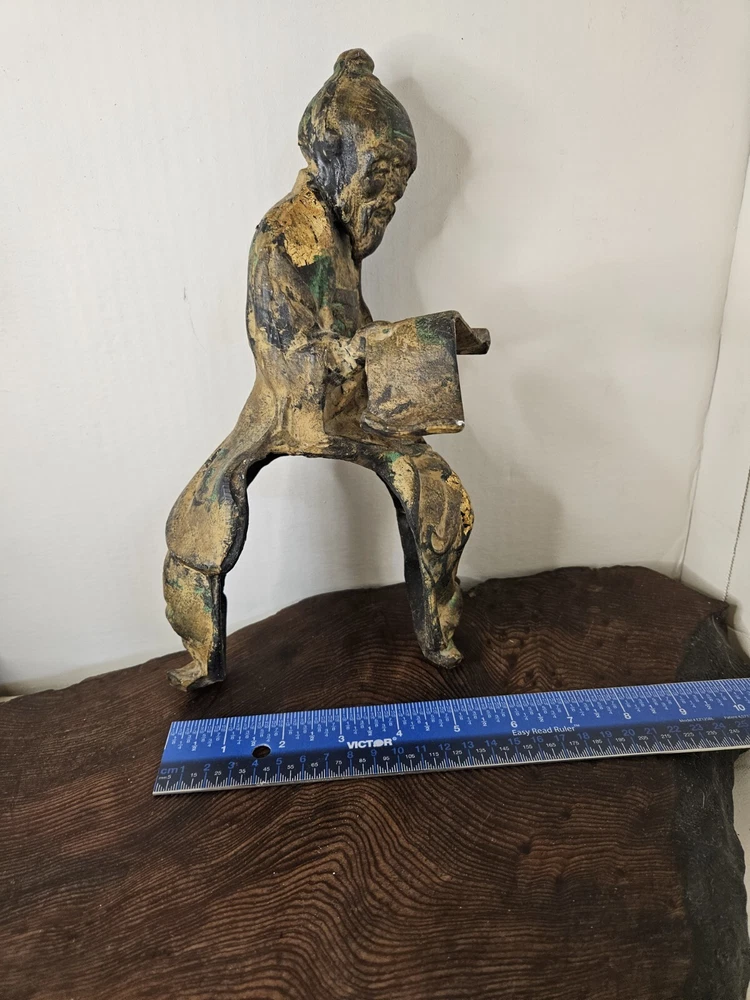 This antique cast iron Chinese roof tile features an old man reading a scroll, making it a rare and unique addition to any collection. The scroll pattern and Chinese style add to its decorative appeal. The material is cast iron, and the finish is antique. In addition to being a collectible, this piece can also be used as a decorative sculpture or figurine. The details on the old man's face and clothing, as well as the design, are sure to impress. Overall, this item is a great find for those interested in Chinese art and culture, and will make a wonderful addition to any home or collection.