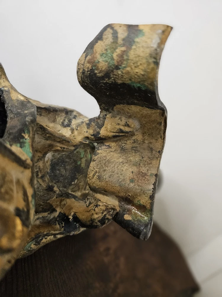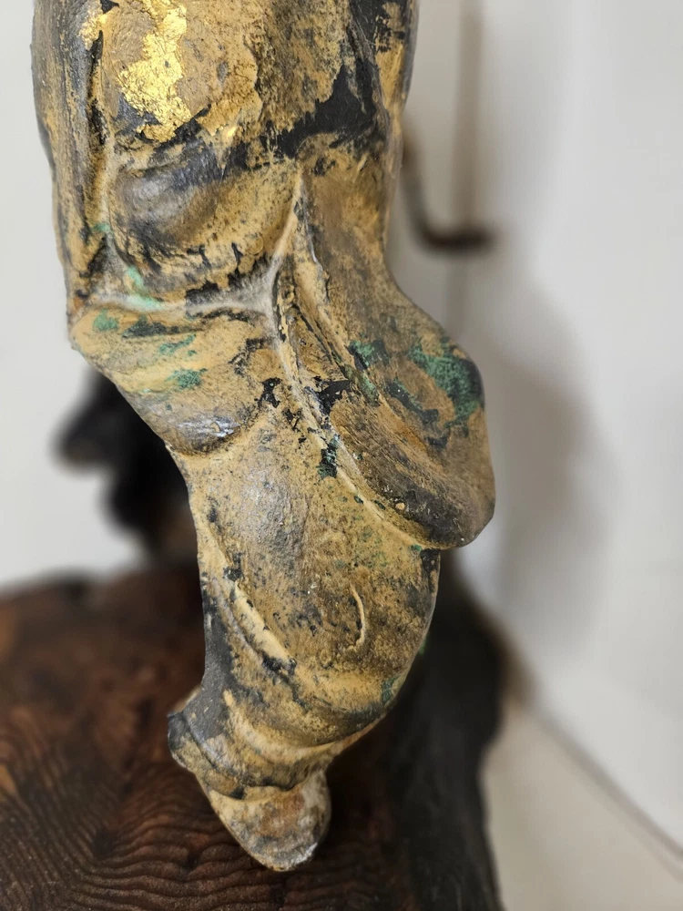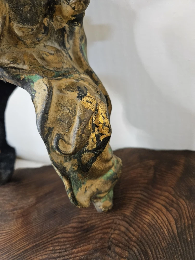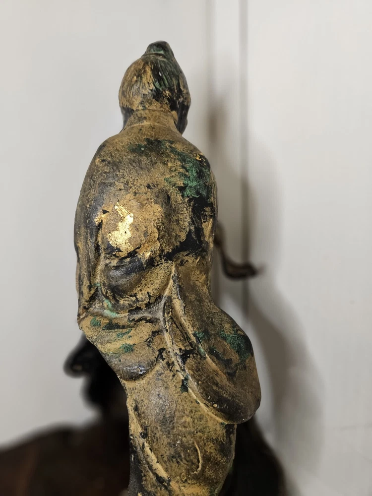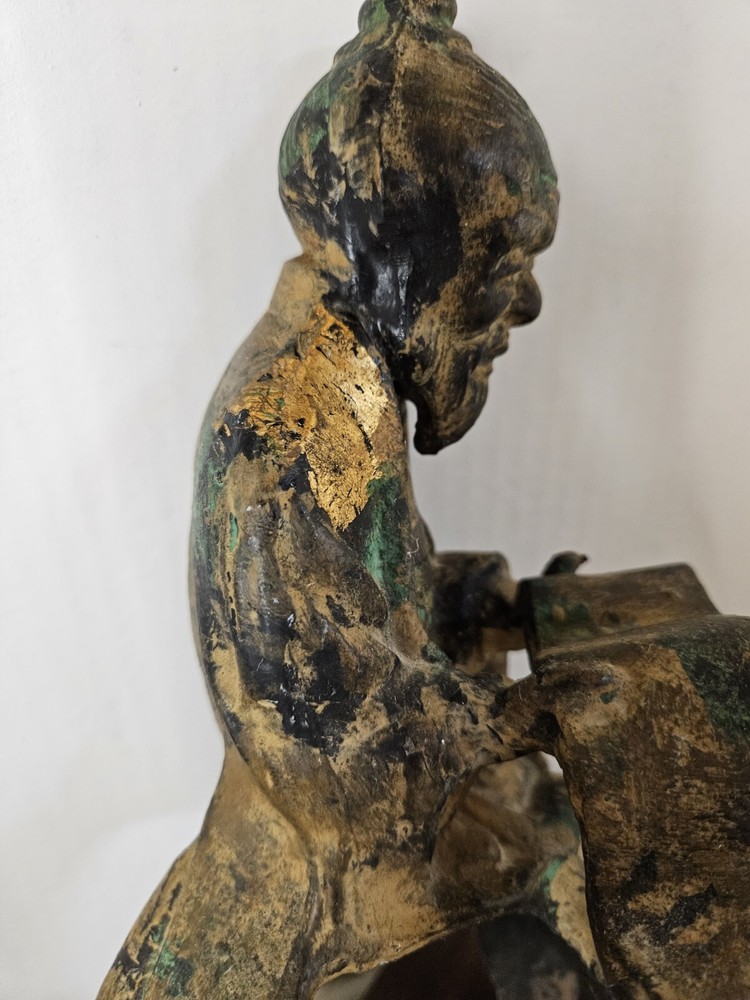 This antique cast iron Chinese roof tile features an old man reading a scroll, making it a rare and unique addition to any collection. The scroll pattern and Chinese style add to its decorative appeal. The material is cast iron, and the finish is antique. In addition to being a collectible, this piece can also be used as a decorative sculpture or figurine. The details on the old man's face and clothing, as well as the design, are sure to impress. Overall, this item is a great find for those interested in Chinese art and culture, and will make a wonderful addition to any home or collection.