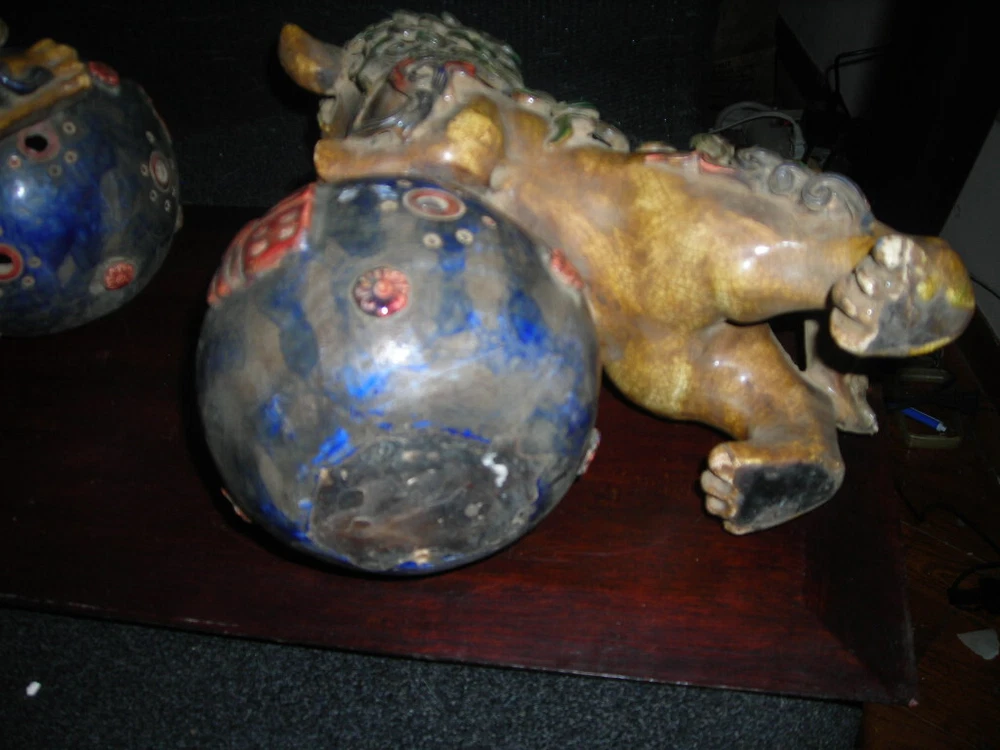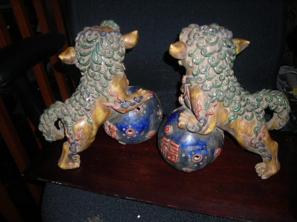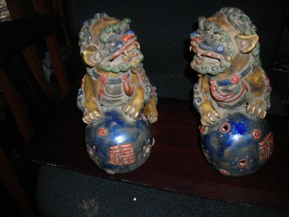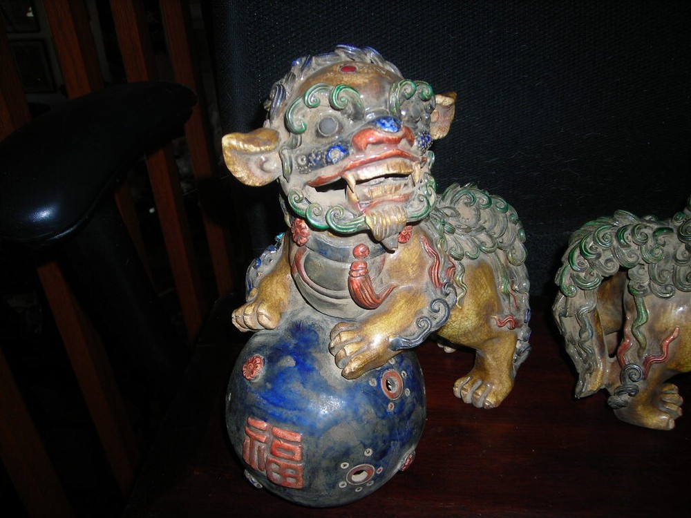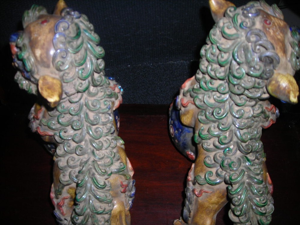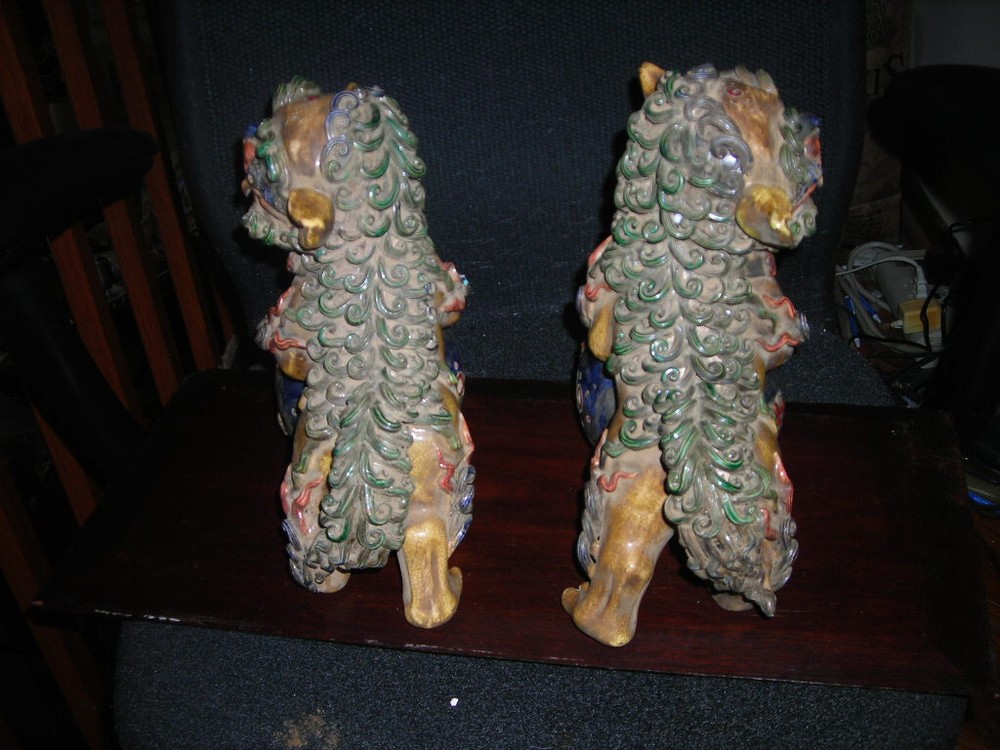 THESE ARE AN ANTIQUE PAIR OF CHINESE EARTHENWARE POLYCHROME FOO DOGS. THEY ARE 12X9X5. IN VERY GOOD CONDITION. A FEW TINY NICKS. THE FOO DOGS FACES HAVE A FIERCE LOOK. A VERY DECORATIVE PAIR. HARD TO DATE EXACTLY BUT SOME AGE. . S/H/I IS $35 THANKS
