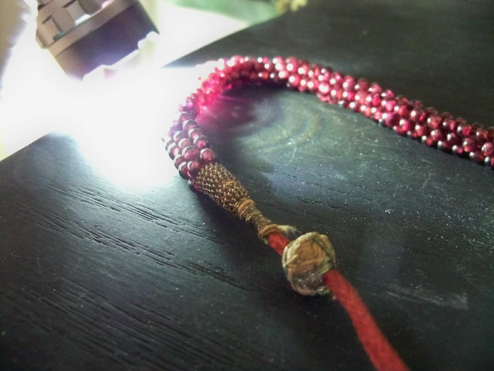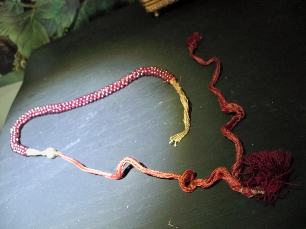 This antique garnet prayer bead necklace is a stunning piece with rich character—perfect for collectors or creative upcycling. The aged silk cord and intricate beads give it a beautiful boho charm. Though sold as-is, its unique Eastern design makes it a treasure for DIY projects, doll adornment, or jewelry restoration. The deep red garnets and vintage vibe add an exotic touch. A true find for lovers of old-world craftsmanship!
