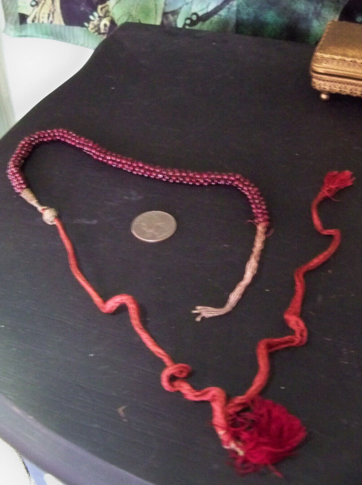 broken aged sold as-is as found. gorgeous old thing see u.s. quarter for size reference only. full length is approx 24" of corded full measure open, bead section is about 10". as is no return auction please, for diy upcycle adult collectors' doll clothes jewelry sewing craft statue adornment unknown or redo old lovely unknown Chinese Asian Himalayan or eastern design. no boxes or backgrounds, inventorykarmoireD1yellowpaper