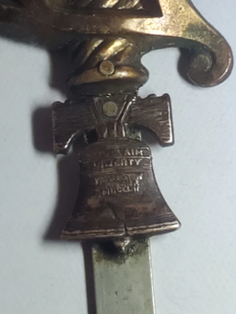 Antique letter opener, civil war sword design with liberty bell on handle. Overall length is 7", no markings besides the writing on the bell. Does have a little bow to it but not bad, could be flattened, tip isn't broken Great packaging and fast shipping