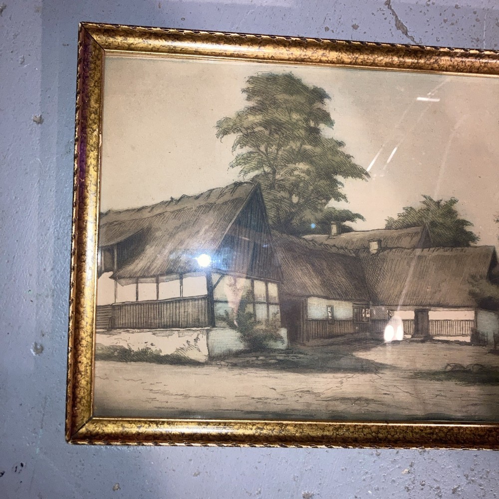 The product is an antique colored sketch depicting houses, featured in a framed original drawing. The piece is not signed, adding to its mystery and allure as an authentic and timeless artwork. This unique and vintage piece would make a charming addition to any art collection, adding a touch of history and character to any living space.