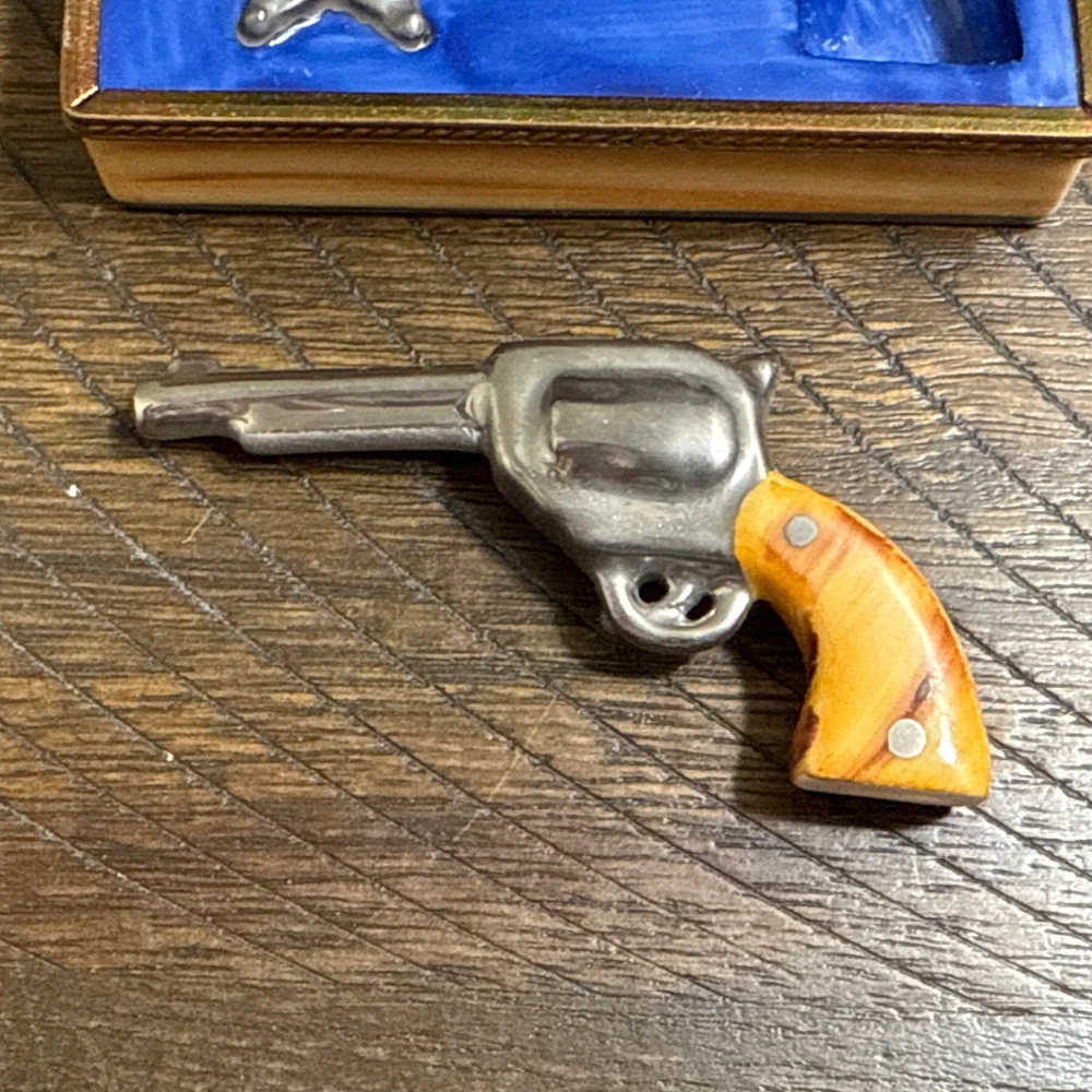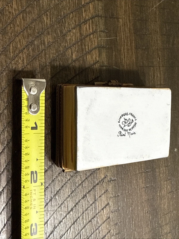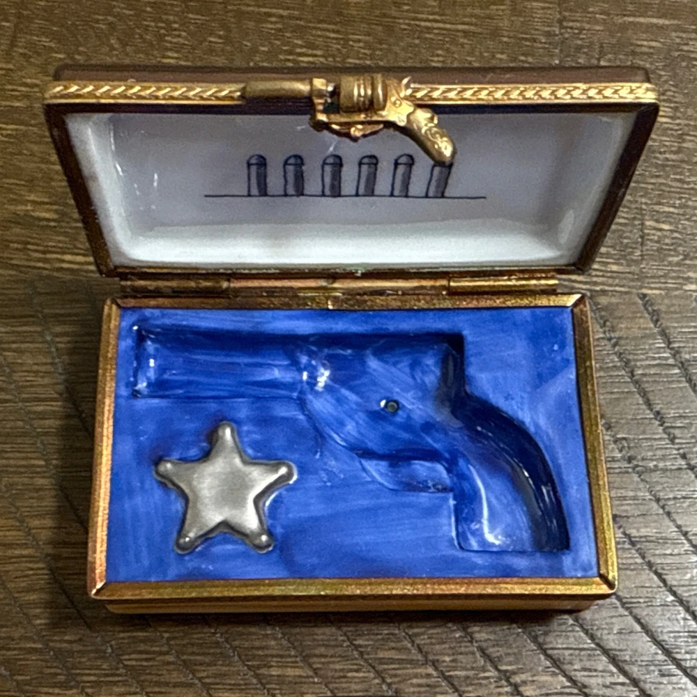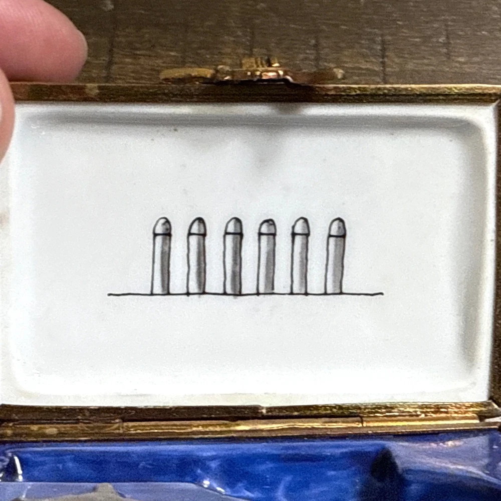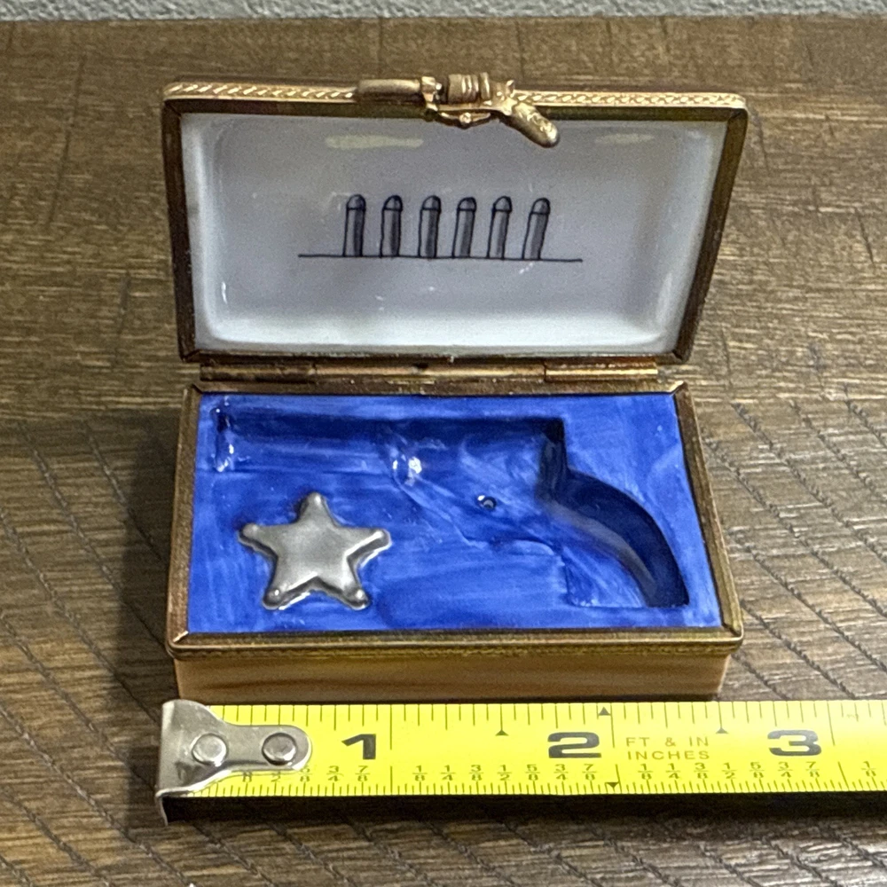 Great Condition. See photos. There is some green showing as shown in photos. I’m not sure if this is from oxidation from the metal or paint. See photos. This is a very rare piece, especially to have the gun trinket to go with it. I was told it is New Old Stock from a dealers inventory that has been in storage since the 1990s. Hand Painted - Limoges France