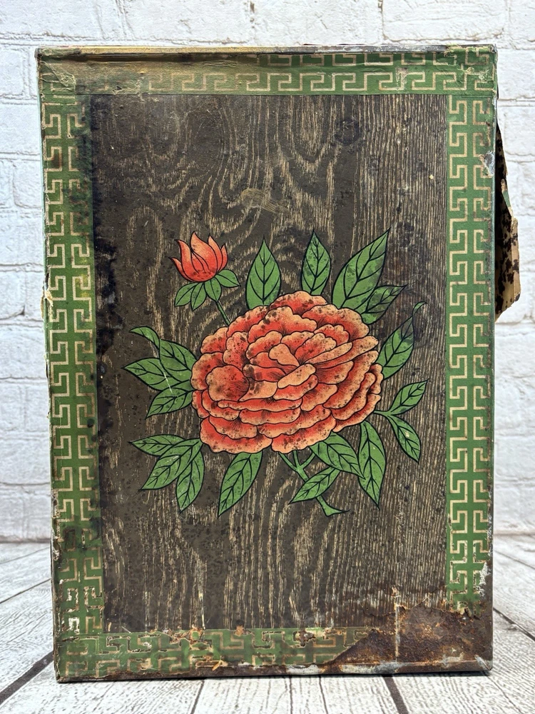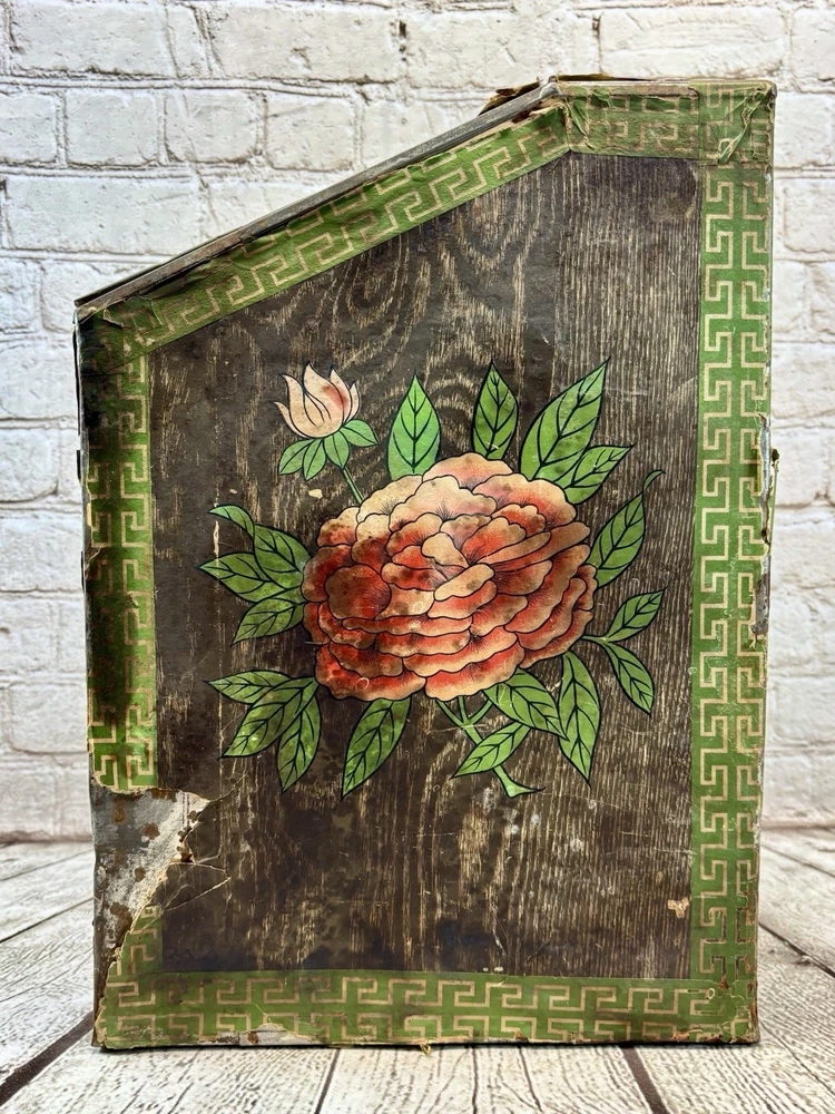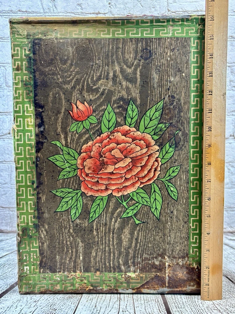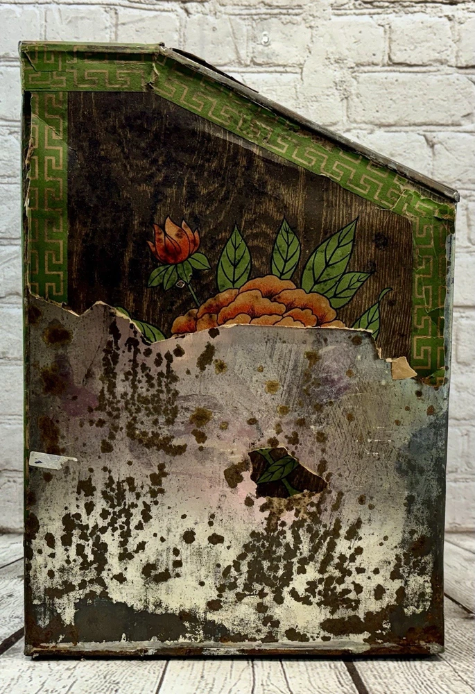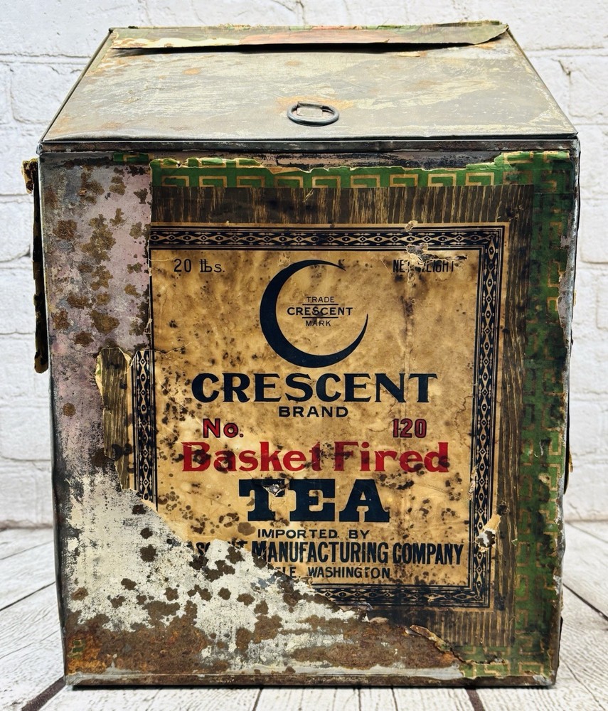 Antique Crescent Brand Basket Fired Tea Tin 20 lb Seattle WA General Store This is a scarce antique Crescent Brand “Basket Fired” Tea tin from Crescent Manufacturing Co., Seattle, Washington. Dating to the late 19th–early 20th century, this large 20-lb bin would have been used in a general store where customers purchased tea by weight. The tin features lithographed paper advertising on multiple panels, with Crescent branding on the front, floral side designs with green Greek-key borders, and a vivid interior lid image of tea pickers working beneath Mount Fuji. •Brand: Crescent Brand •Product: Basket Fired Tea •Company: Crescent Manufacturing Co., Seattle, Washington •Era: Late 1800s–early 1900s general store bin •Size: Approx. 16” tall x 11.5” wide x 11” deep •Design: Paper litho advertising with bold Crescent logo, floral sides, and interior scenic tea field illustration •Condition: Fragile state with paper loss and wear. Front label approx. 70% present; one floral side very good; opposite side heavily worn; interior lid scene remains colorful. Some loose label fragments inside if buyer wishes to stabilize or conserve. Lid hinge intact and functional. A true survivor of Pacific Northwest advertising history, this large Crescent tea bin was made for everyday store use rather than display alone. Rare in any condition and visually striking, it makes an excellent statement piece for collectors of antique advertising, tea/coffee memorabilia, and Seattle history. Ships securely.