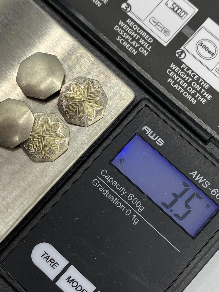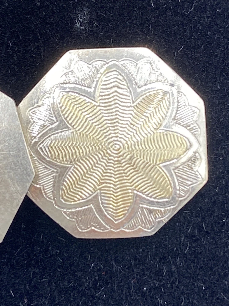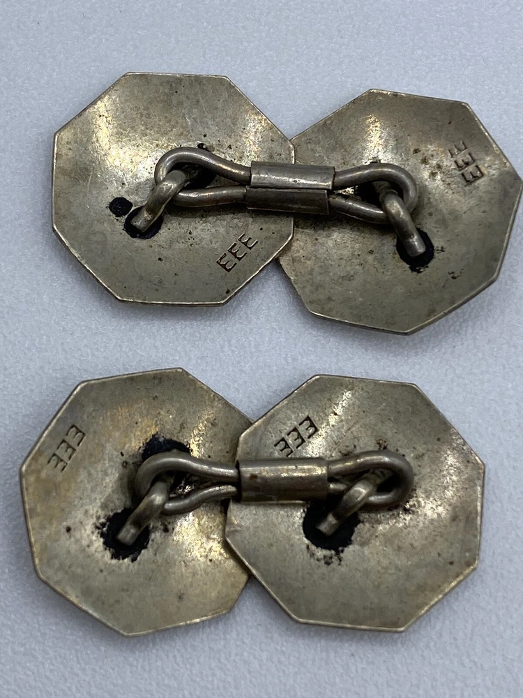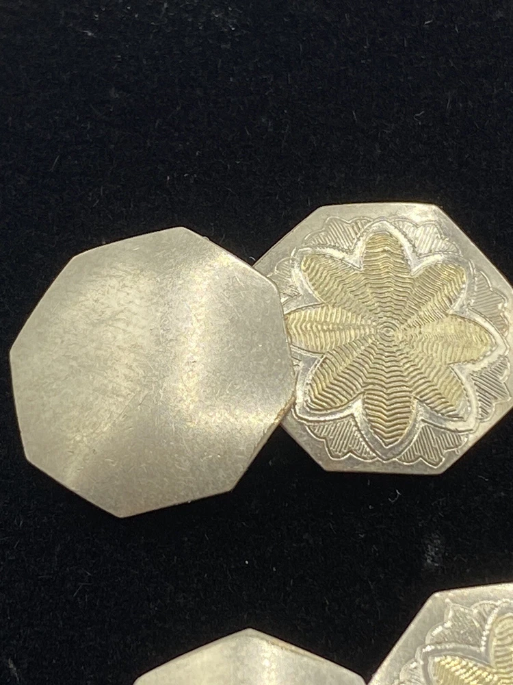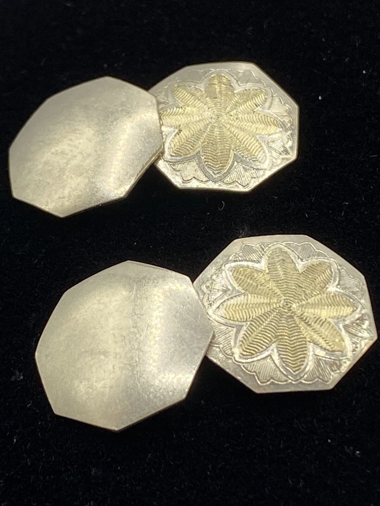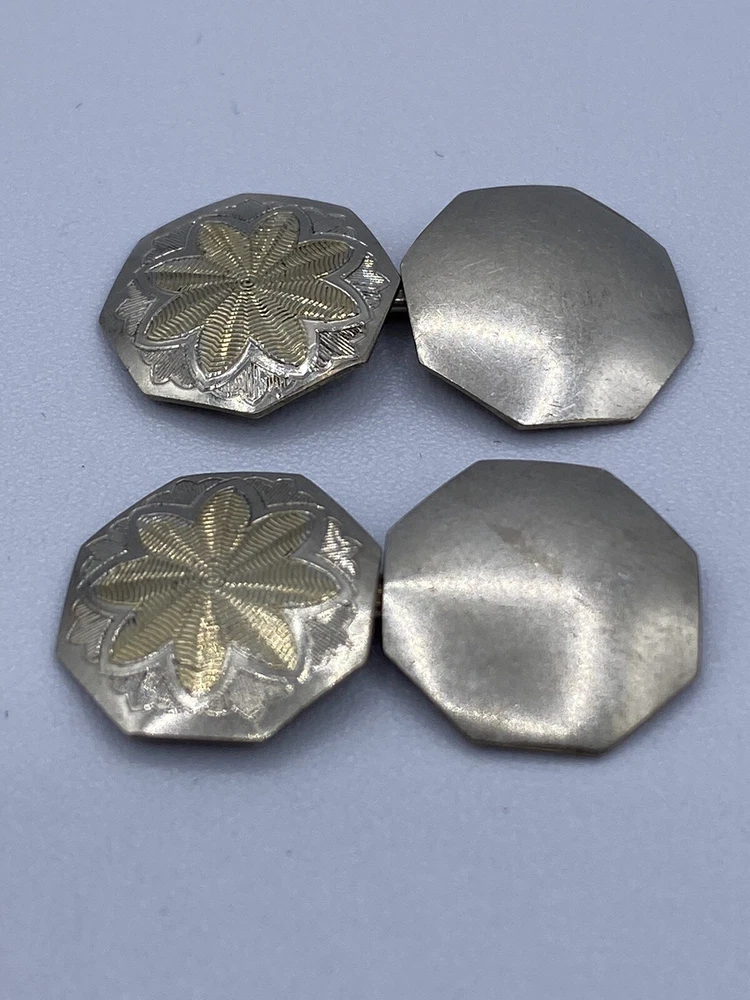 Very beautiful cufflinks. Each stamped on the back with the maker mark EEE. They have a gold starburst type design on one side and are plain silver on the second side. Really pretty. Shipped USPS
