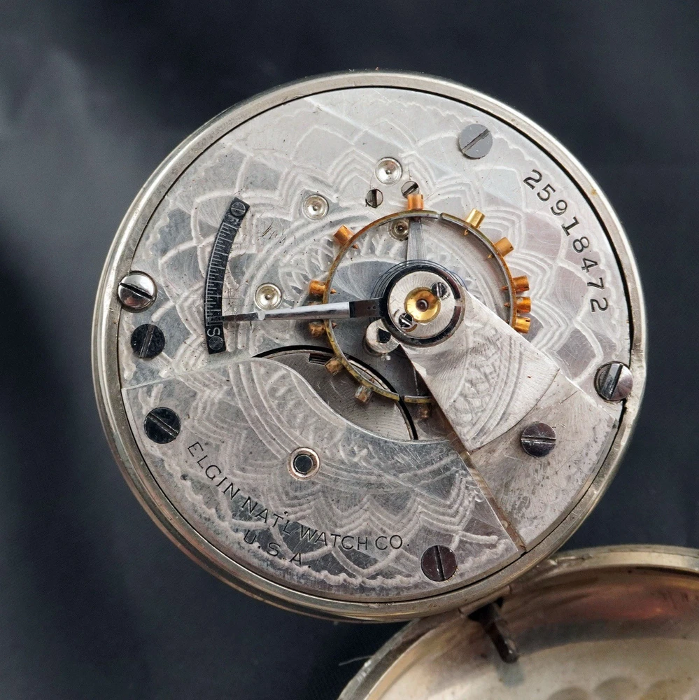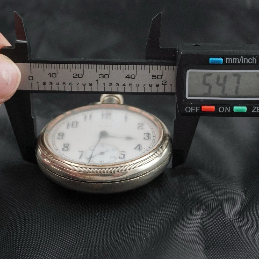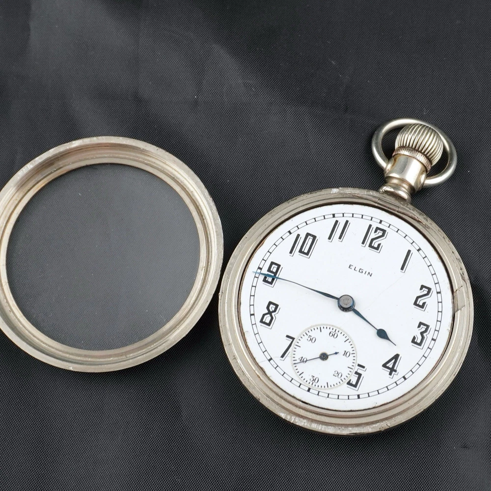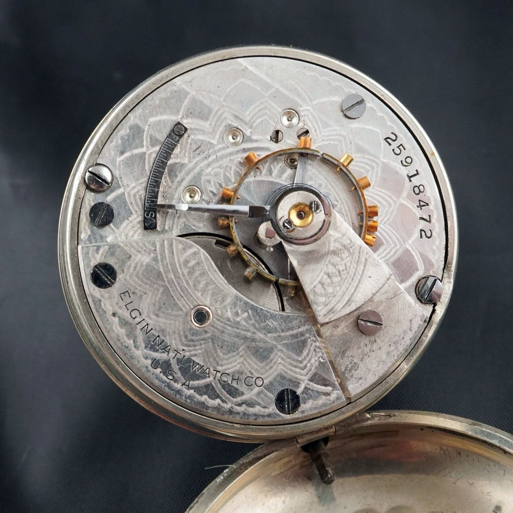 For sale is a vintage Elgin pocket watch, Grade 218, made in 1923 by the Elgin National Watch Company, U.S.A. This is a classic 18-size, full-plate, manually wound timepiece with a pendant setting. The movement is currently ticking, and the balance wheel runs, but the second hand is not moving — likely due to a disengaged or worn gear in the train. Still, this watch is an excellent candidate for display, repair, or restoration. ⸻ 📌 Details: • Brand: Elgin National Watch Co. • Serial Number: 25918472 • Grade: 218 • Model: 5 • Size: 18s (54.7 mm case) • Jewels: 15 • Setting: Pendant • Plate: Full Plate • Production Year: c.1923 • Movement Type: Mechanical, Manual Wind • Case Material: Nickel • Dial: Enamel, bold black numerals with sub-second dial • Hands: Blued steel • Condition: • Movement runs, balance ticks • Second hand not moving • Dial has visible hairline cracks • Case shows normal wear from age