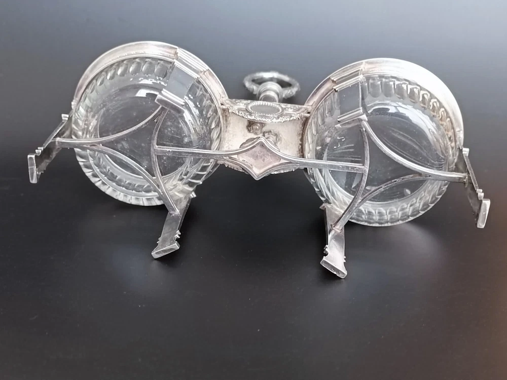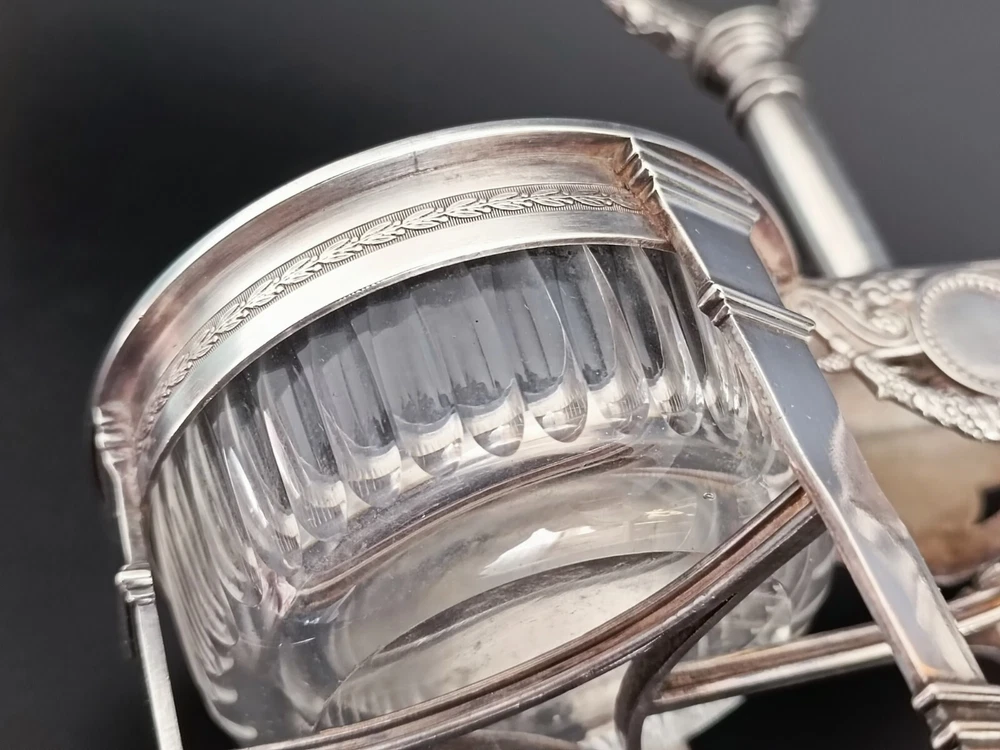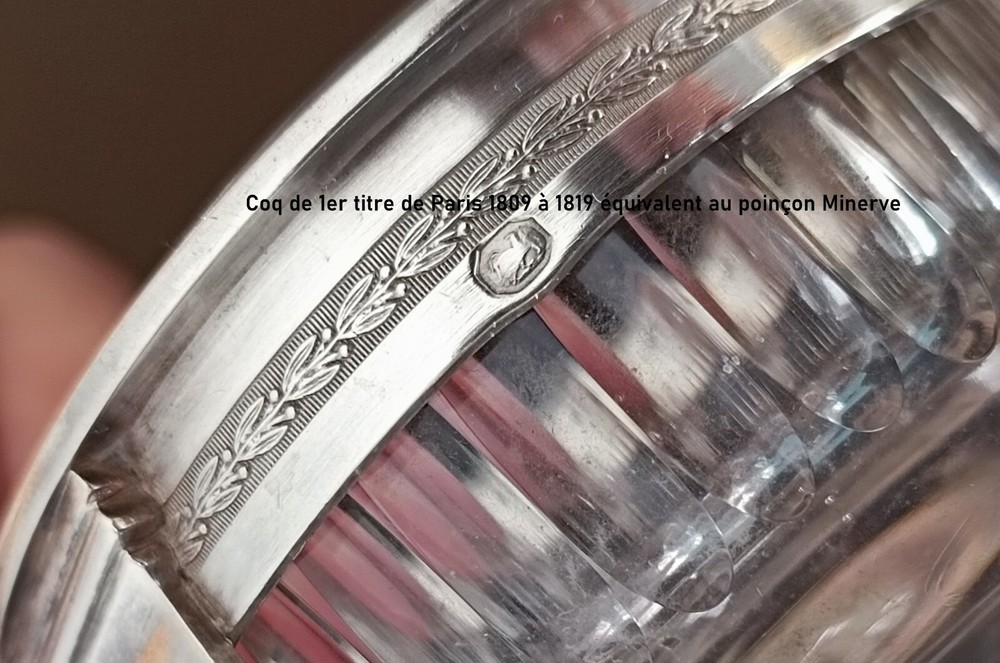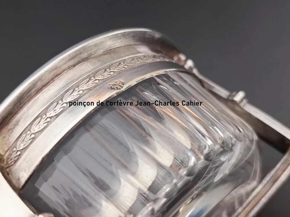 Magnifique saleron ancien en argent massif, réalisé entre 1809 et 1819, signé par l'orfèvre Jean-Charles Cahier, orfèvre officiel des rois Louis XVIII et Charles X. Le saleron présente un superbe travail d'argent finement ciselé, typique du style Empire. Les deux pots en cristal d'origine sont en bon état, sans dommages. La structure en argent est marquée du poinçon Coq de 1er titre de Paris (en usage entre 1809 et 1819) ainsi que des poinçons de garantie de l'époque. Une pièce de collection rare et prestigieuse. Dimensions : 15 cm de hauteur, poids total : 237 g. saleron ancien, argent Empire, JC Cahier, orfèvre royal, cristal d'origine, salière ancienne, argent massif, poinçon Coq, Empire 1809-1819, collection argent, argenterie française, collection Empire, art de la table, service à table ancien, pièce de collection, orfèvre de la couronne, Louis XVIII, Charles X, saleron en cristal, rare argenterie, objets d'art Empire, décoration de table, objets de collection, antiquités Empire, saleron d'argent, argenterie signée, objets rares, accessoire de table Empire, ustensiles d'argent, saleron d'époque, art antique, art décoratif, antiquités de luxe, collection de luxe, pièces historiques, objets anciens, accessoire en cristal, argenterie XIXe siècle, collection royale, argent historique, service de condiments, art en argent massif, collection prestigieuse, argenterie Empire, saleron en argent, argent 19e siècle, accessoires de cuisine anciens, décoration en argent, objet d'époque Empire, pièce unique, collection d'orfèvre, rare collection Empire, art de la table ancien, orfèvre Louis XVIII, service en argent, ustensile de cuisine argent, rare objet d'art, collection Jean-Charles Cahier, décoration argentée, argenterie royale, accessoire d'orfèvre, objets de collection ancienne, objet de table antique, collection de pièces d'argent, antiquités françaises, service de table en argent, collection historique, ustensiles de cuisine Empire, décor de table en cristal, accessoires anciens, ustensile de table en argent, collection de luxe en argent, art de collection Empire, décoration historique, collection d'art français, pièce d'époque en argent.