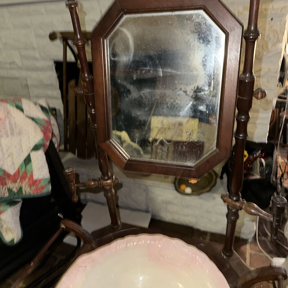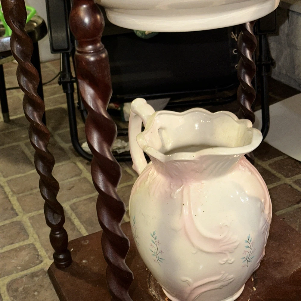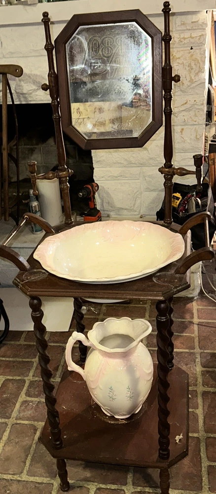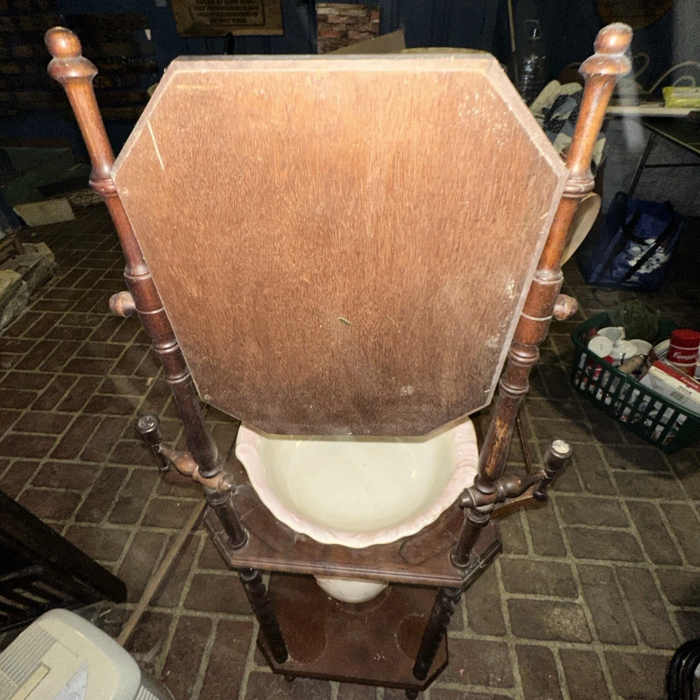 This antique washboard and pitcher stand is a stunning piece of Victorian history. Crafted from solid wood, it exudes elegance and durability. The stand features a unique design with a dry sink, mirror, and candle holders, making it perfect for any home. The washboard and pitcher stand dates back to the 1900s and is an excellent addition to any antique collection. It has been well-maintained and still retains its original charm. This piece is perfect for anyone looking to add a touch of history to their home decor. Does not include the chair unless requested and added shipping and chair price of $50 making total of chair and washbowl and pitcher stand with mirror and chair total cost $300 plus shipping