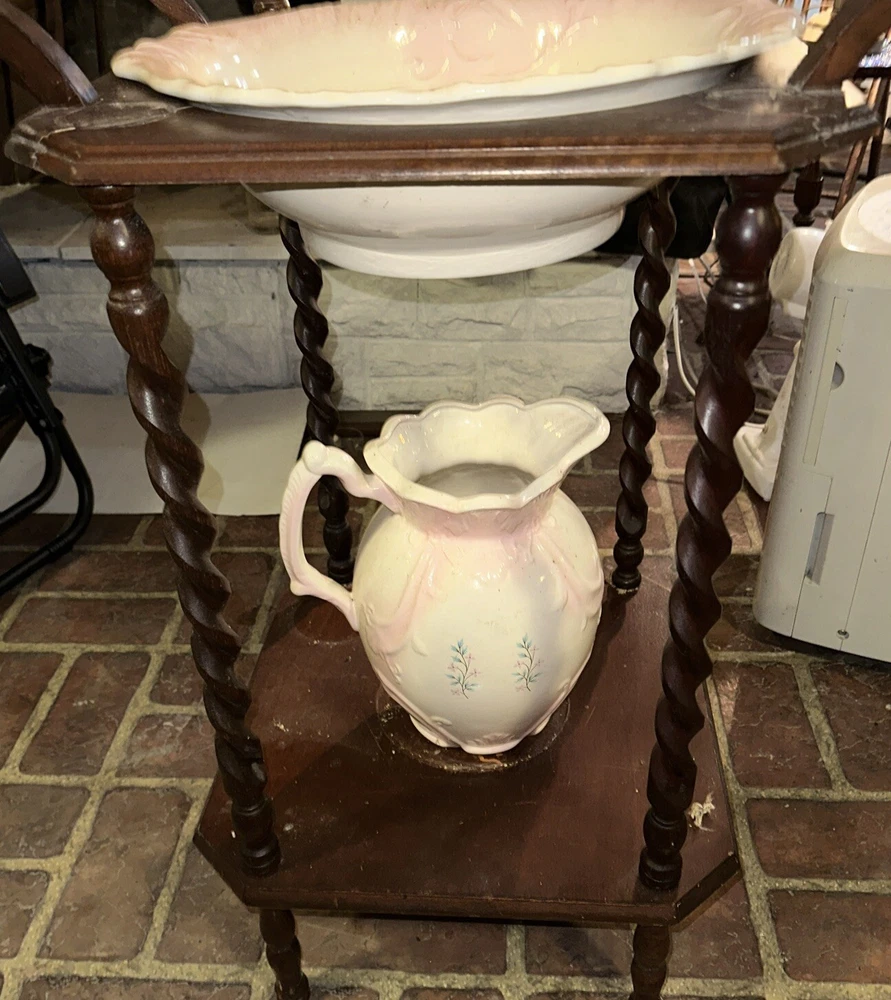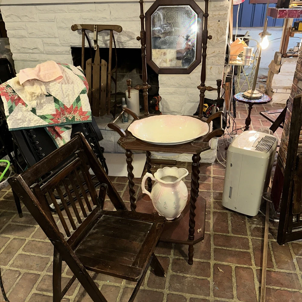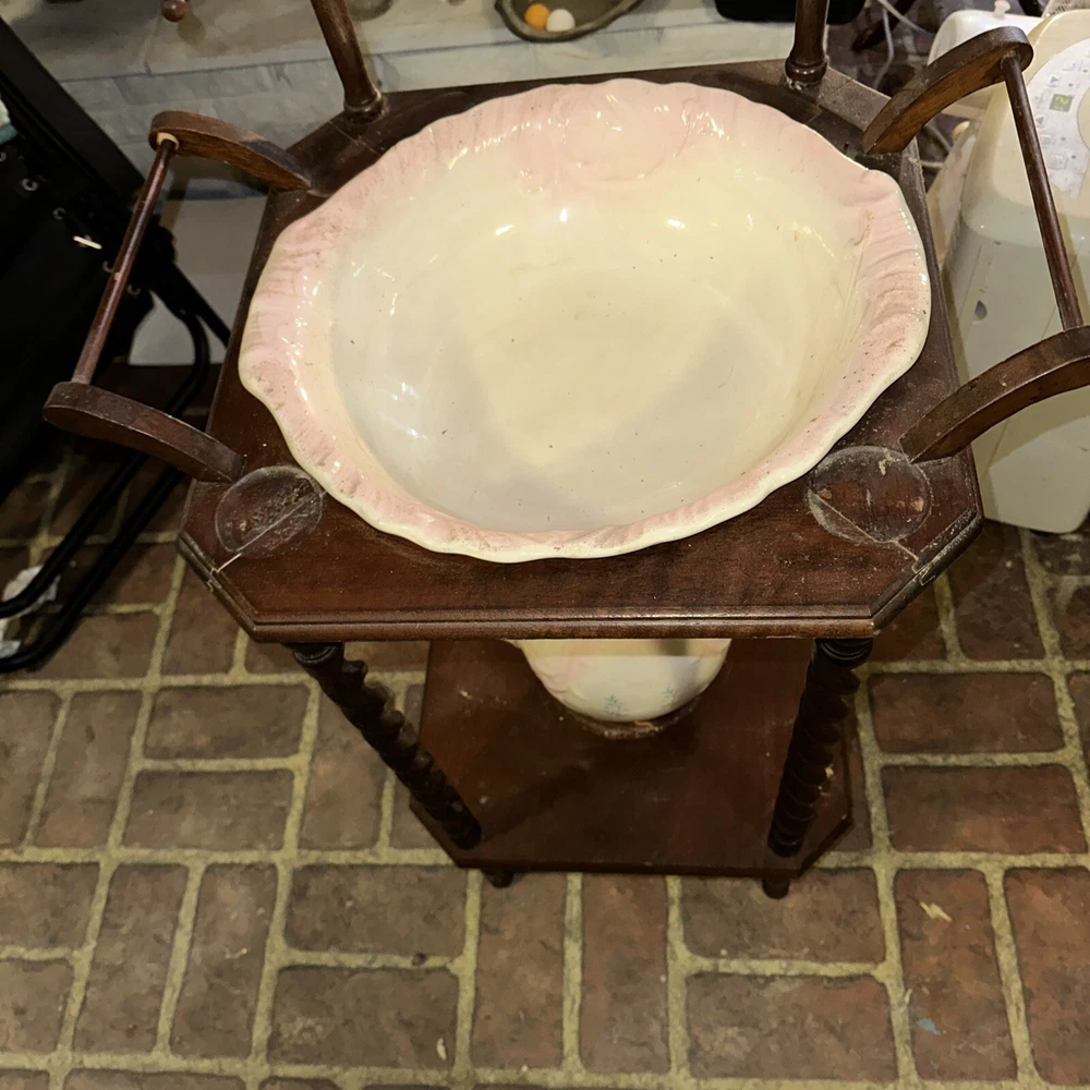 This antique washboard and pitcher stand is a stunning piece of Victorian history. Crafted from solid wood, it exudes elegance and durability. The stand features a unique design with a dry sink, mirror, and candle holders, making it perfect for any home. The washboard and pitcher stand dates back to the 1900s and is an excellent addition to any antique collection. It has been well-maintained and still retains its original charm. This piece is perfect for anyone looking to add a touch of history to their home decor. Does not include the chair unless requested and added shipping and chair price of $50 making total of chair and washbowl and pitcher stand with mirror and chair total cost $300 plus shipping
