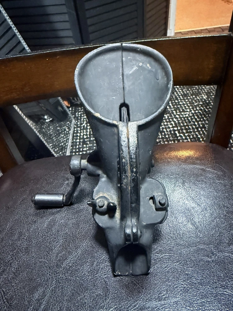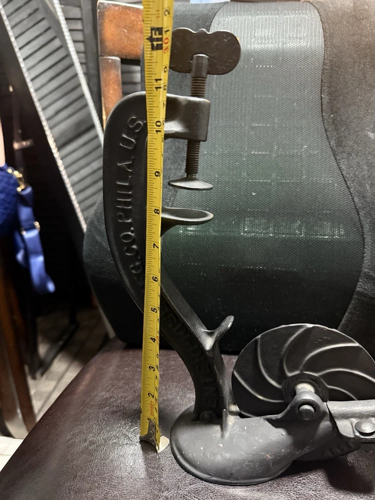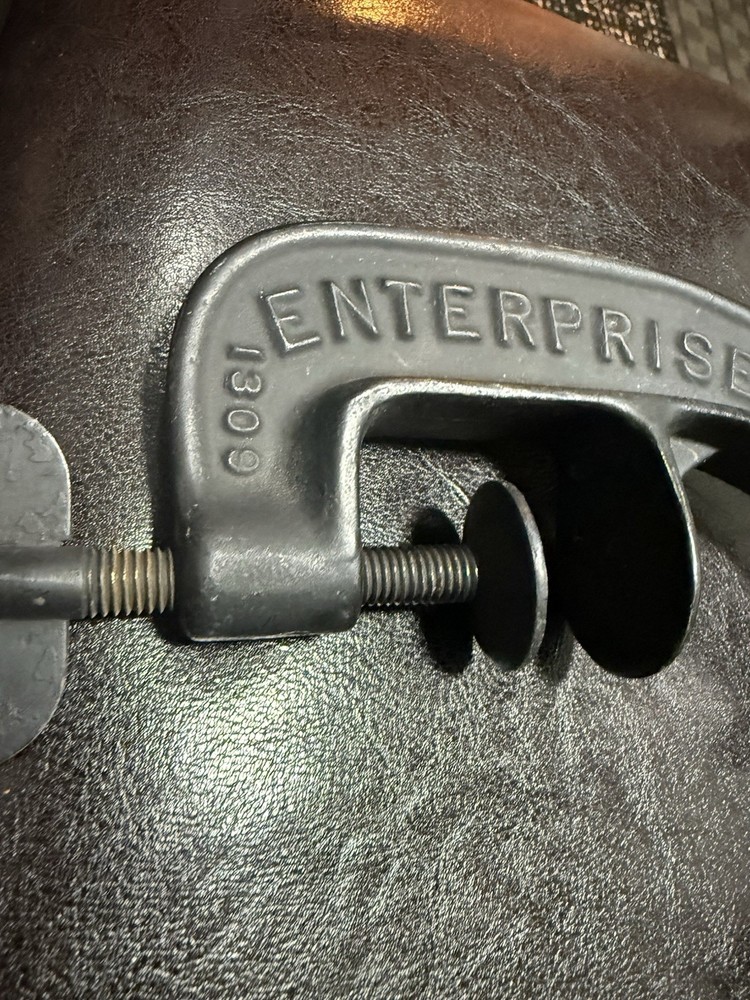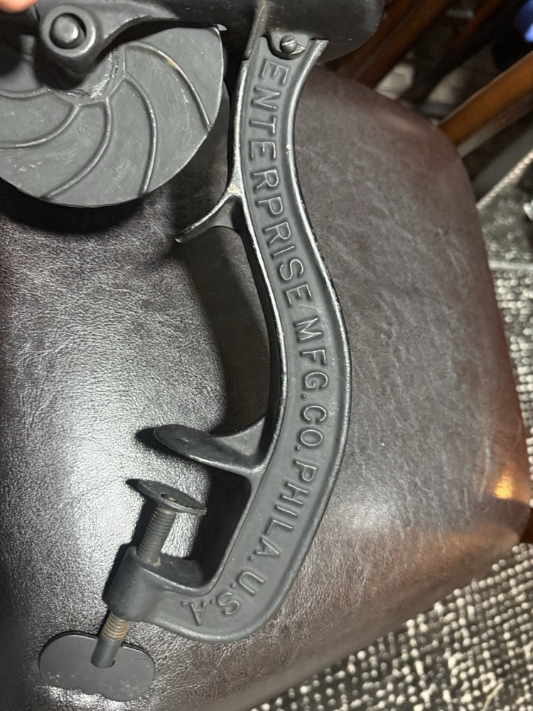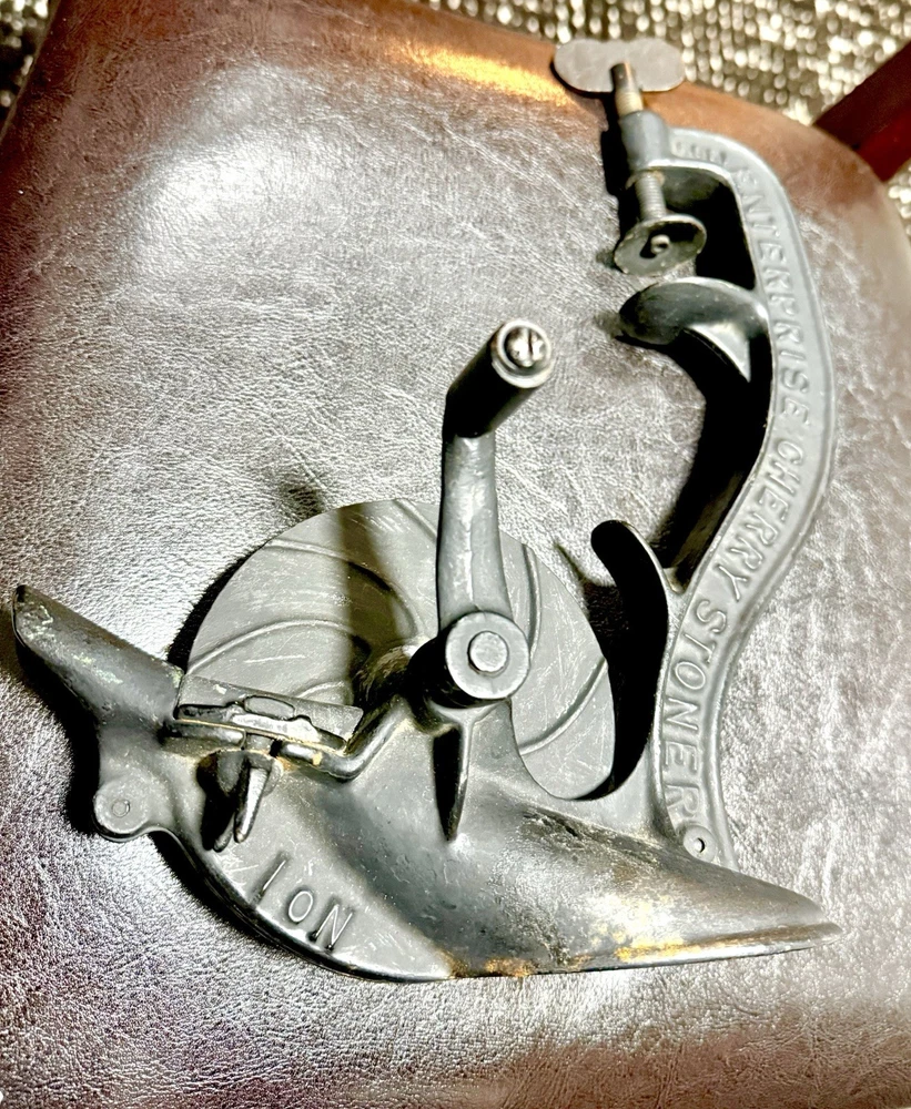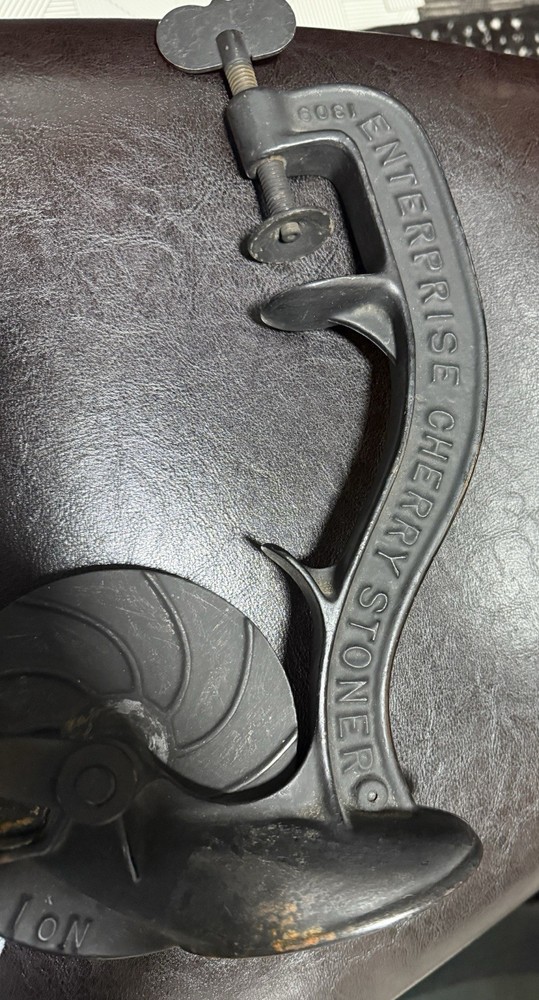 A classic piece of early American kitchen equipment, this Enterprise No. 1 Cherry Stoner was manufactured in Philadelphia, PA by the well-known Enterprise Mfg. Co., a leader in durable cast iron tools around the turn of the 20th century. Originally designed for efficiently removing pits from cherries, this piece is now highly sought after for both functional use and farmhouse/primitive décor. 🔧 Features • Heavy-duty cast iron construction • Original hand crank and table clamp • Marked: “ENTERPRISE MFG CO. PHILA U.S.A.” • Model: No. 1 Cherry Stoner • Casting number: 1309 • Smooth-operating crank mechanism 🧾 Condition • Very good antique condition with original aged patina • Normal surface wear consistent with age and use • Mechanism turns smoothly • Clamp is complete and functional • No cracks or structural damage observed This piece retains its original finish and has not been repainted.