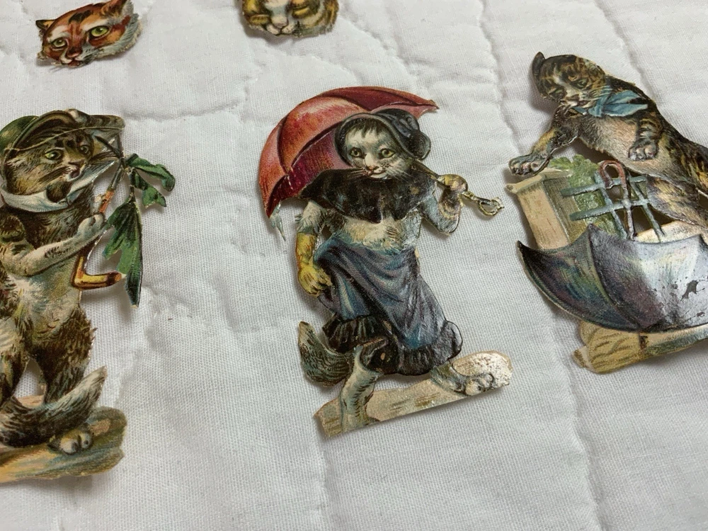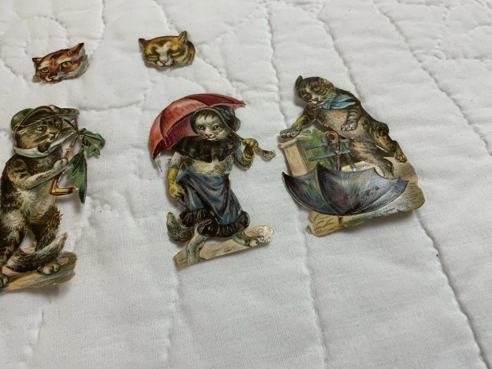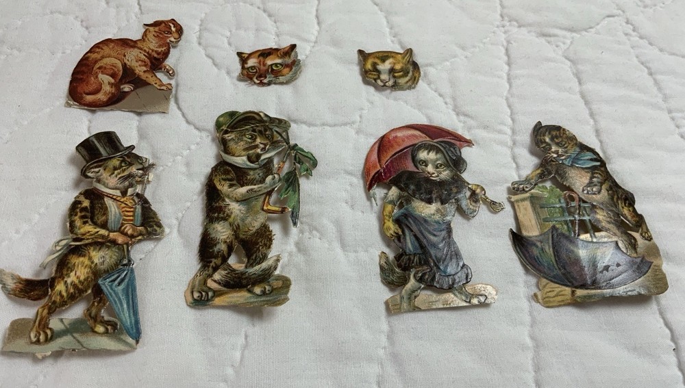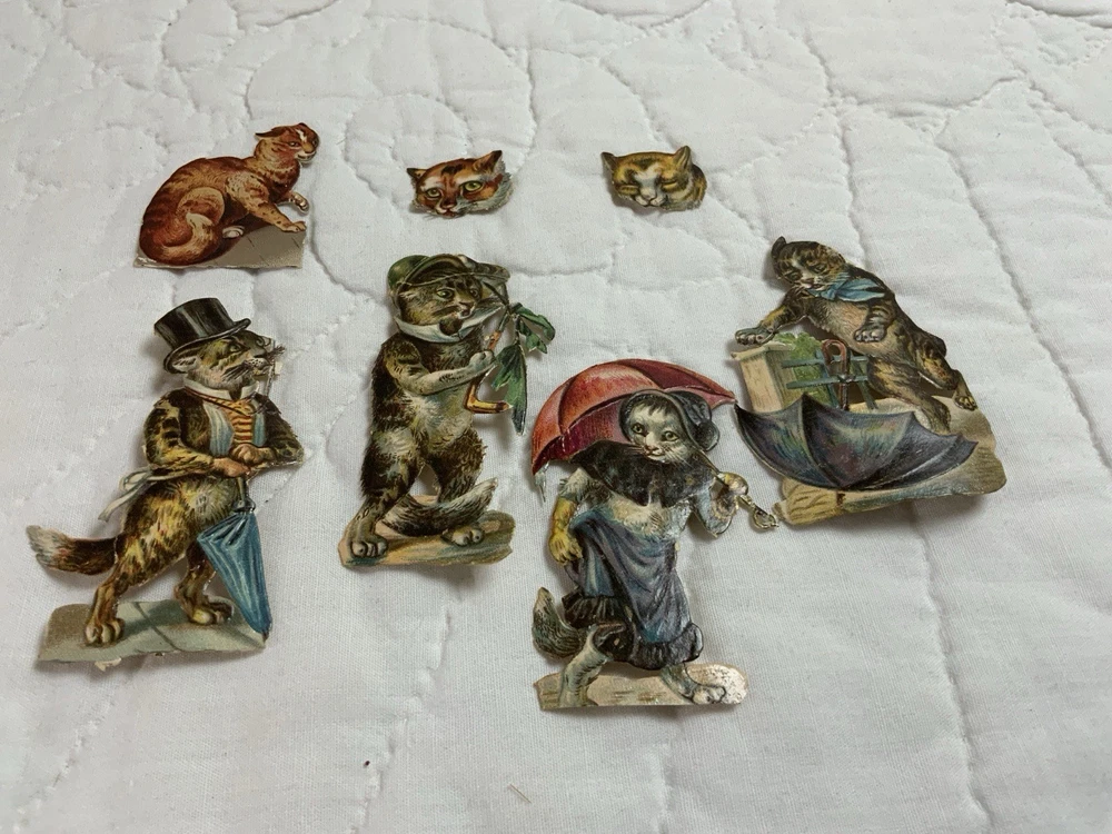 Up for sale is a lot of 7 Victorian die cuts. Anthropomorphic cats with umbrellas, cat faces. Super cute. Original Victorian era ephemera. Almost no damage. Sold as shown. Refer to all pictures. 7 - cats 🌼🐦⬛❤️ Thanks and happy shopping. I will combine shipping. Please visit my ebay store: webbsamericancounry1 for over 2000 vintage and collectible items. 🛶🪰🐇