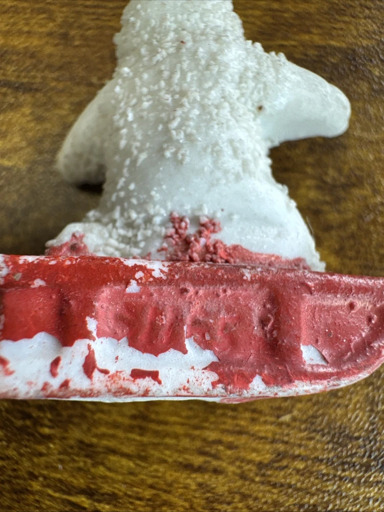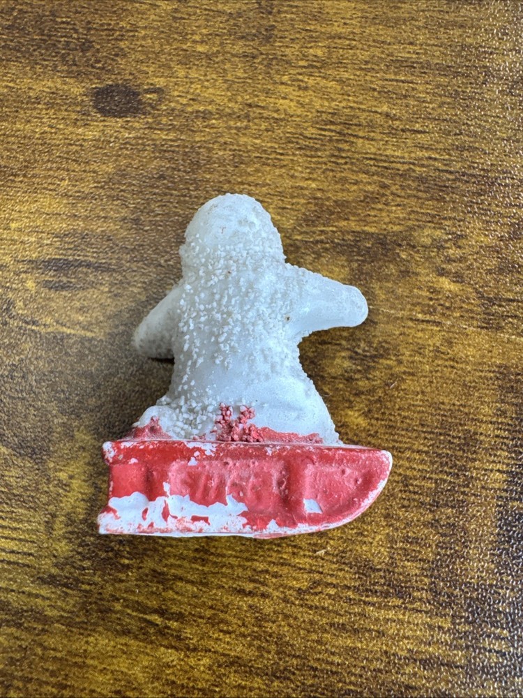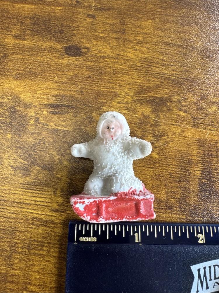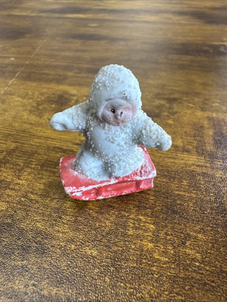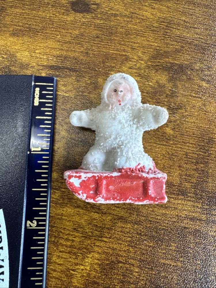 This antique German Snowbabies figurine features a small baby on a red sled, measuring 1.5 inches in length. Perfect for Christmas collectors, this unique and charming piece is a special addition to any holiday decor. With its vintage design and German craftsmanship, this figurine captures the essence of Christmas nostalgia and tradition.