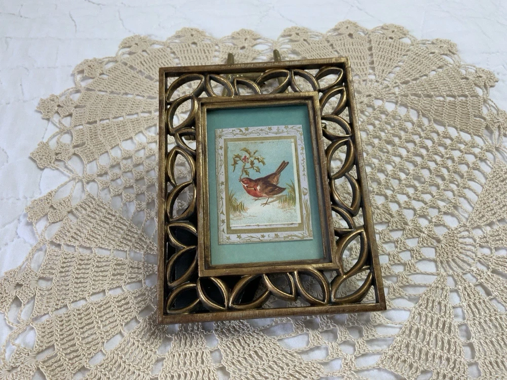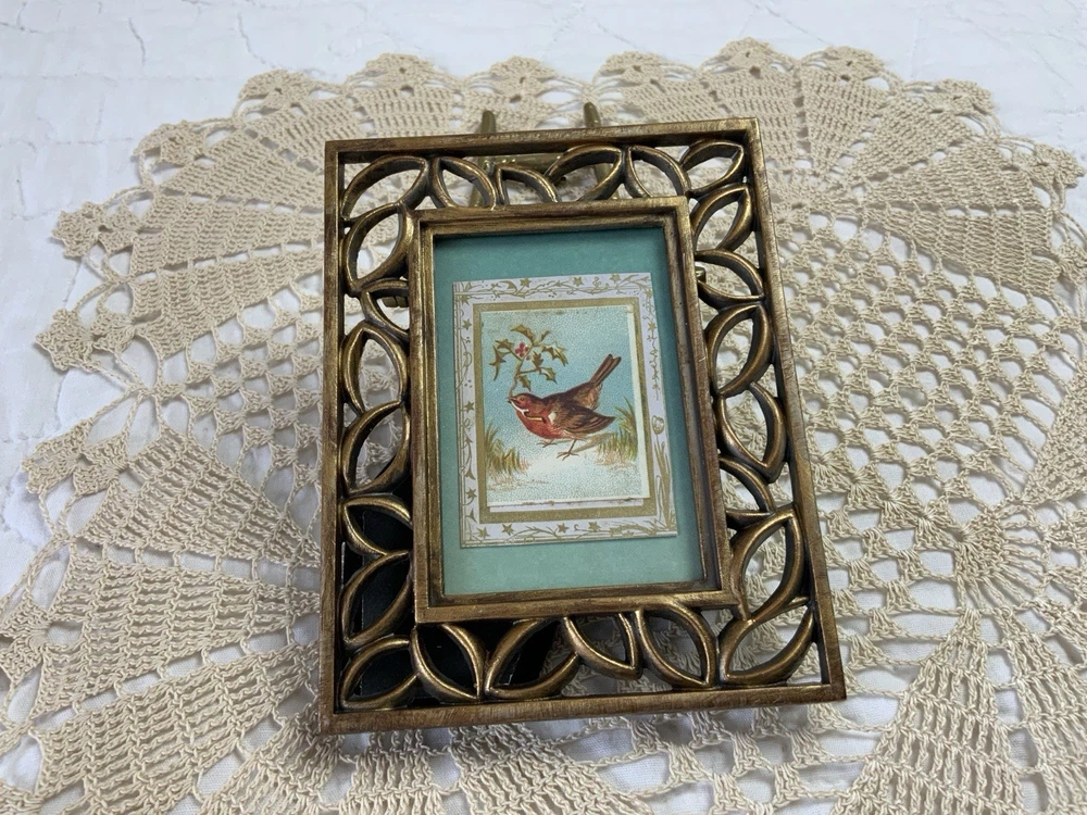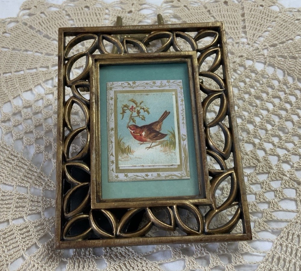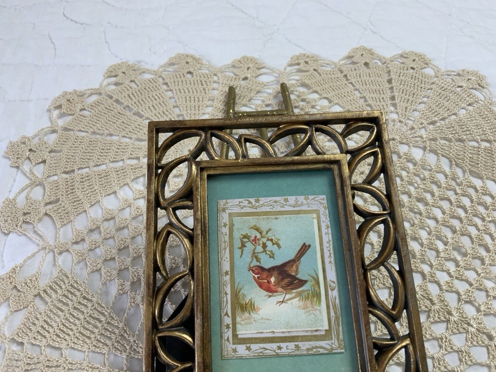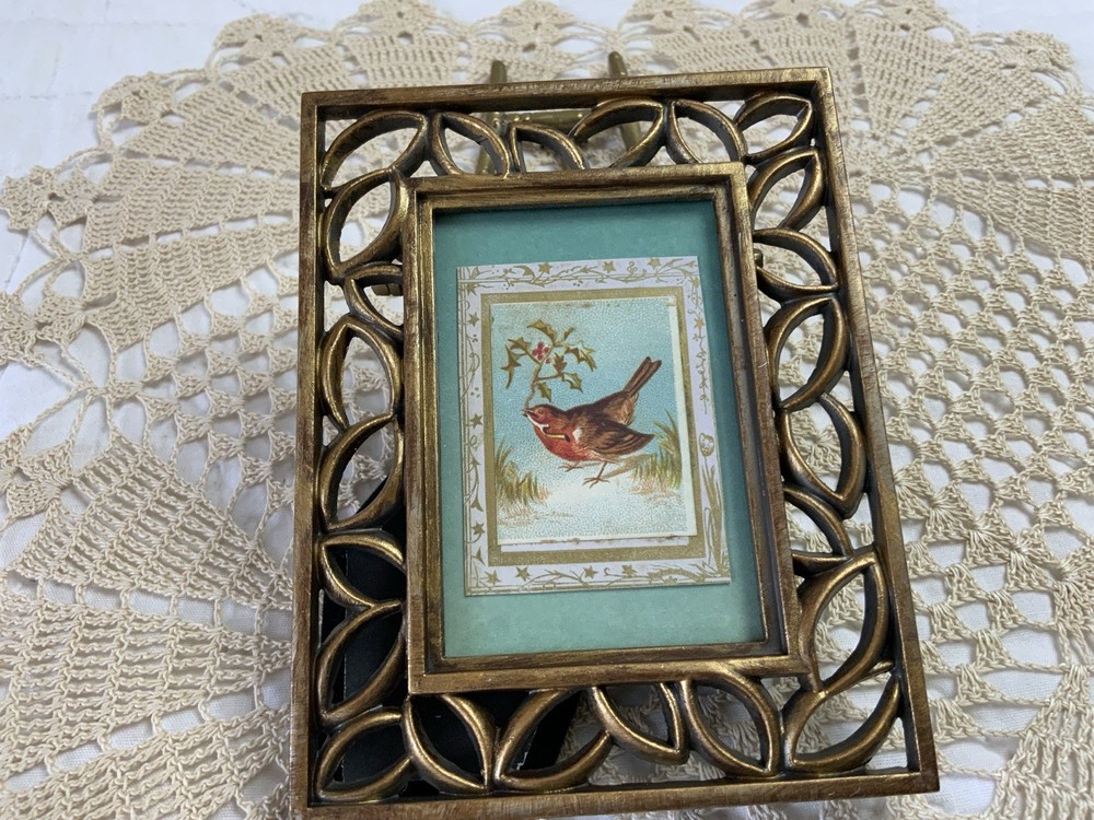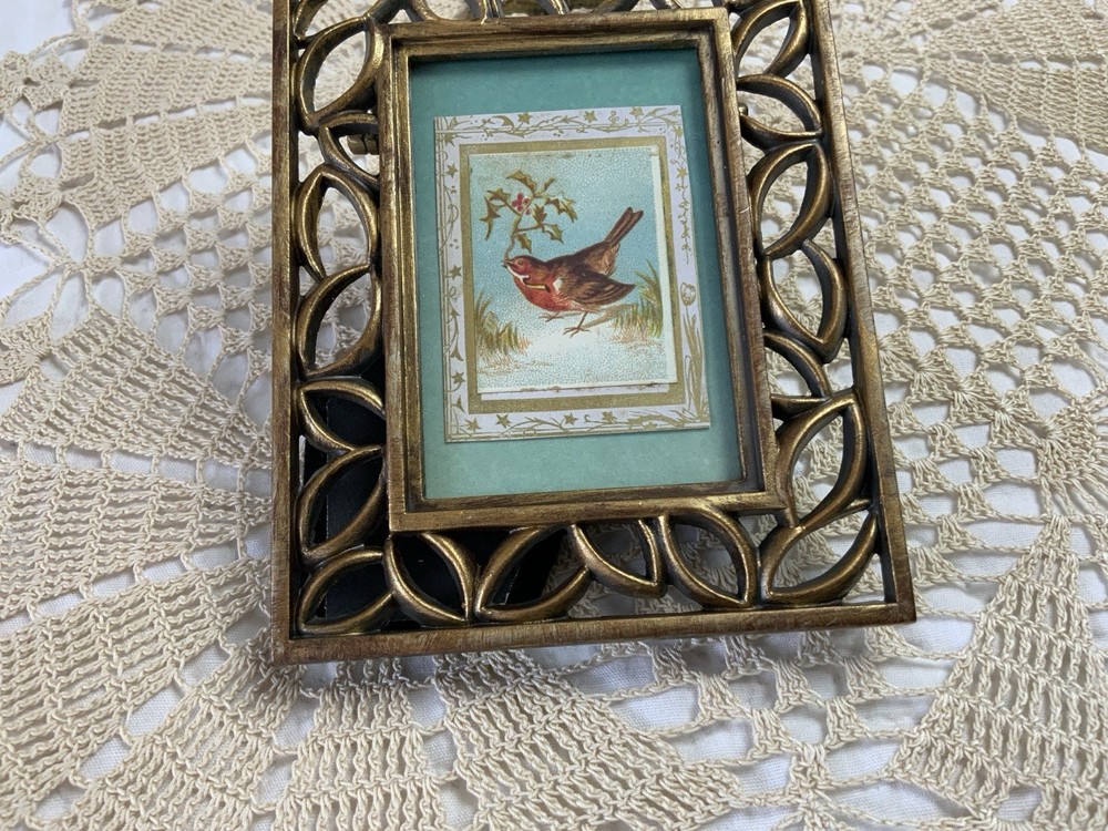 Up for sale is antique framed Victorian trade card ephemera. Bird with leaves. Cut to this size. From the early 1900’s. Aqua wallpaper background. Metal frame with scrolls. Distressed gold tone finish. Frame is not vintage. With glass. The colors are blue, brown, green, off white, multi. Very, very good condition. Measures 3 1/2” by 4 5/8”. Thanks and happy shopping. I will combine shipping. Please visit my ebay store: webbsamericancounry1 for over 2000 vintage and collectible items.
