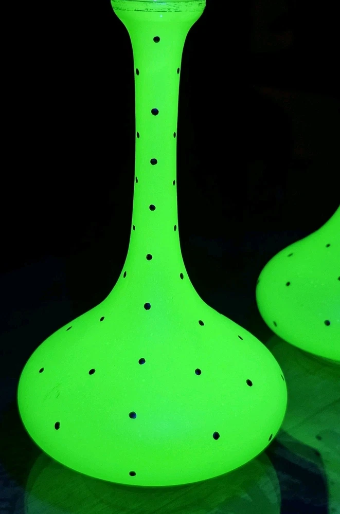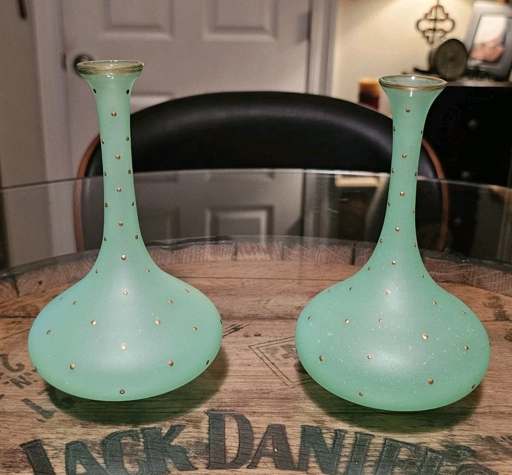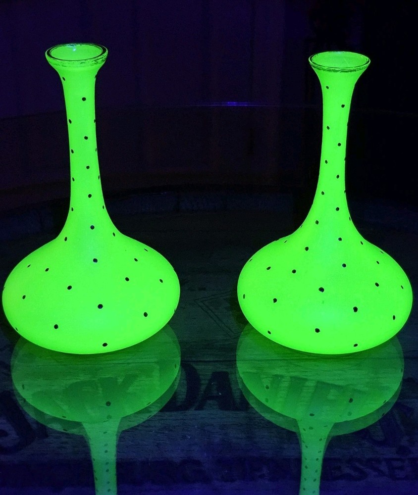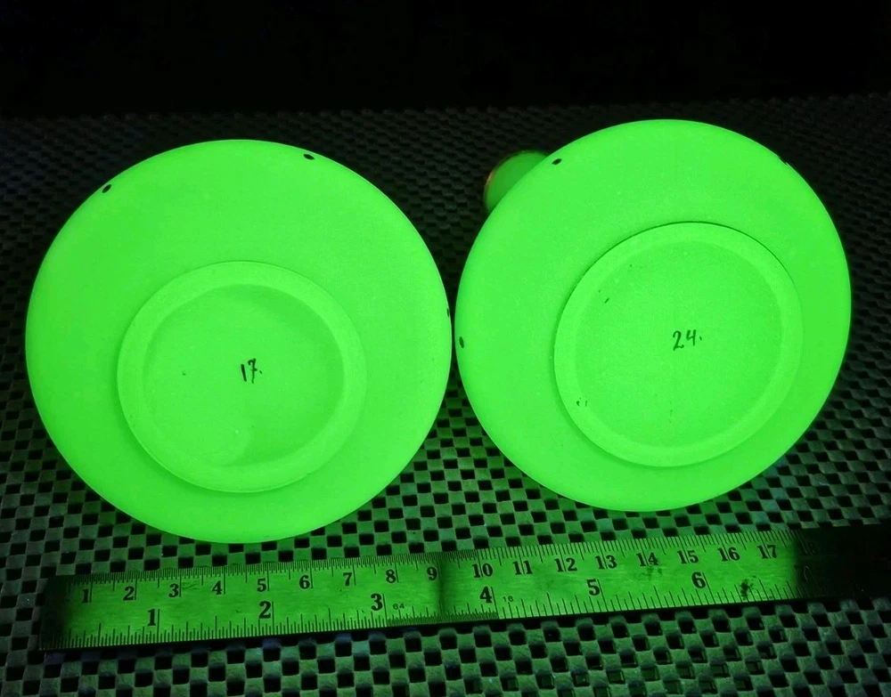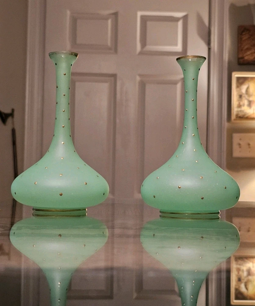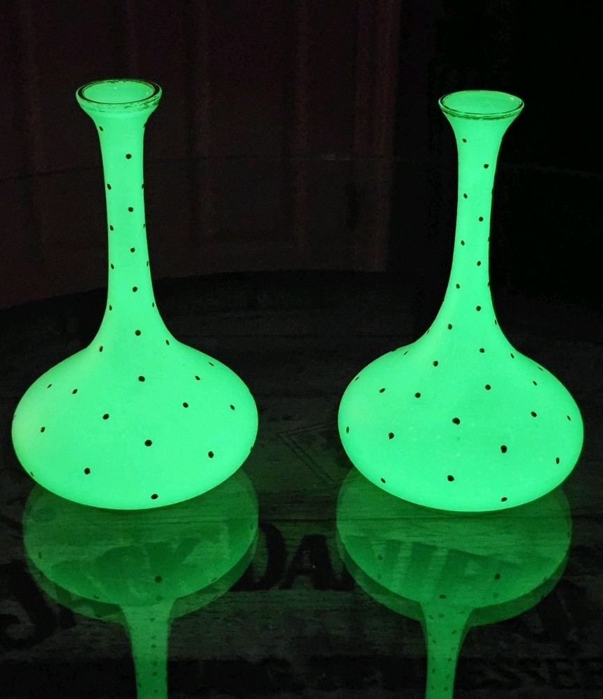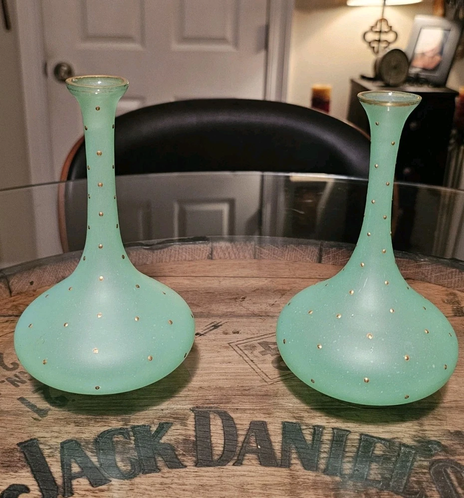 These are a gorgeous pair of early Victorian Jade opaline uranium glass gold gilt dotted patterns. They are in excellent condition with minor wear on the gold gilt around the top rim. There are no chips or cracks. They glow crazy under both 365nm and 395nm blacklights. There is a number on the bottom of each one. One has an 18, and the other has a 24. I have heard some people say they might be Baccarat. That would be good if they were, but if not, I think they are awesome. They have a great look, and I love that shape! If you have any questions, please ask.