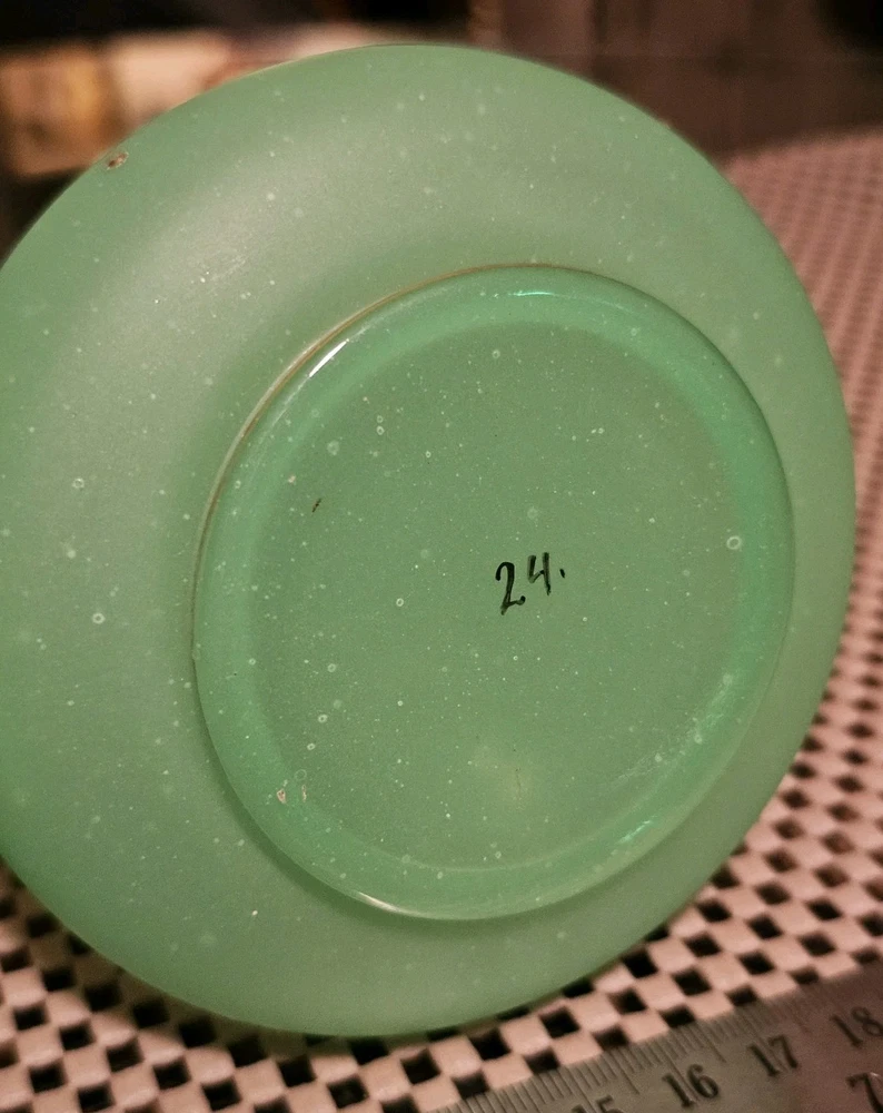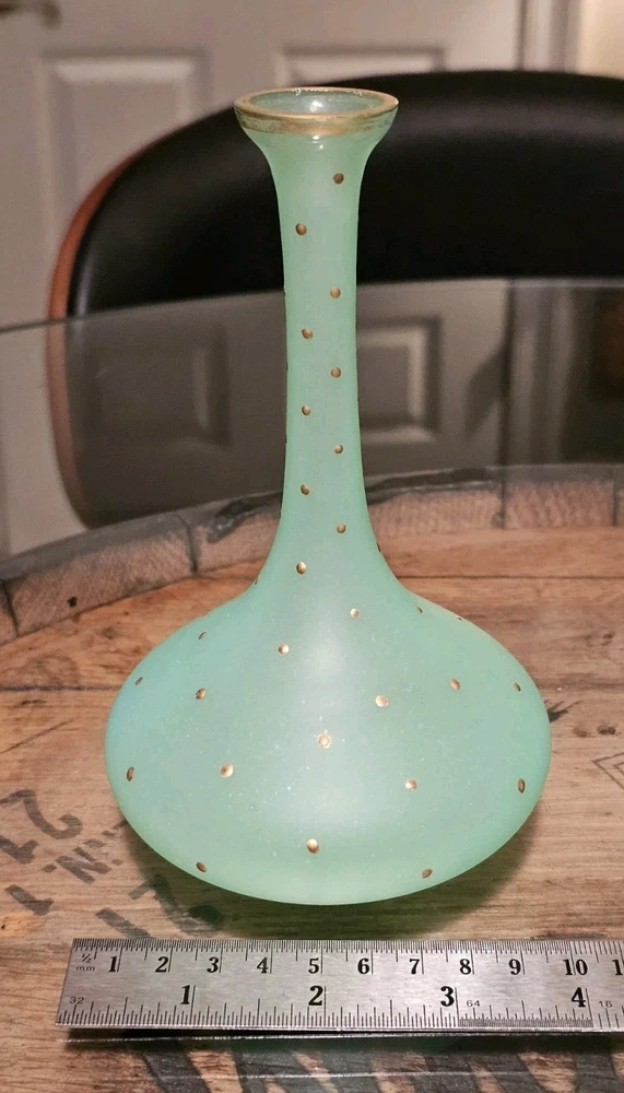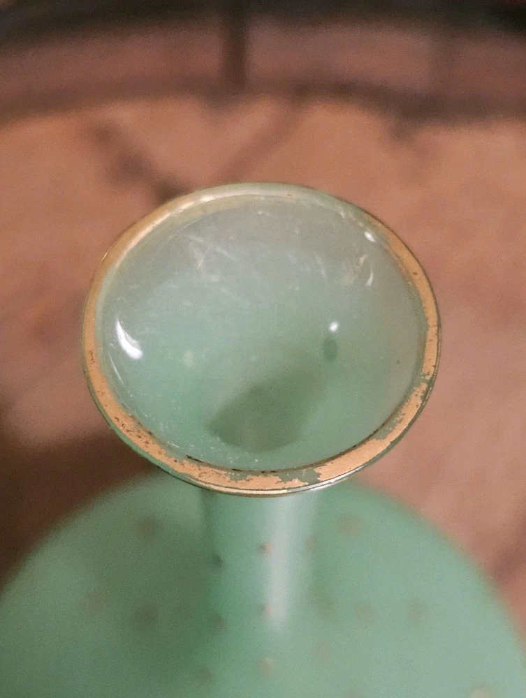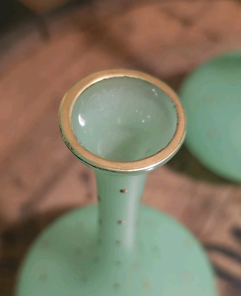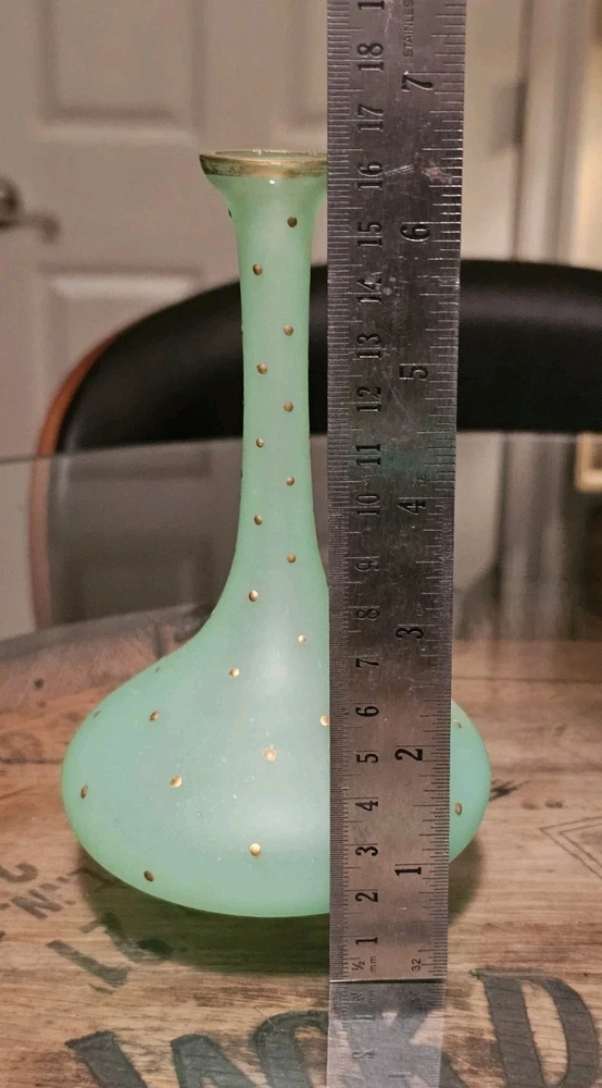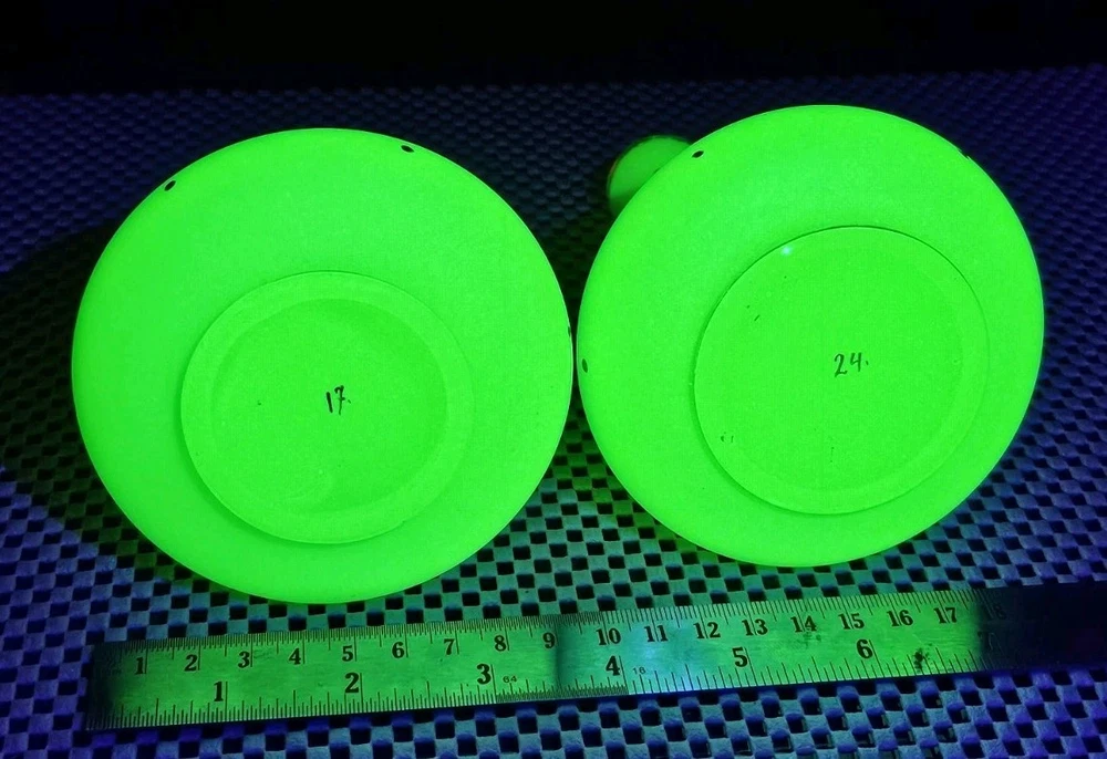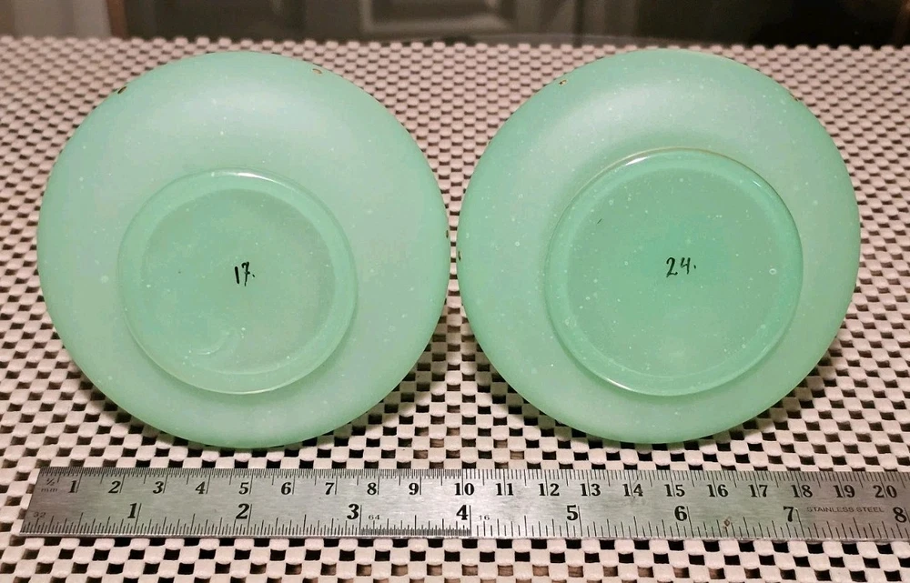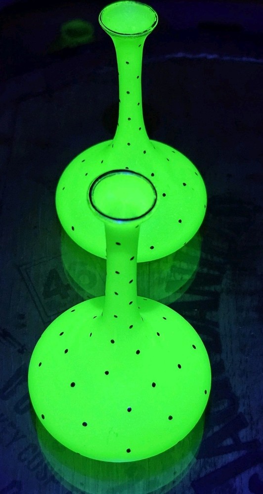 These are a gorgeous pair of early Victorian Jade opaline uranium glass gold gilt dotted patterns. They are in excellent condition with minor wear on the gold gilt around the top rim. There are no chips or cracks. They glow crazy under both 365nm and 395nm blacklights. There is a number on the bottom of each one. One has an 18, and the other has a 24. I have heard some people say they might be Baccarat. That would be good if they were, but if not, I think they are awesome. They have a great look, and I love that shape! If you have any questions, please ask.