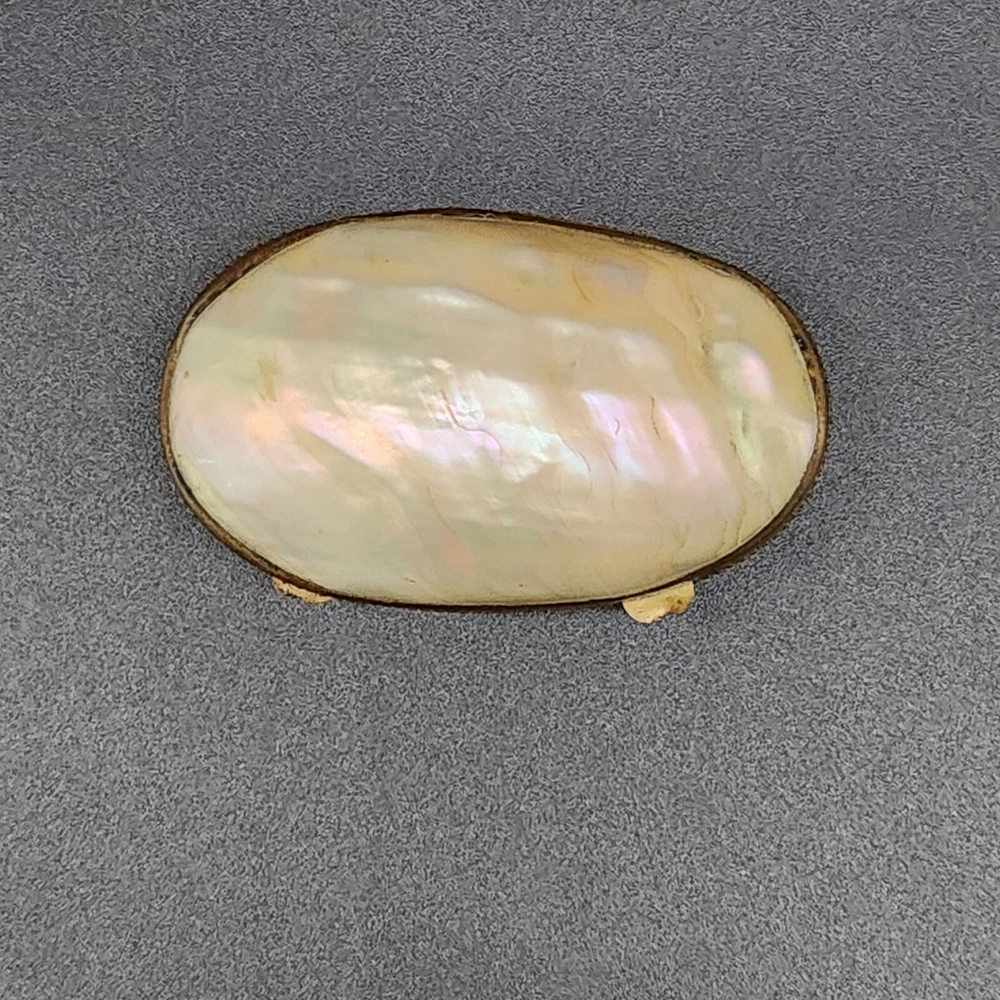 This exquisite antique pill/trinket box is crafted from lustrous mother of pearl, featuring a unique clamshell design and elegant metal trim. Its compact size makes it a functional and stylish addition to your collection, and its antique appeal adds a touch of sophistication to your personal items. • Clamshell design with metal trim • Antique age • Compact and portable • Height = 1.75 inches. Very good antique condition. One minor surface crack on the inside of the piece. The gilt ormolu has a very heavy patina. See photos for details.
