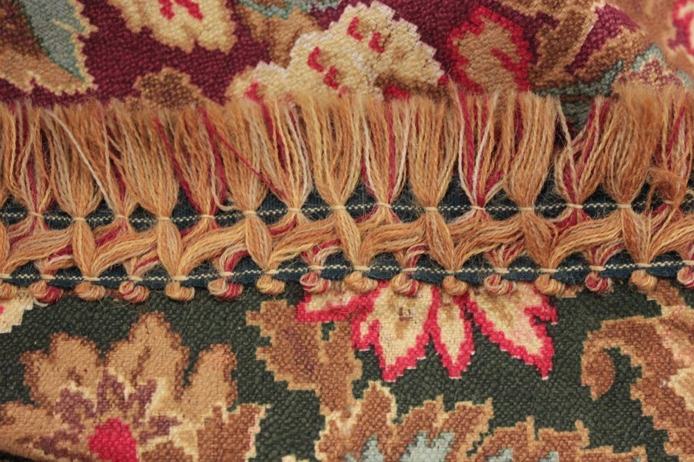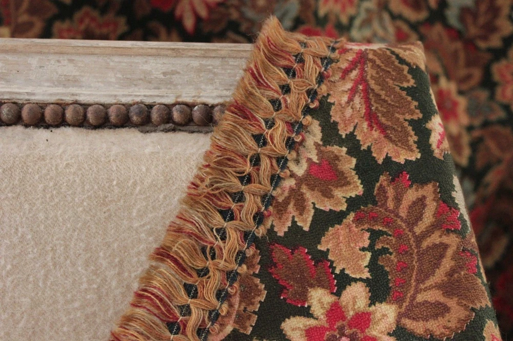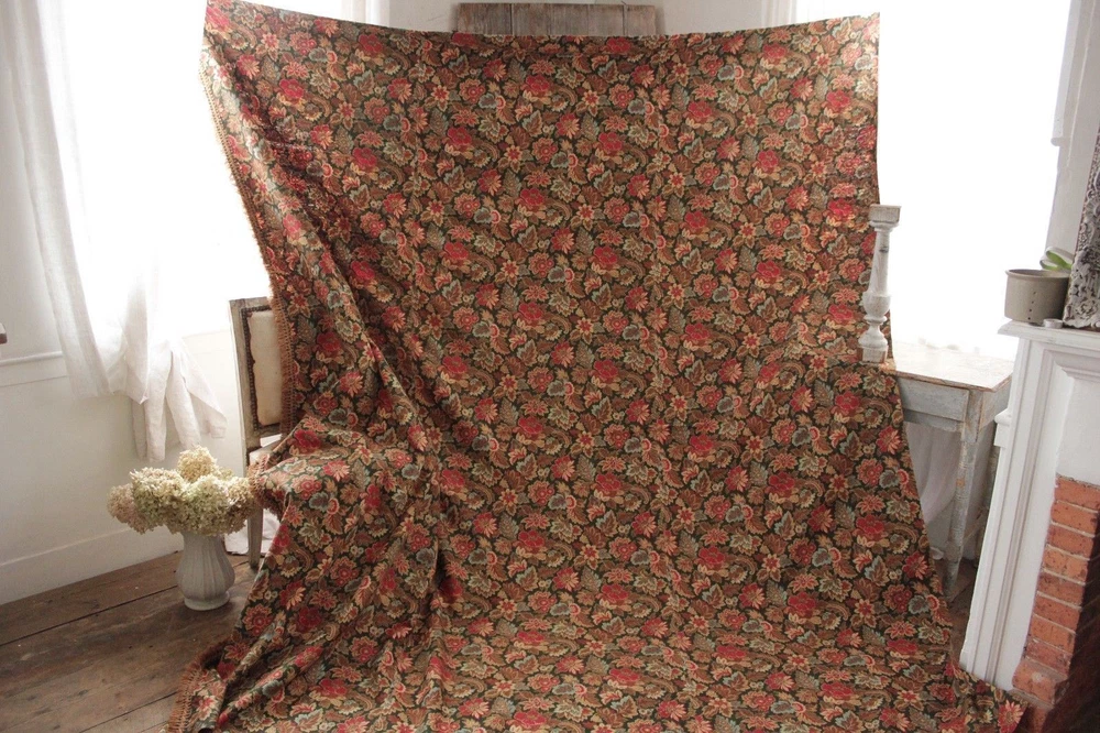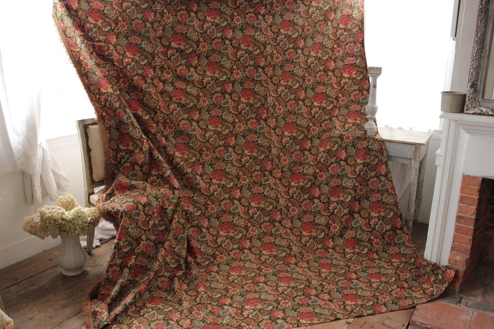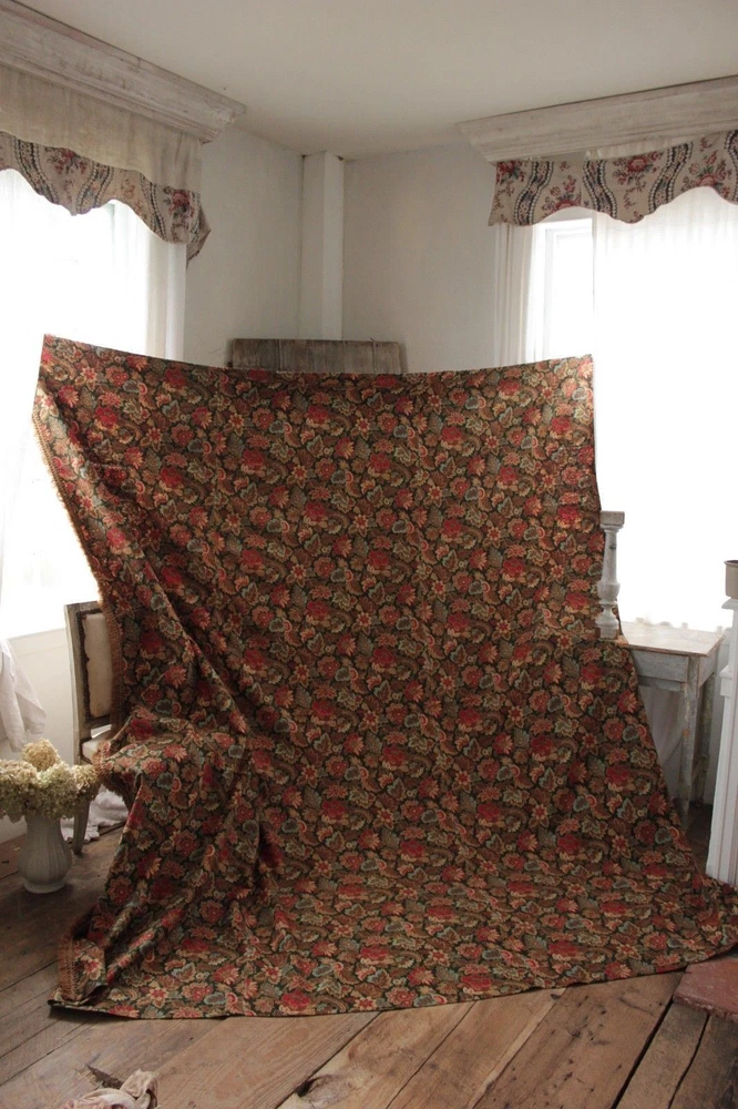 ~ *~Hello and thank you for looking~*~ ~Spectacular textile!! So wonderful ~*~ This wonderful textile comes from a large, 19th century French bedding set ~ ( please see my other textiles for matching pieces) this stunning piece is This piece dates c1880 and it is a bed curtain with original tiny rings for hanging still stitched to the top. The left facing side is trimmed with the original trim. This panel is constructed using 3 widths of this stunning fabric . The fabric is a heavy weight, cretonne weave ( thin warp, thick weft) cotton. GORGEOUS printed colors! This piece has a inky black ground with a green tint . Rather a charcoal green. The other colors include: brighter red, soft blue, browns ~ The back of this textile was printed to be seen also, and was printed with a lovely magenta purple ground tone!!! ( please see photograph 6, showing the back fabric tones) ~*~ This textile is 100% hand stitched ~ Lovely fringe trim!! ~*~ !! ~*~ ! ~ ( #98) MEASUREMENTS : This piece measures : 94 inches across and the drop is 107 inches long ~ ! enormous! ~*~ CONDITION : This length is in as found, not freshly laundered condition with light storage dust ~ ~ Some of the pieces in this set have pale bleeds in the fabric, therefore to be on the safe side, this textile should not be water washed . STUNNING stunning condition. ~*~ Listing and template services provided by inkFrog