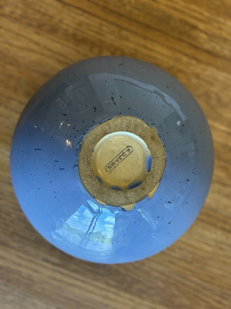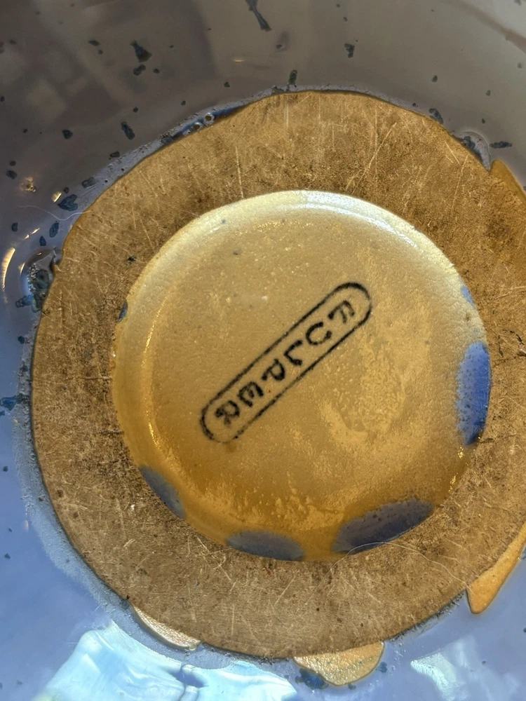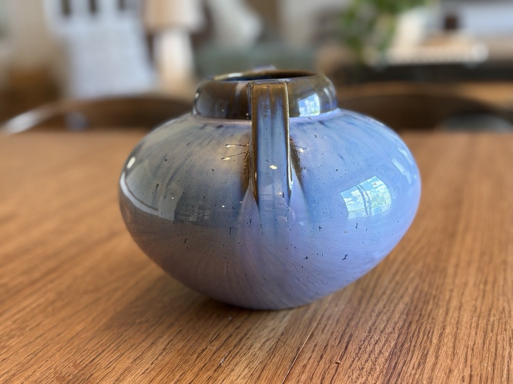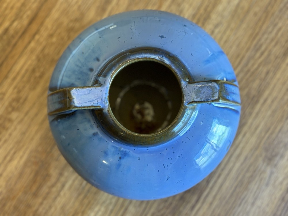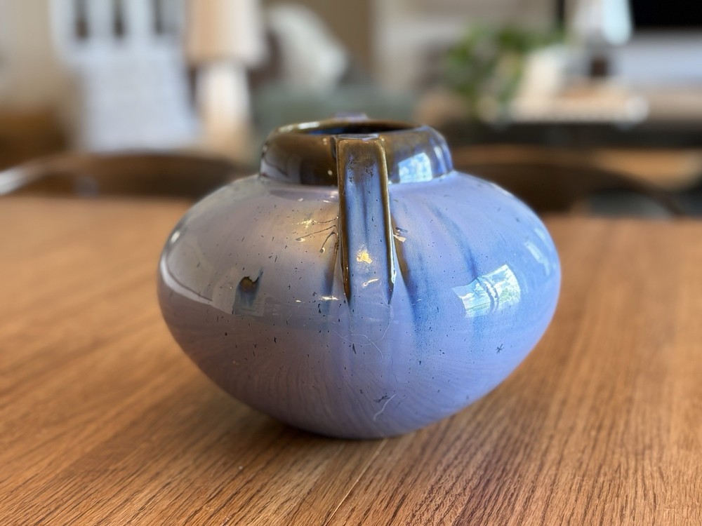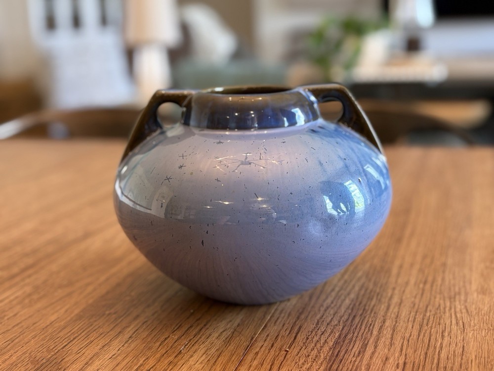 The Antique Fulper Pottery Flambe Glazed Two Handled Vase is a stunning piece of North American stoneware, featuring a beautiful blue and brown tone color with a glossy finish. Handmade in the United States during the 1920s, this vase is a perfect example of the Arts & Crafts/Mission Style, with a unique flambe glaze adding to its charm. With a height of 6 inches and a width of 8 inches, this Fulper Pottery vase is a rare and exquisite addition to any art pottery collection.
