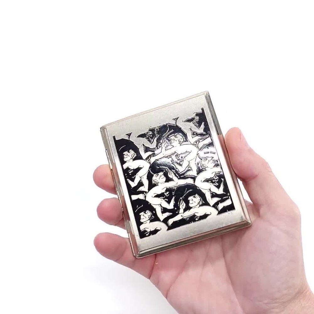 Antique German Made Cigarette Case. A symbol of Status and style. The case has a very intriguing repetitive image on the front. Very Esher esk and erotic. What a great gift this would make to right person.. The case measures 3.75" x 3.25" x .5"
